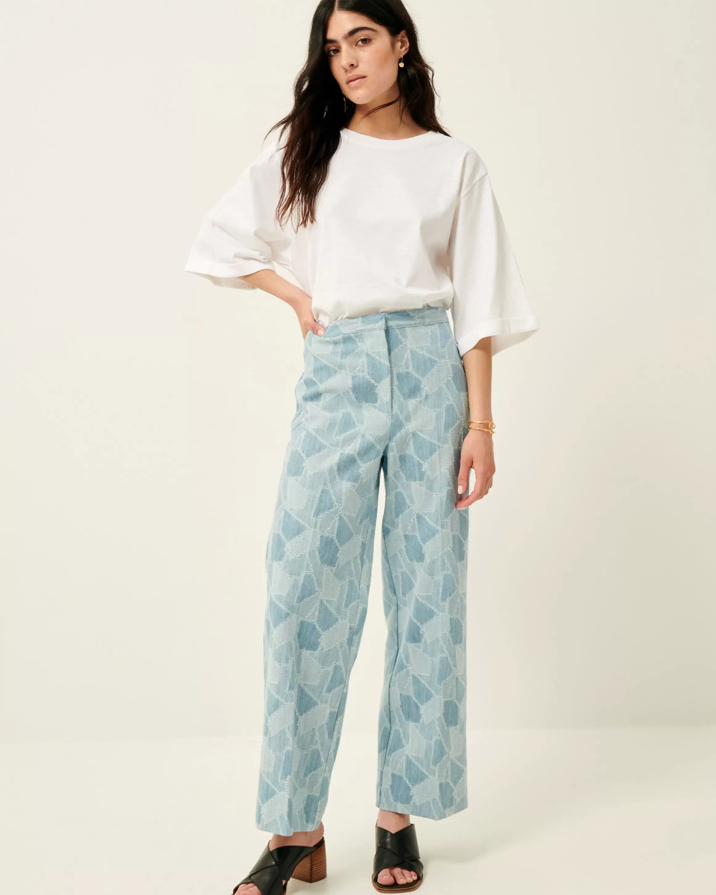 Pantalon droit à plis marqués en patchwork de denims stonewashés tissés en Italie.Natalia mesure 1m70 et porte du 36…