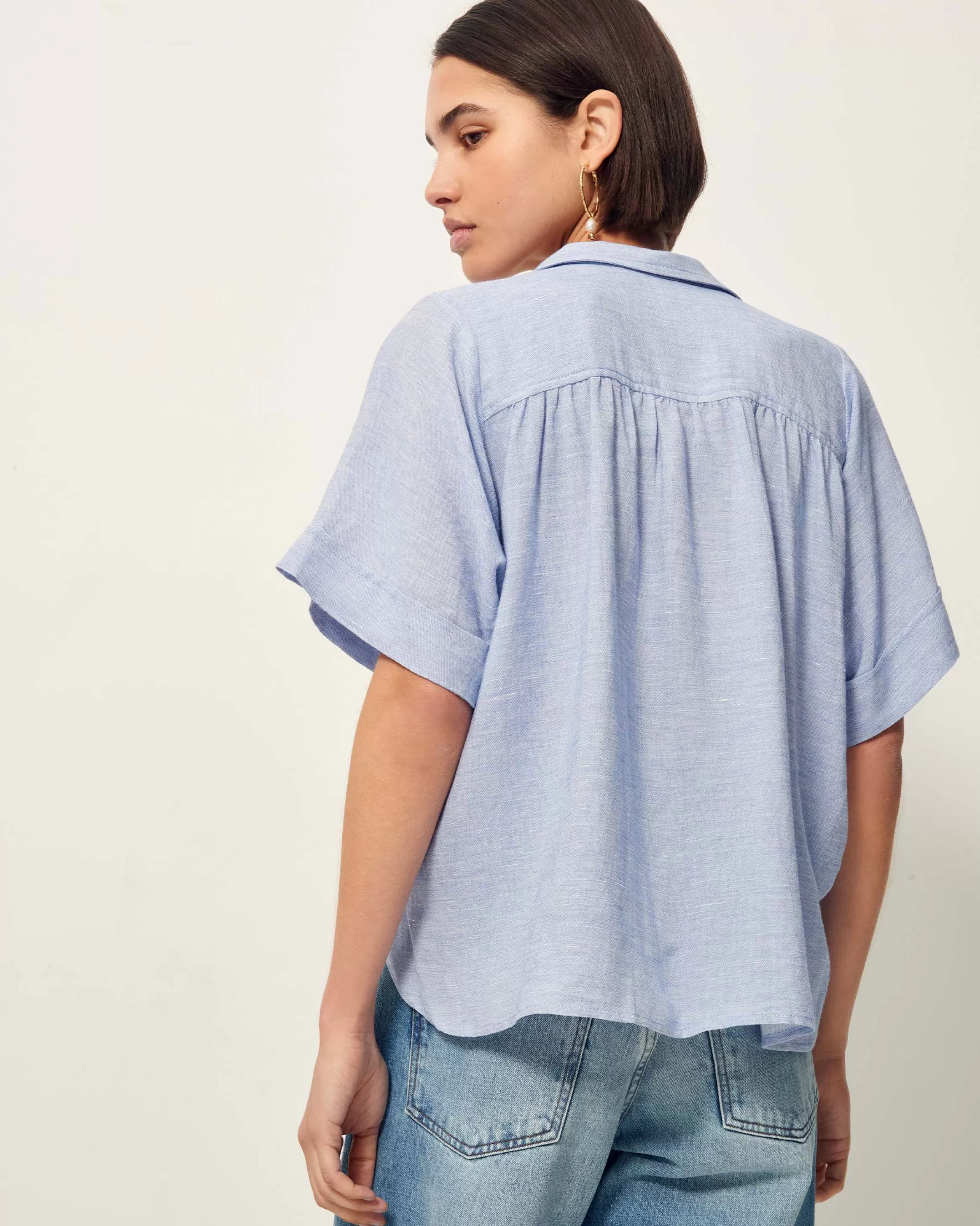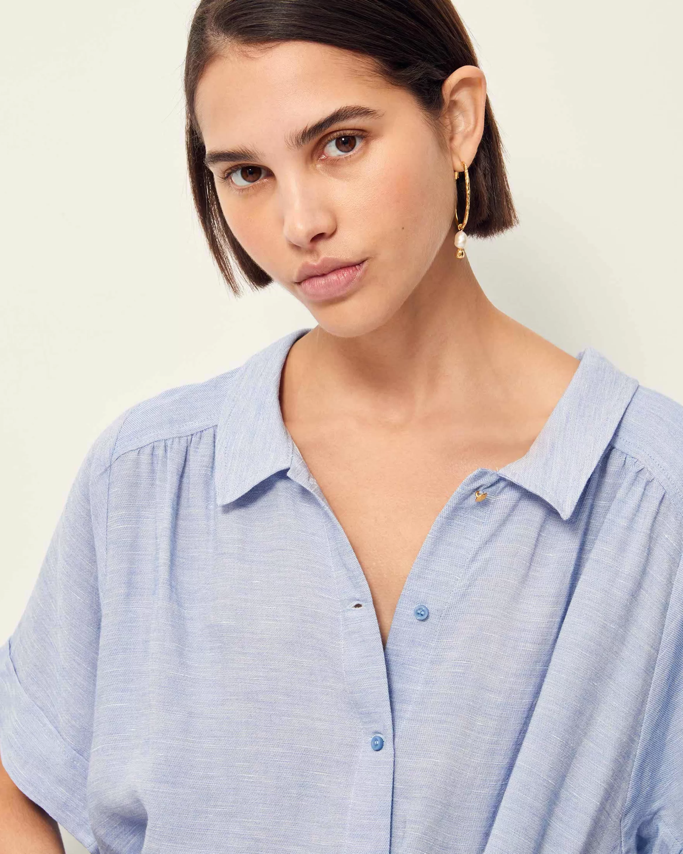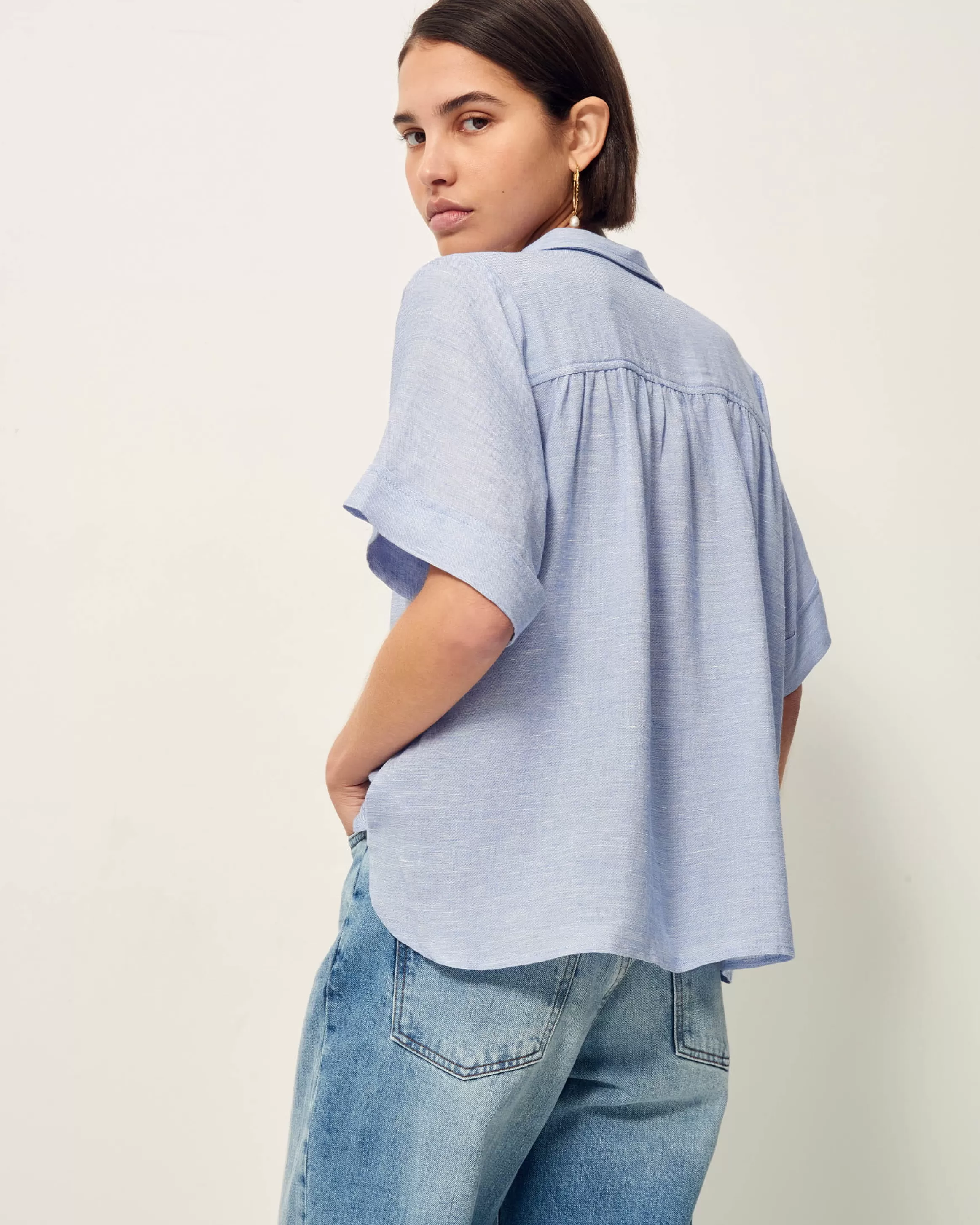 Chemise estivale froncée à manches courtes en toile oxford fluide et légère effet chambray tissée en Italie.