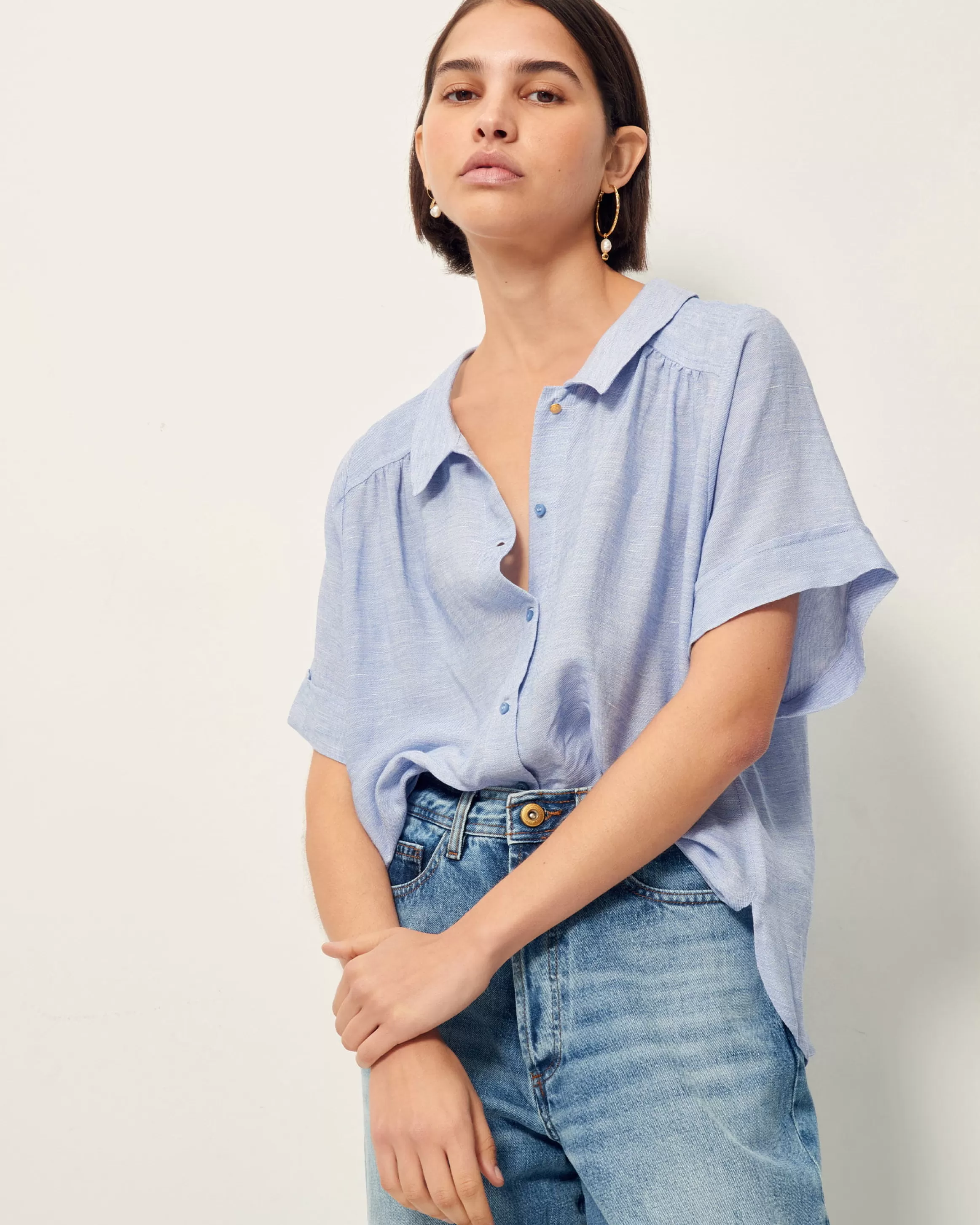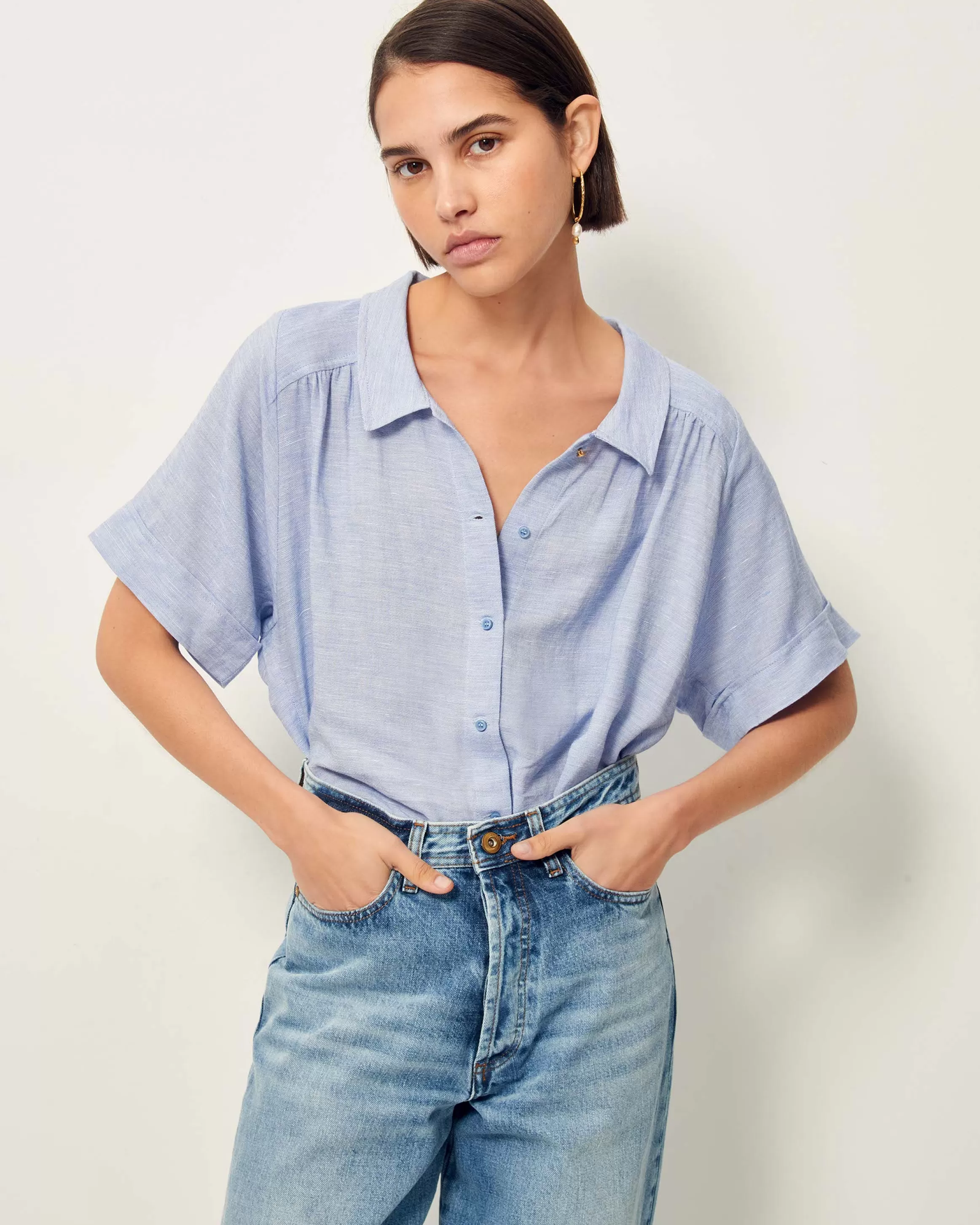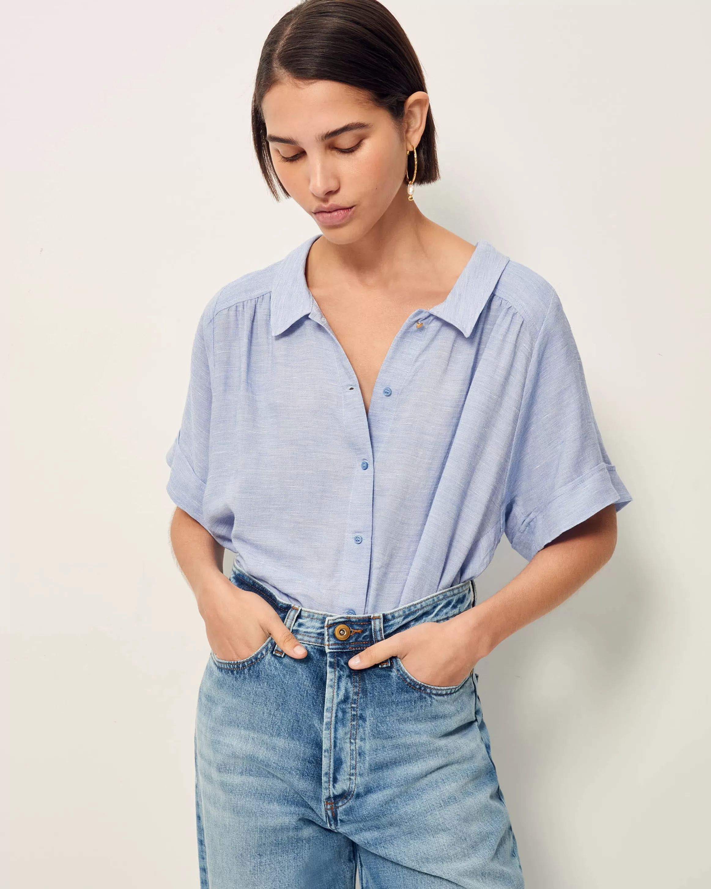 Chemise estivale froncée à manches courtes en toile oxford fluide et légère effet chambray tissée en Italie.