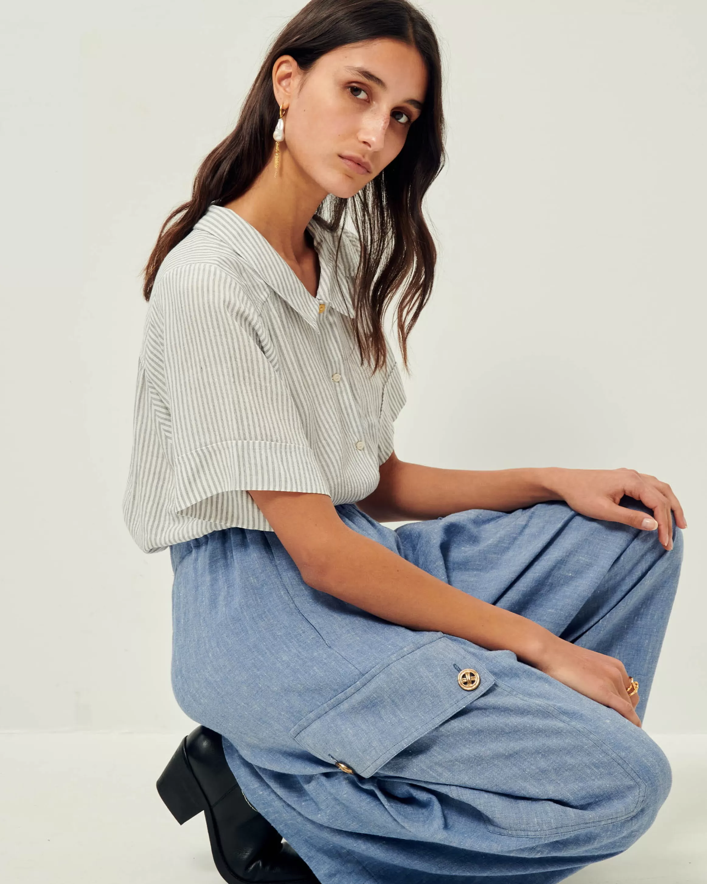 Chemise estivale froncée à manches courtes en toile oxford fluide et légère effet chambray tissée en Italie.