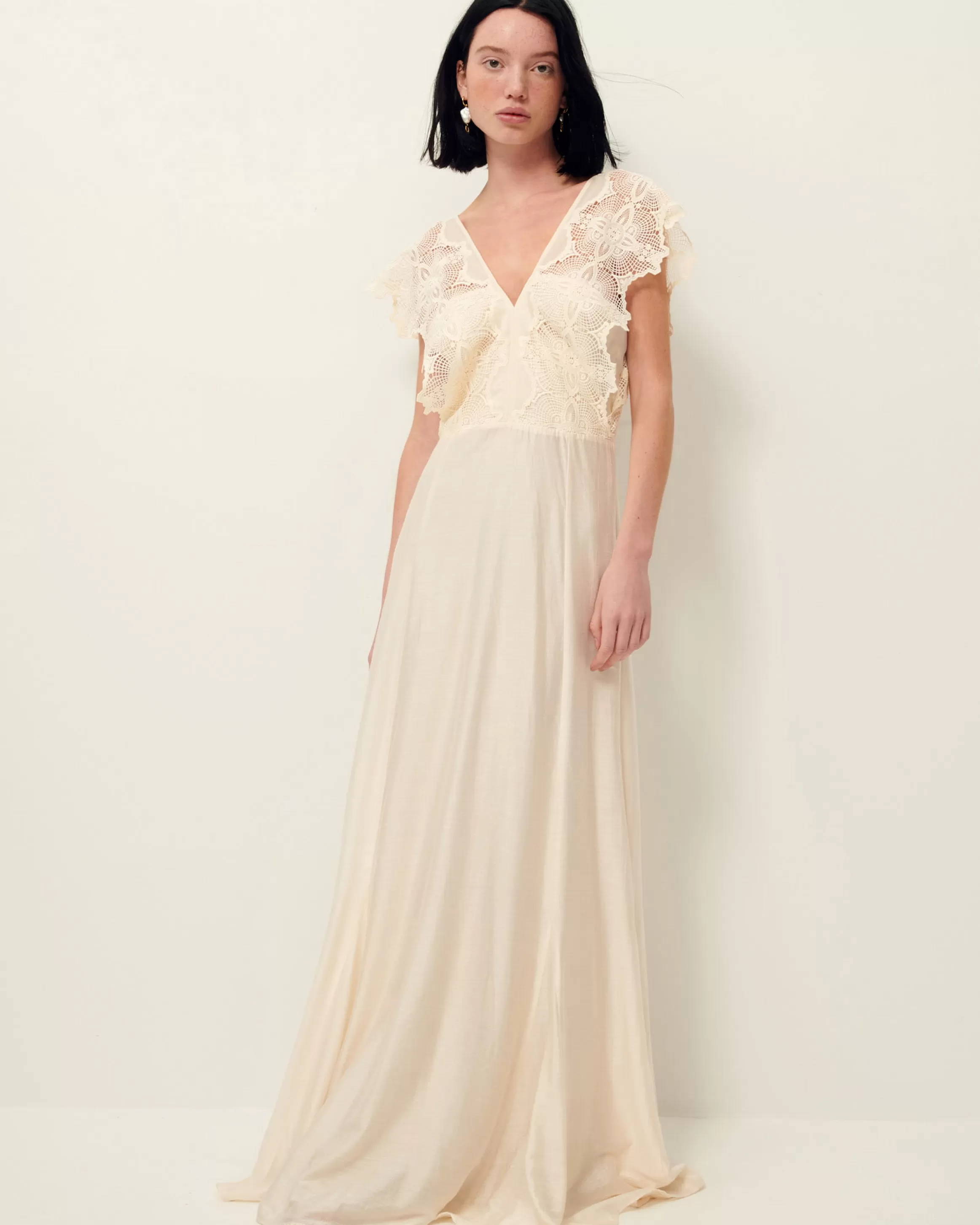 Robe longue sans manches en voilage fantaisie tissé en Allemagne et haut en galons de dentelle.EXCLU WEBIlona mesure 1m…