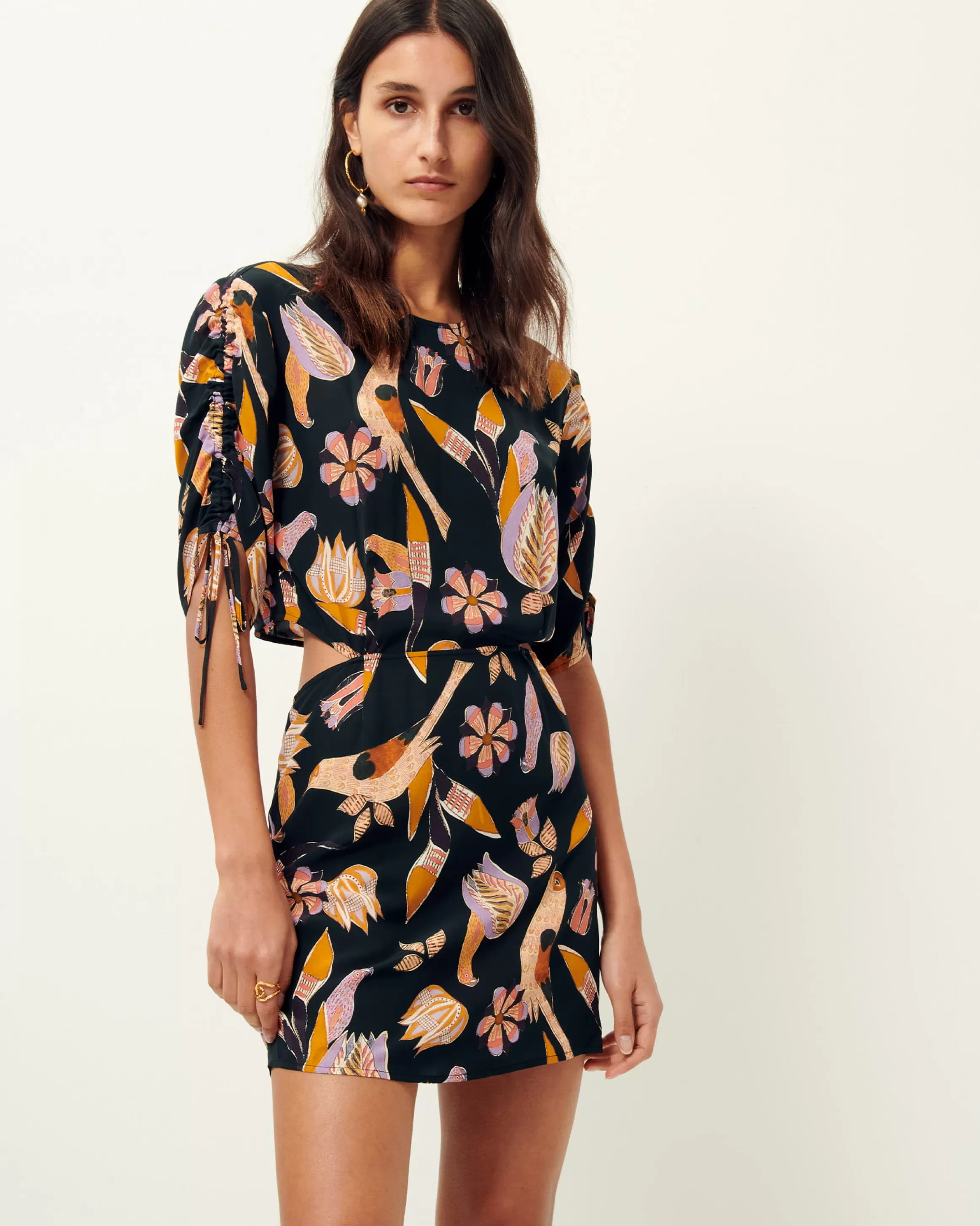 Robe courte ouverte au dos en toile de viscose fluide et aérienne imprimée, motif exclusif Sessùn.
