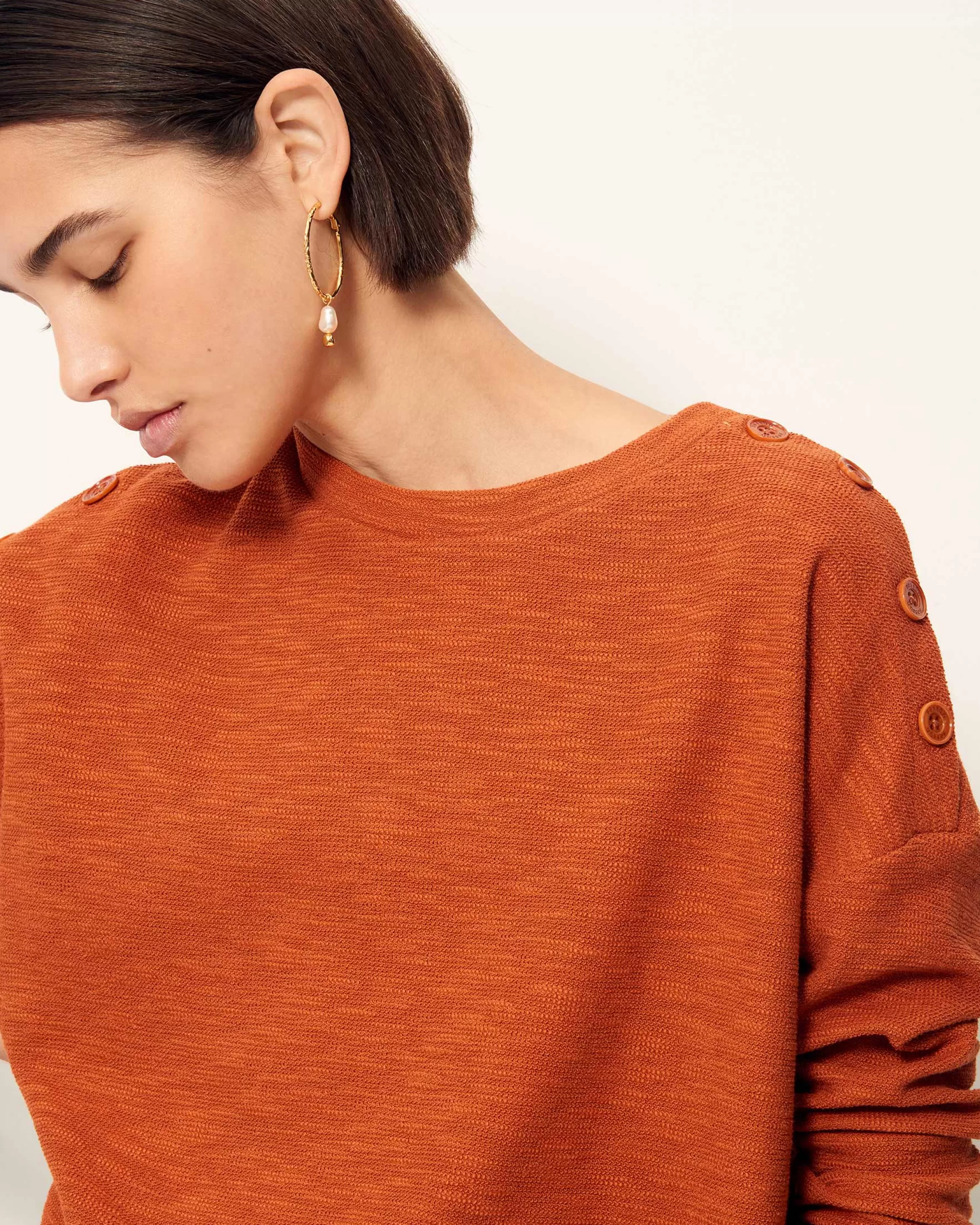T-shirt manches longues avec patte de boutonnage à l’épaule en molleton fin de fil irrégulier flammé.