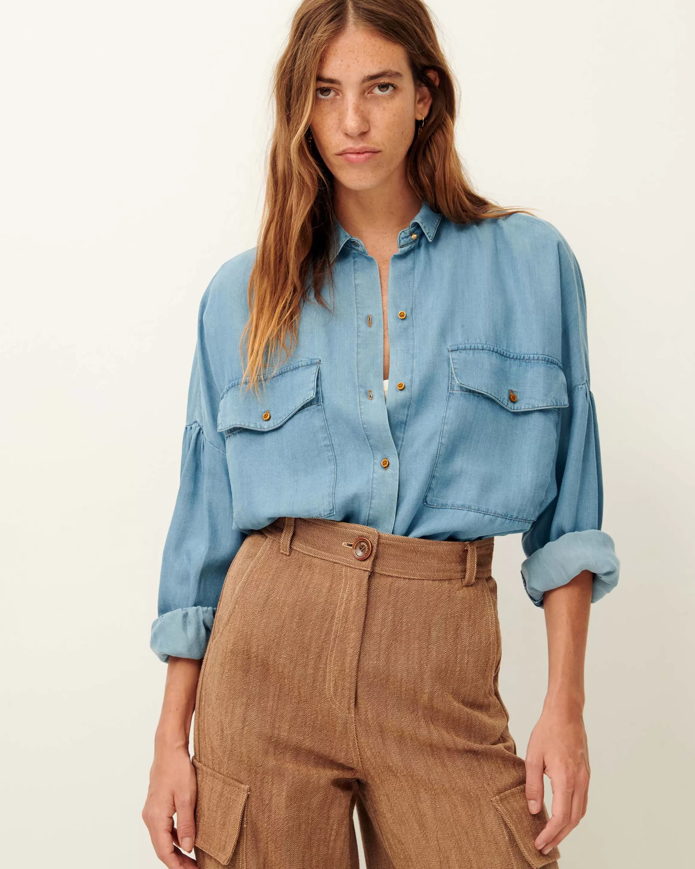 Chemise ample en chambray délavé, tissé en Espagne.
