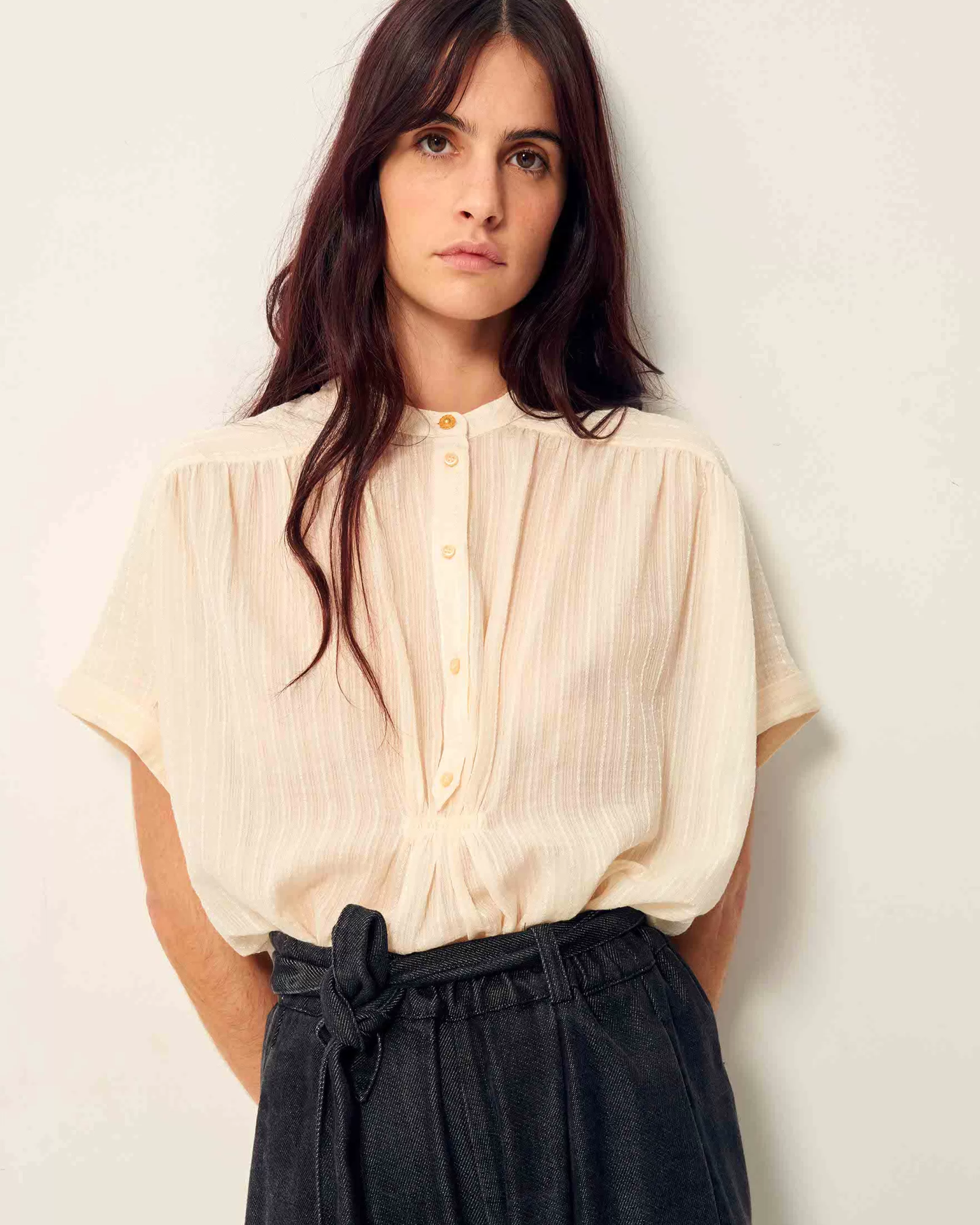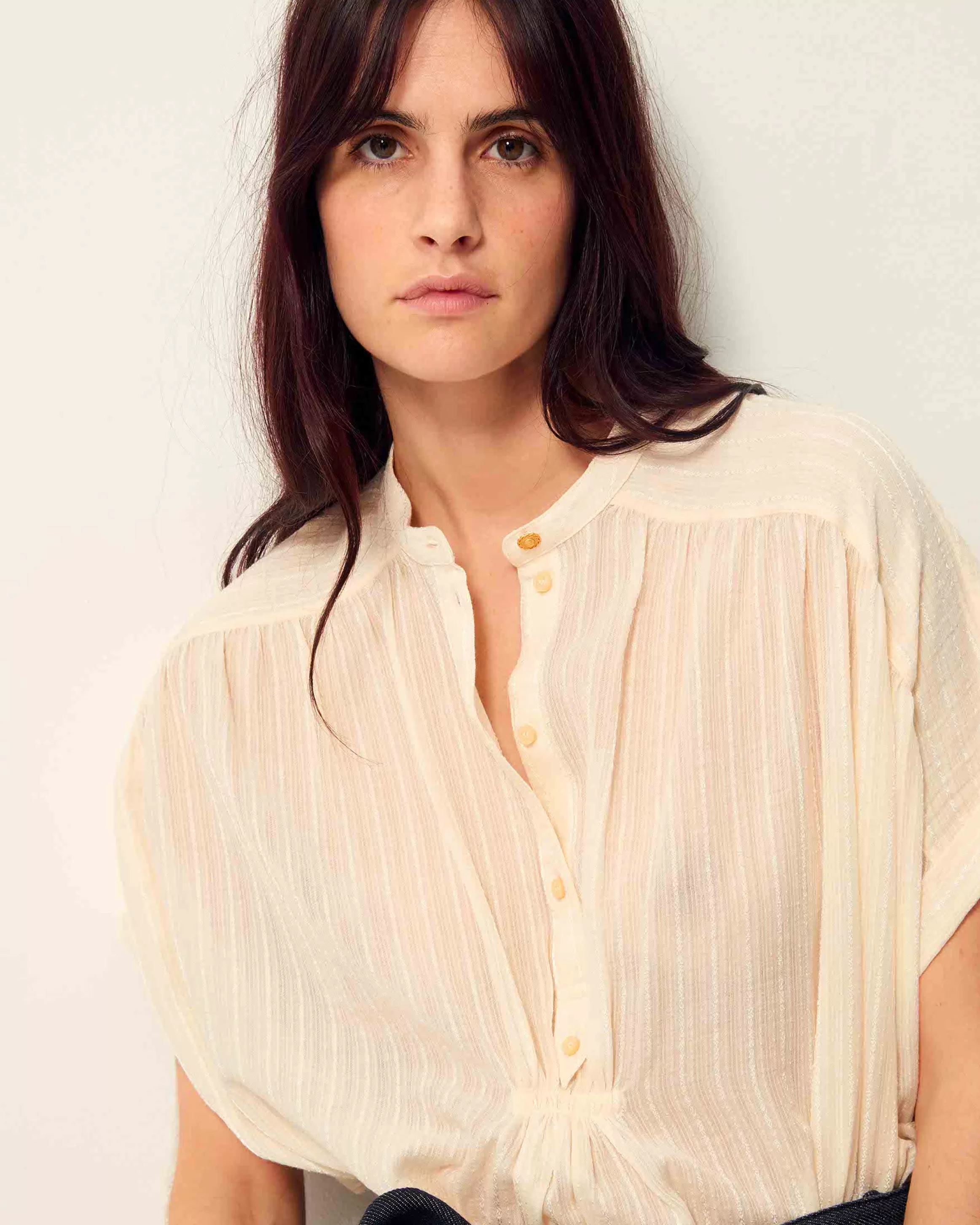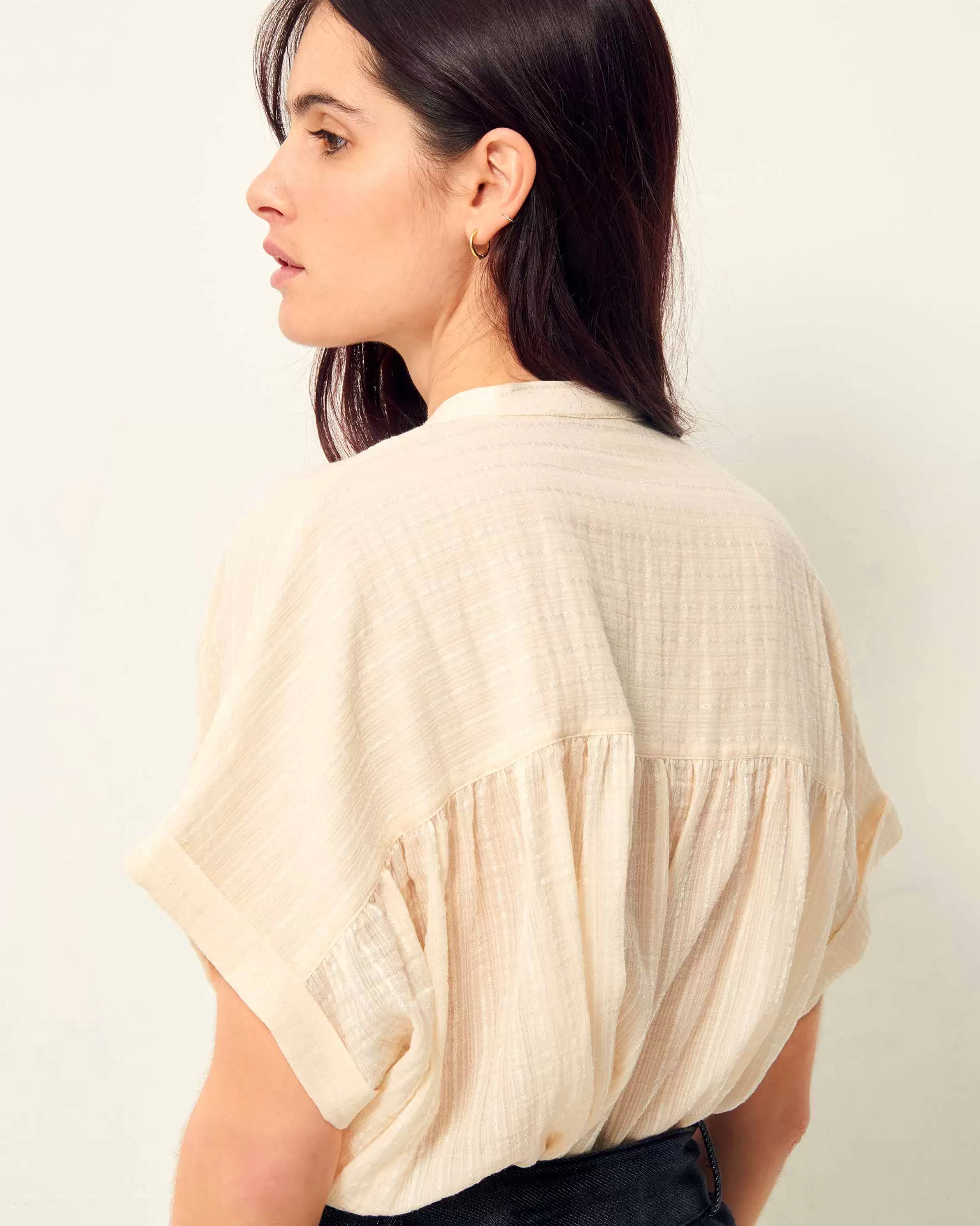 Chemisier manches courtes froncé en linon antique à fines rayures jacquard tissé en France, exclusif Sessùn.