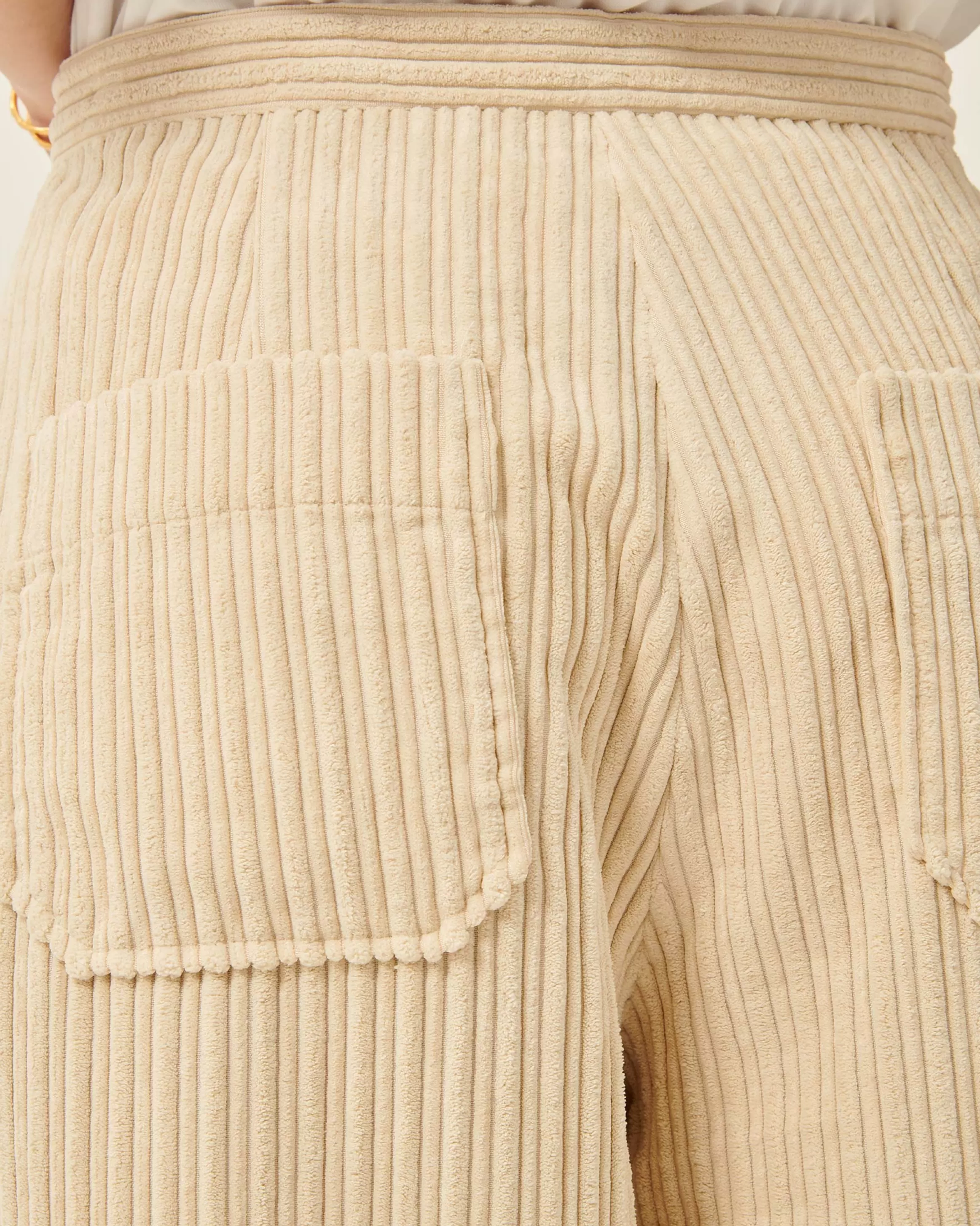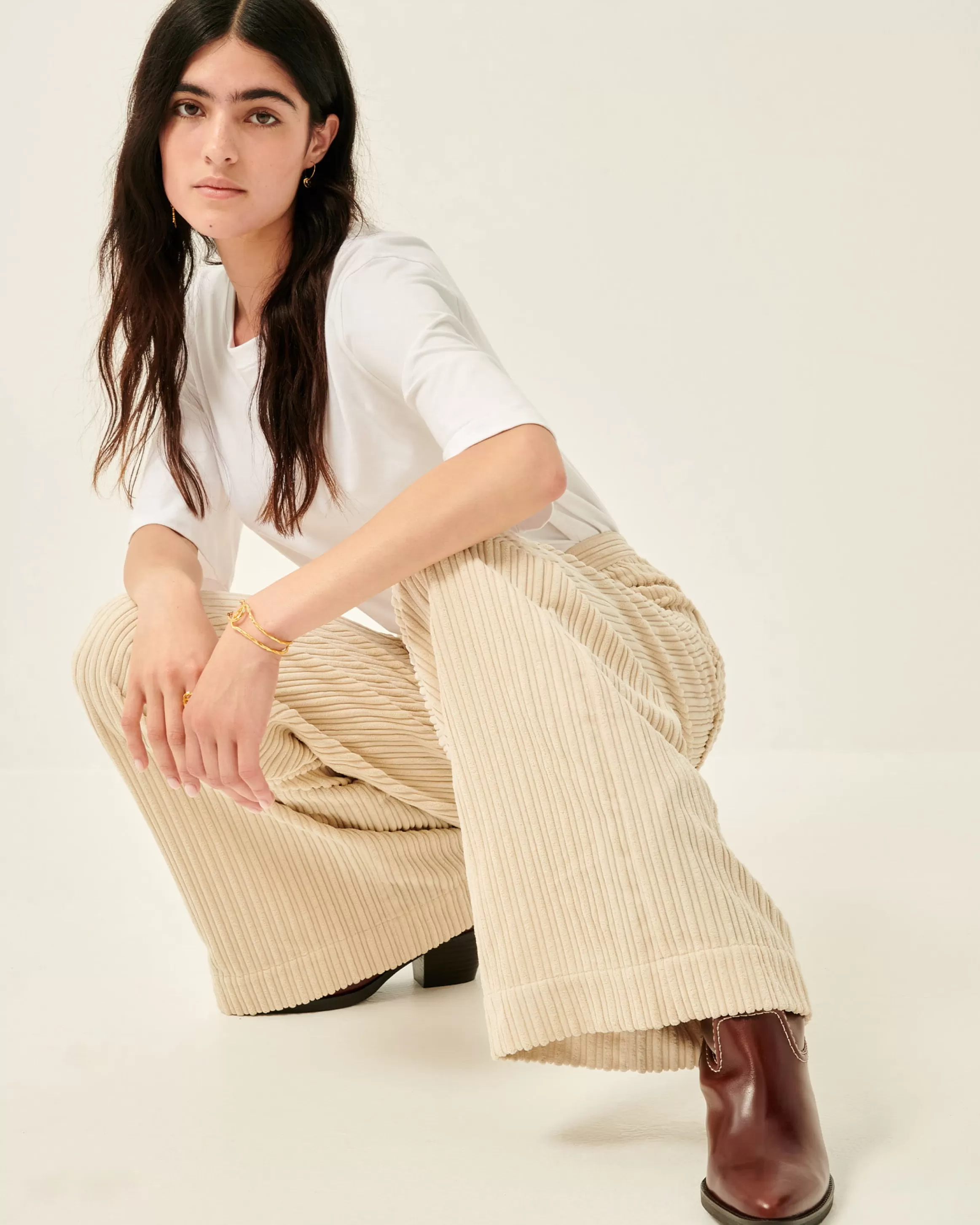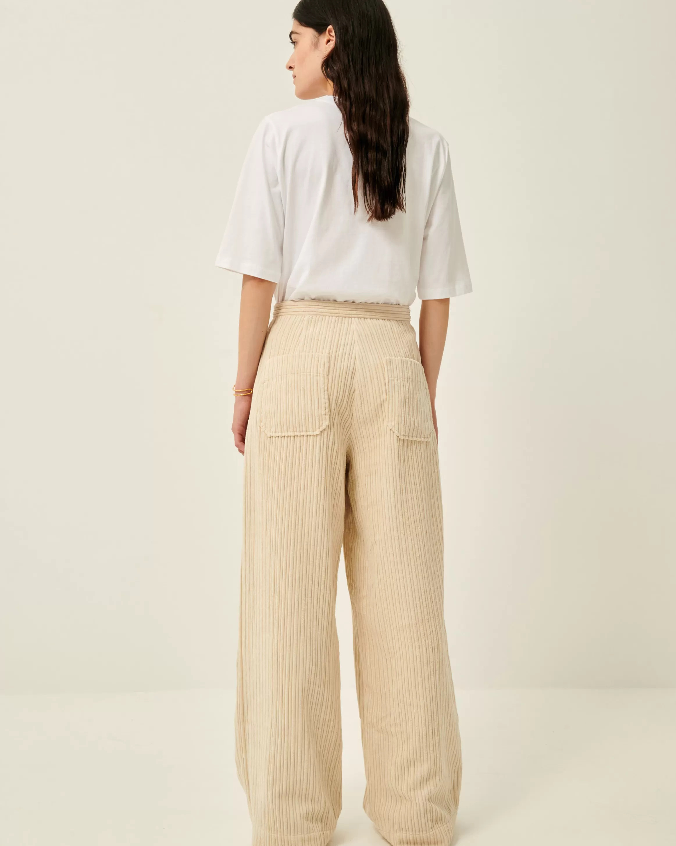 Pantalon évasé taille haute en velours côtelé à côtes irrégulières.