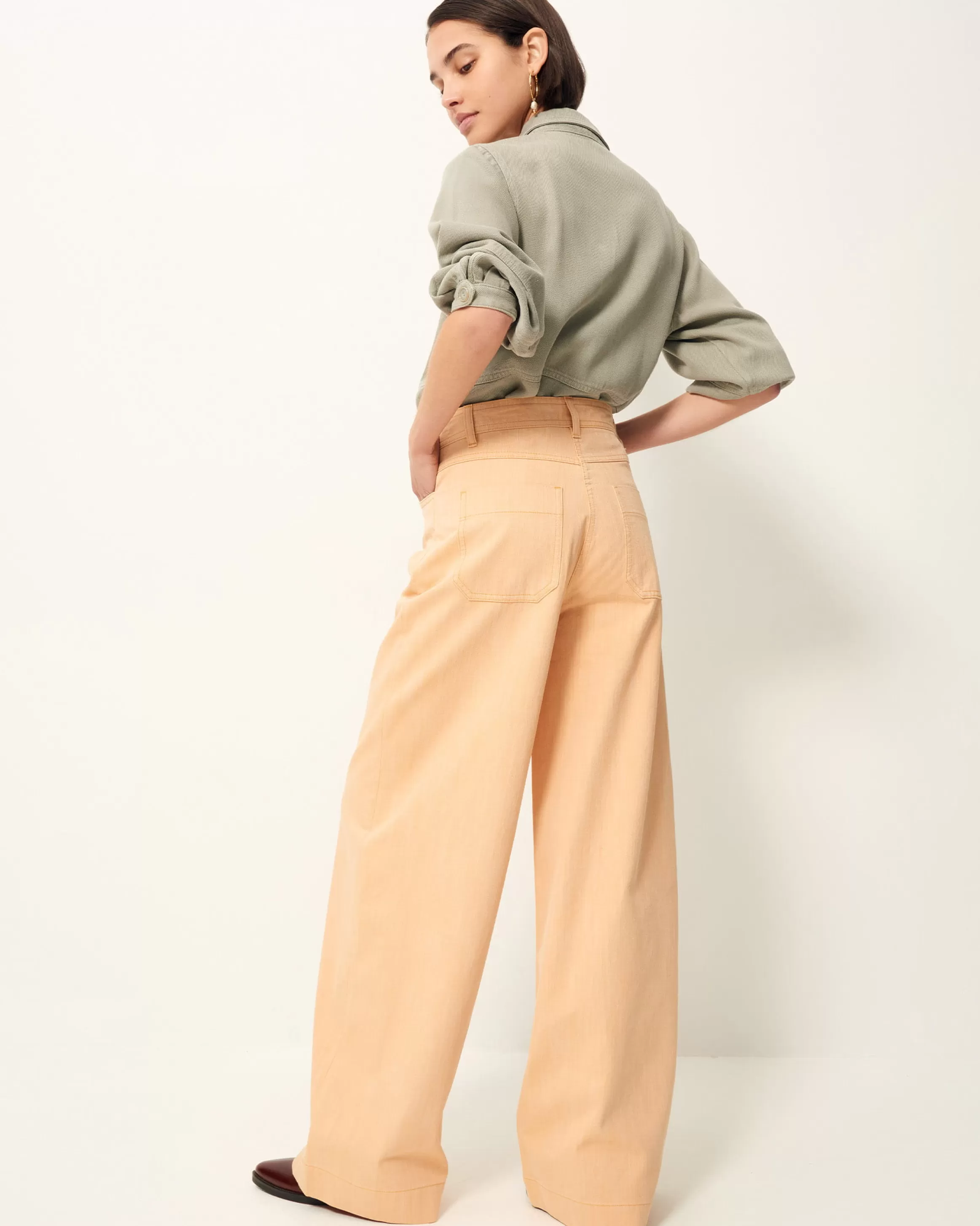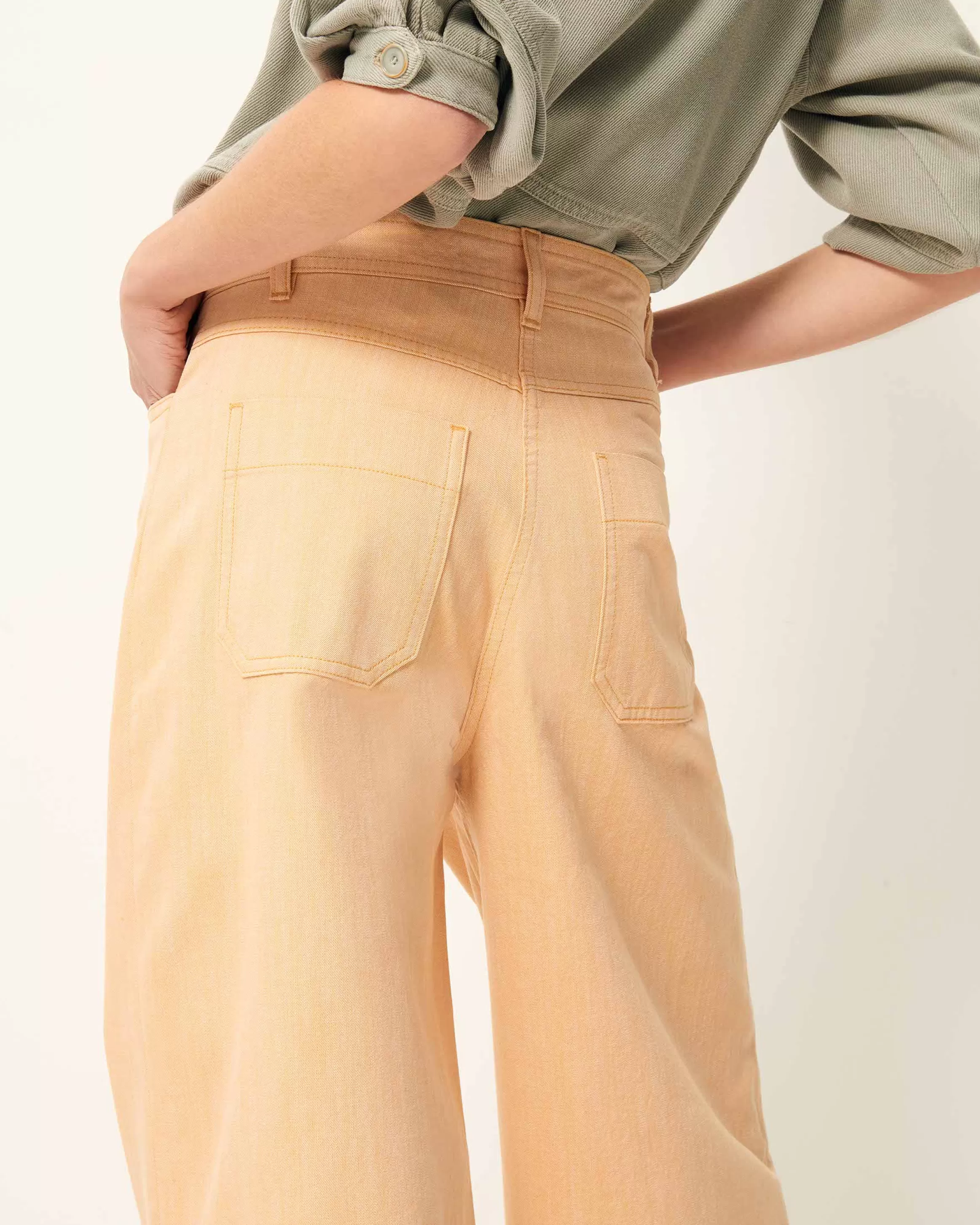 Pantalon évasé, taille haute, en sergé esprit denim chambray coloré, stonewashé, tissé en Italie.