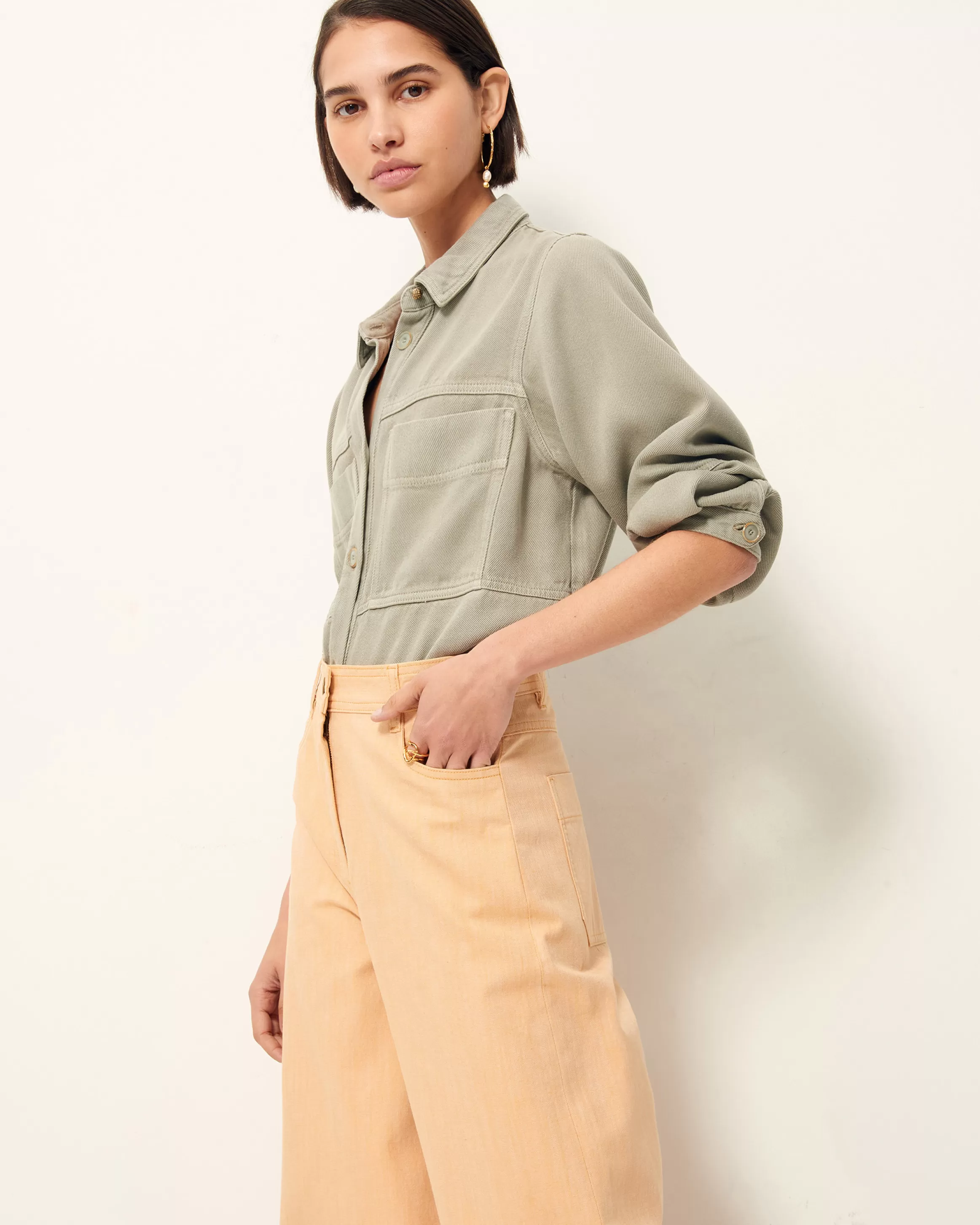 Pantalon évasé, taille haute, en sergé esprit denim chambray coloré, stonewashé, tissé en Italie.Lala mesure 1m73 …