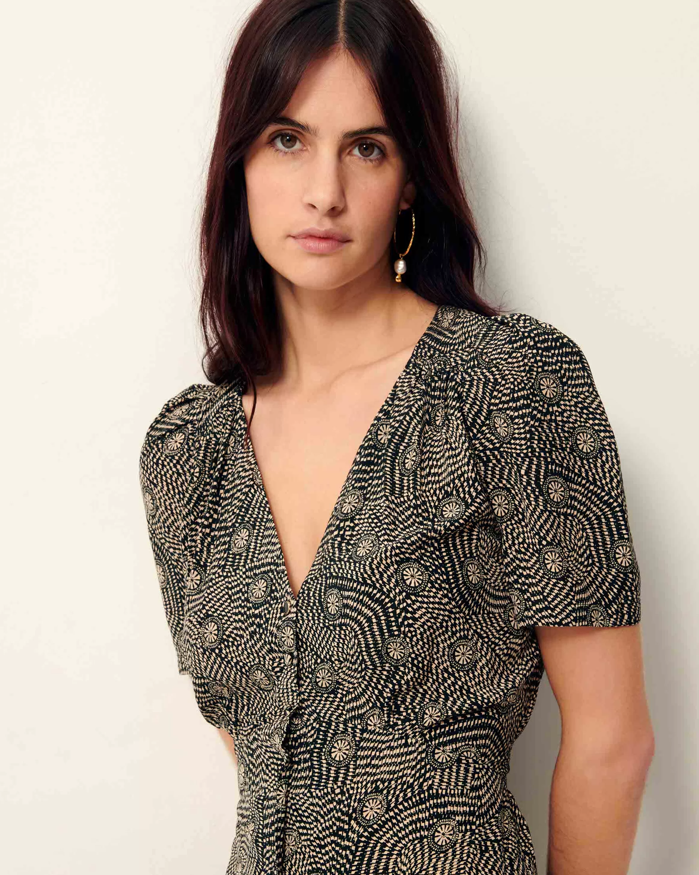 Robe courte boutonnée en toile de viscose fluide et aérienne imprimée, motif exclusif Sessùn.
