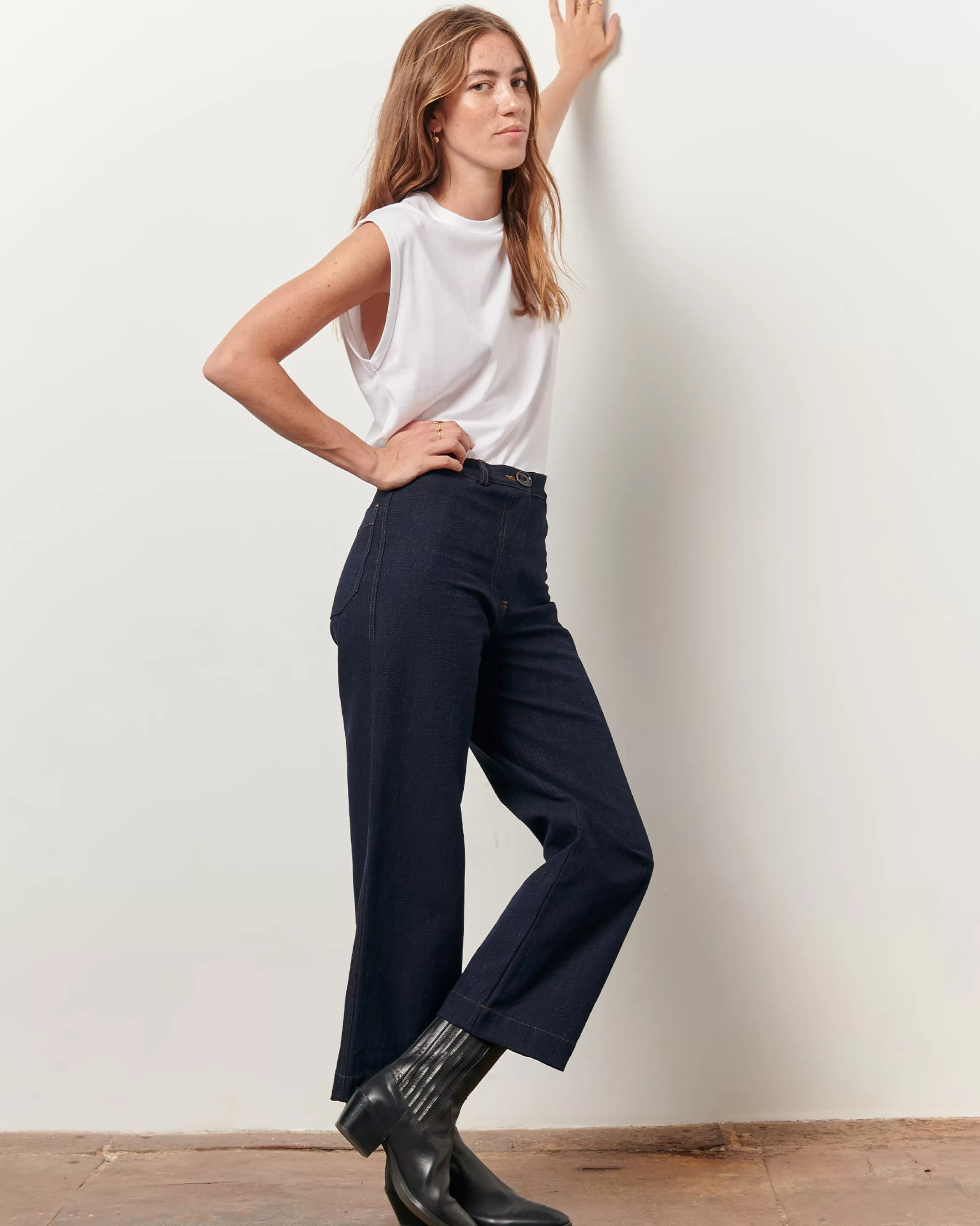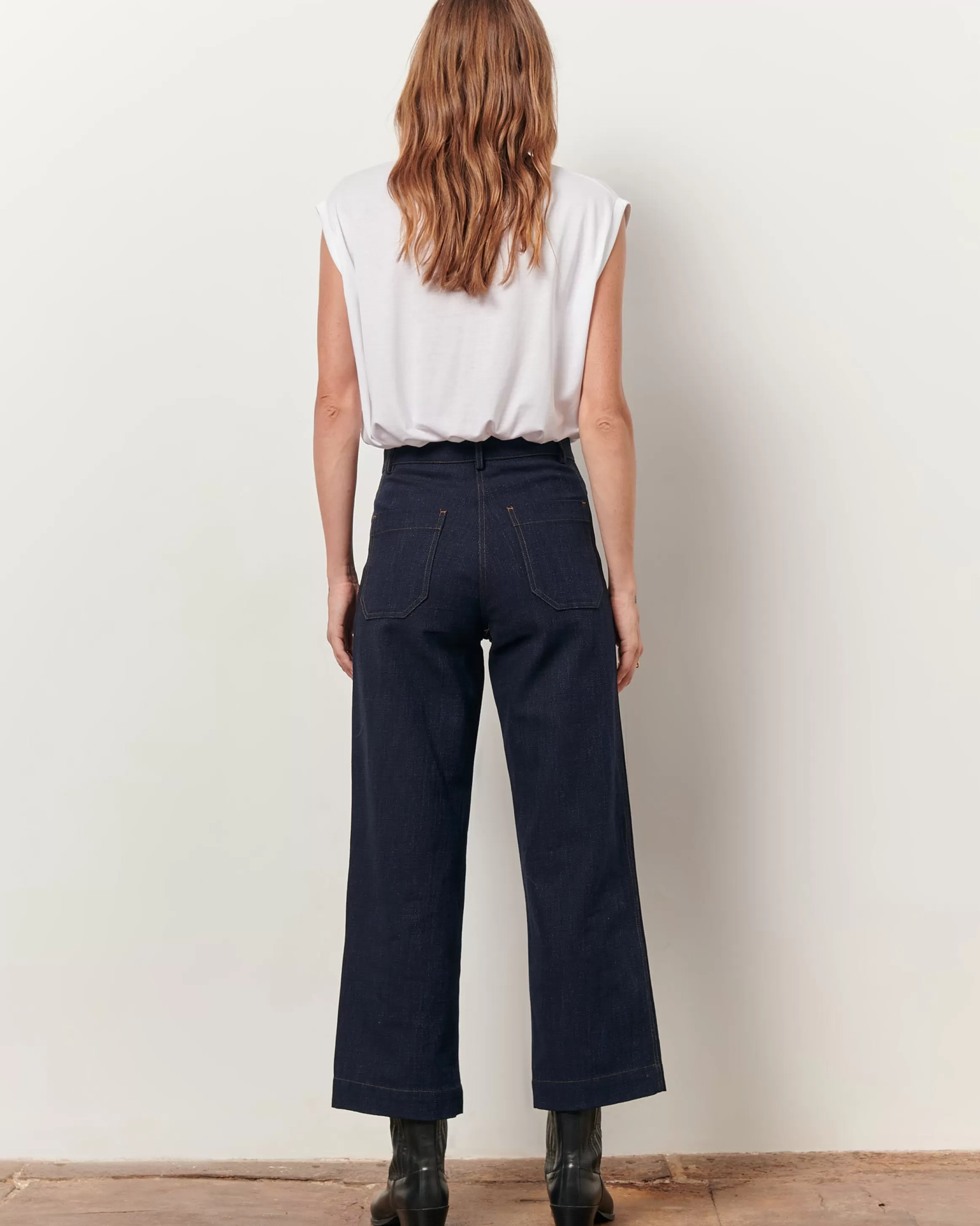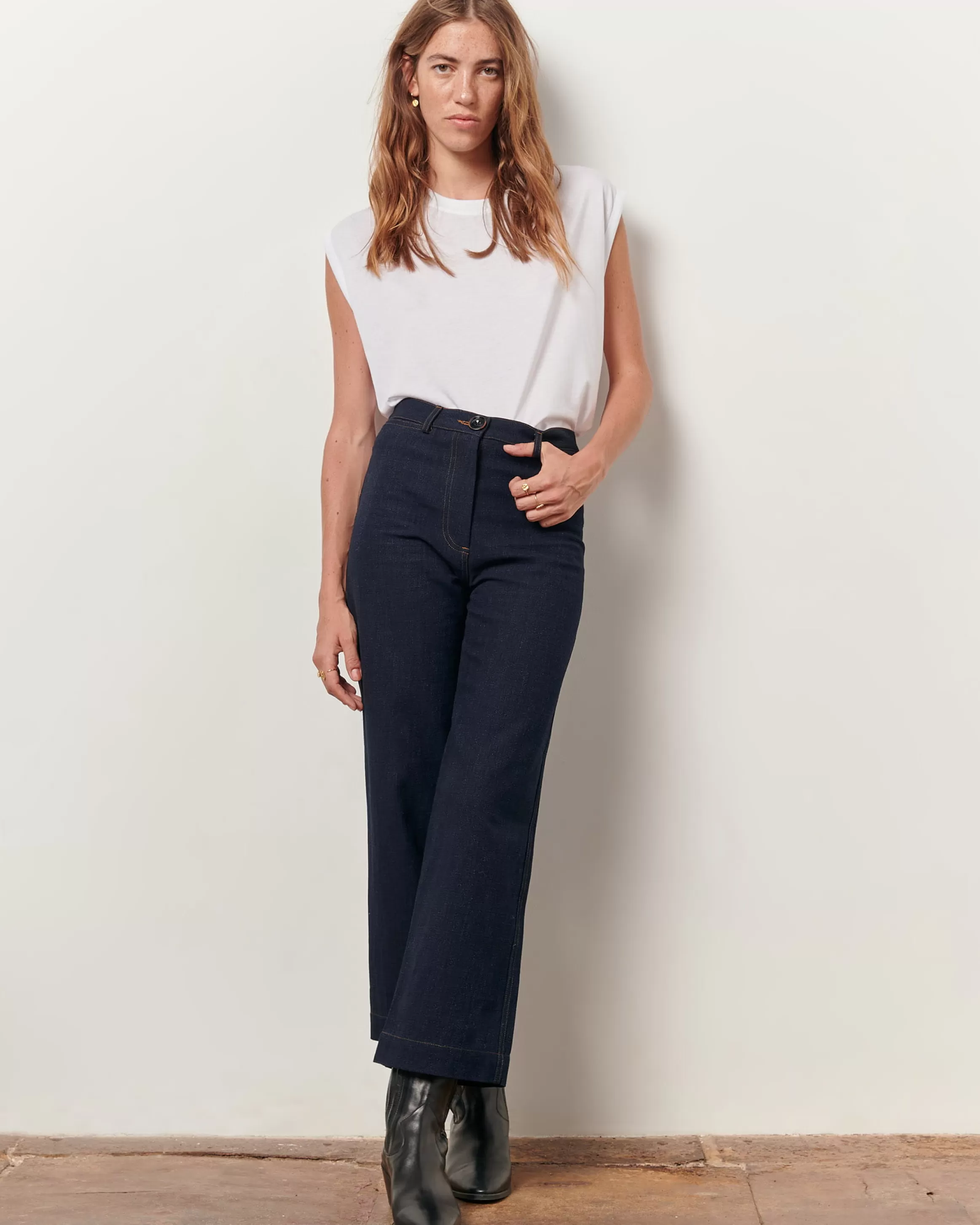 Pantalon esprit 70’s taille haute en denim indigo tissé en Italie.
