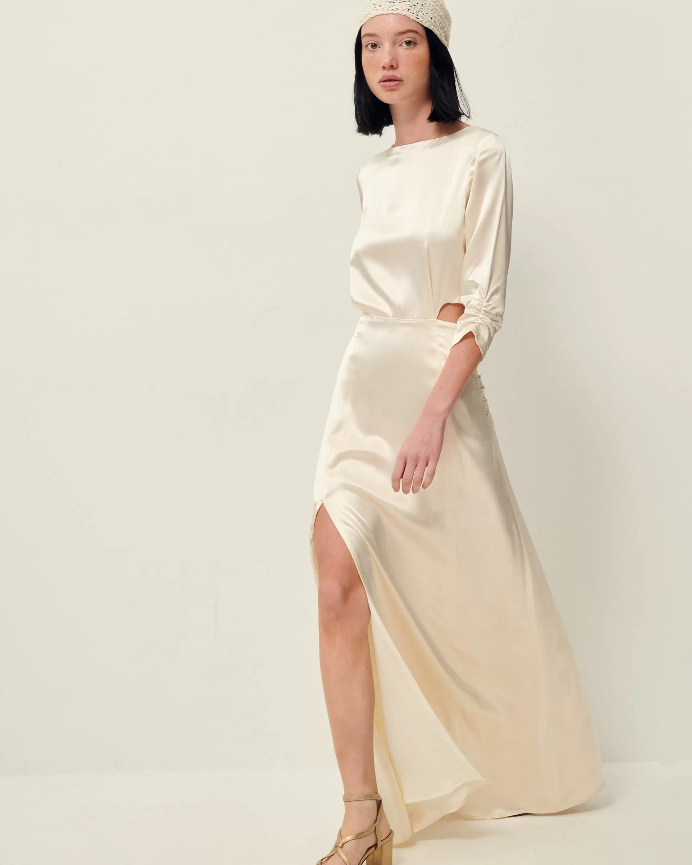 Robe longue dos nu et découpes à la taille en satin fluide de viscose.