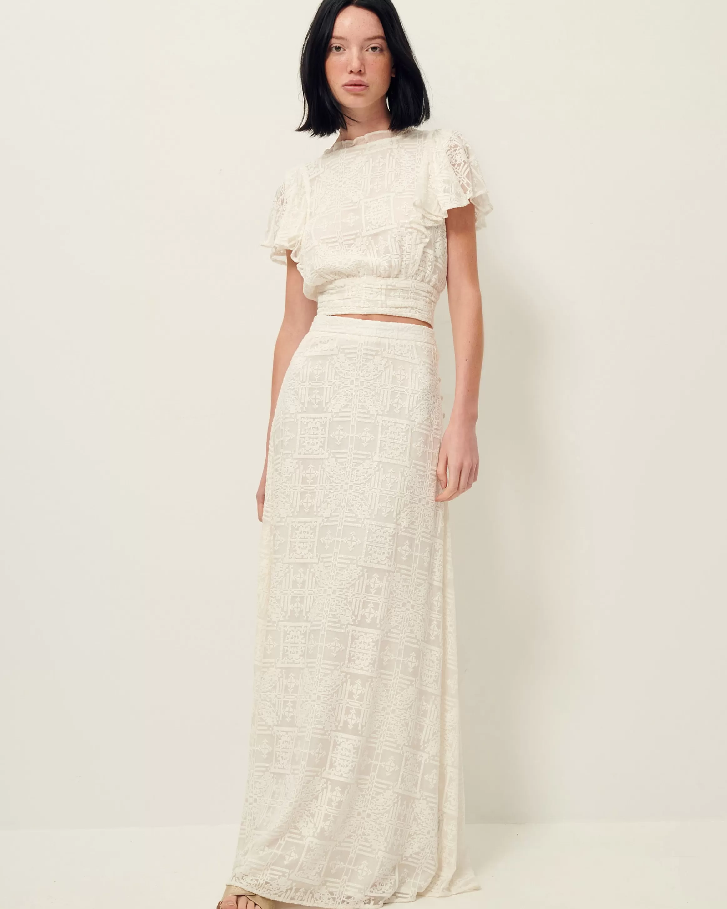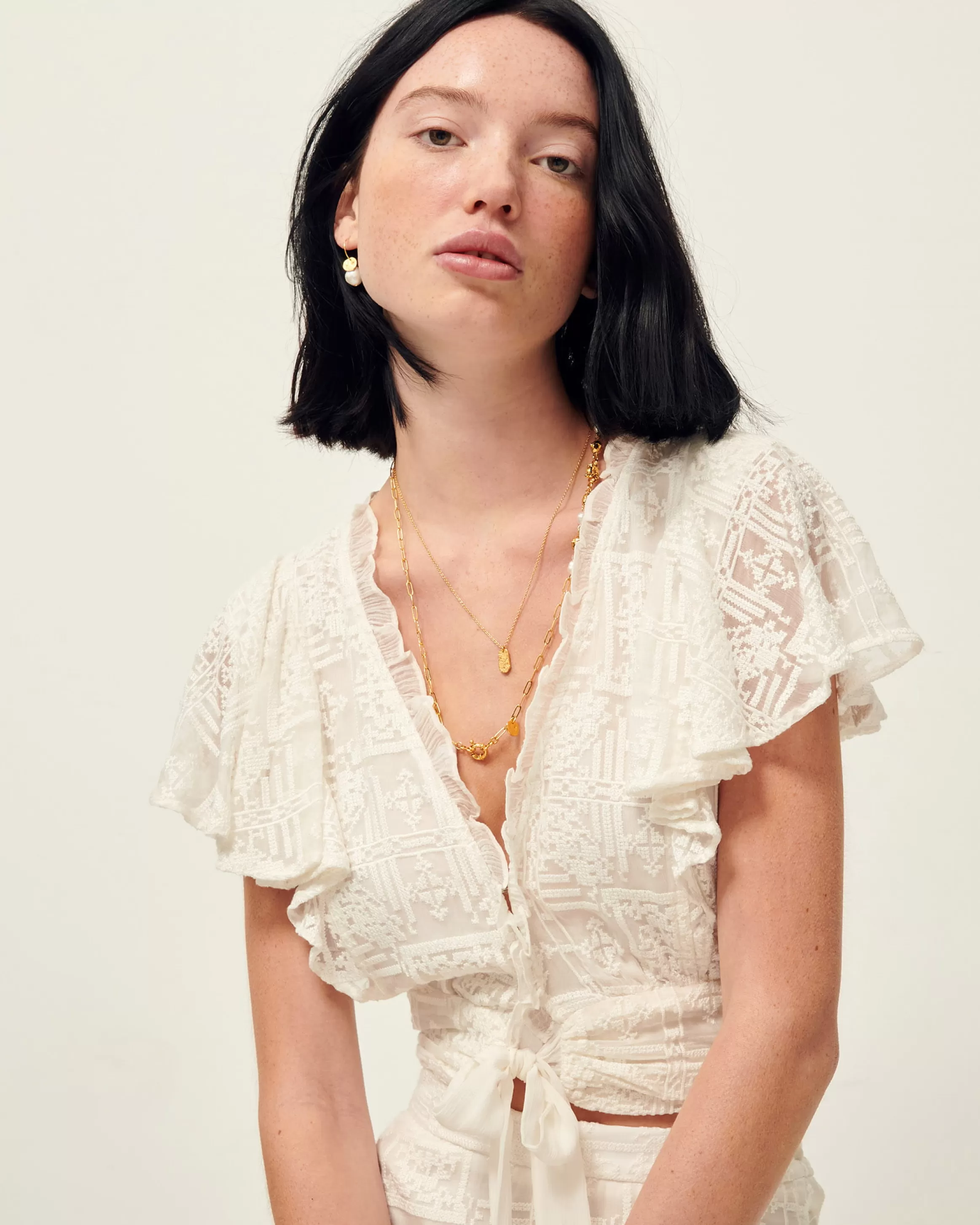 Top court volanté en dentelle point de croix, décolleté en V pouvant se porter devant et dos. Ilona mesure 1m75 et p…