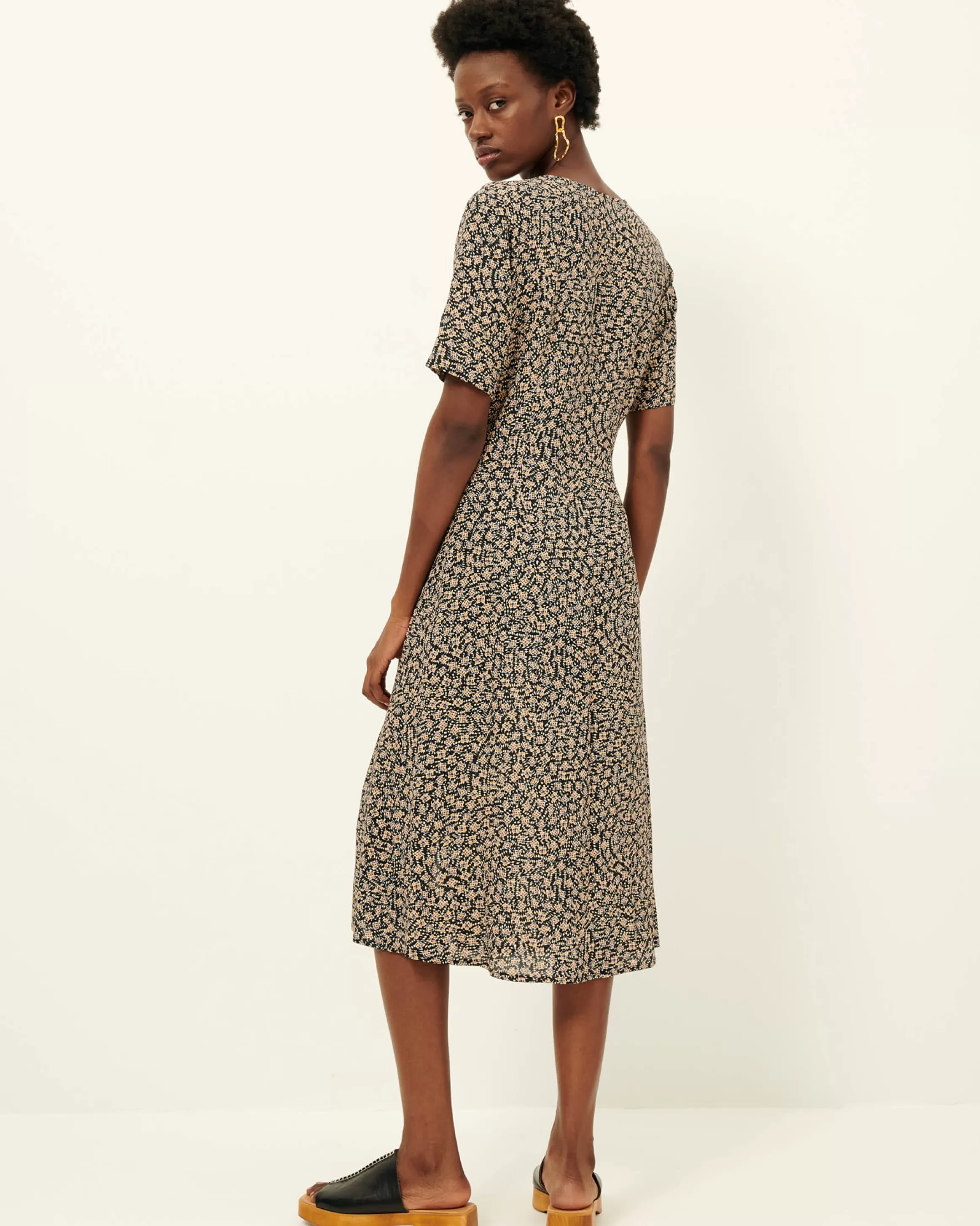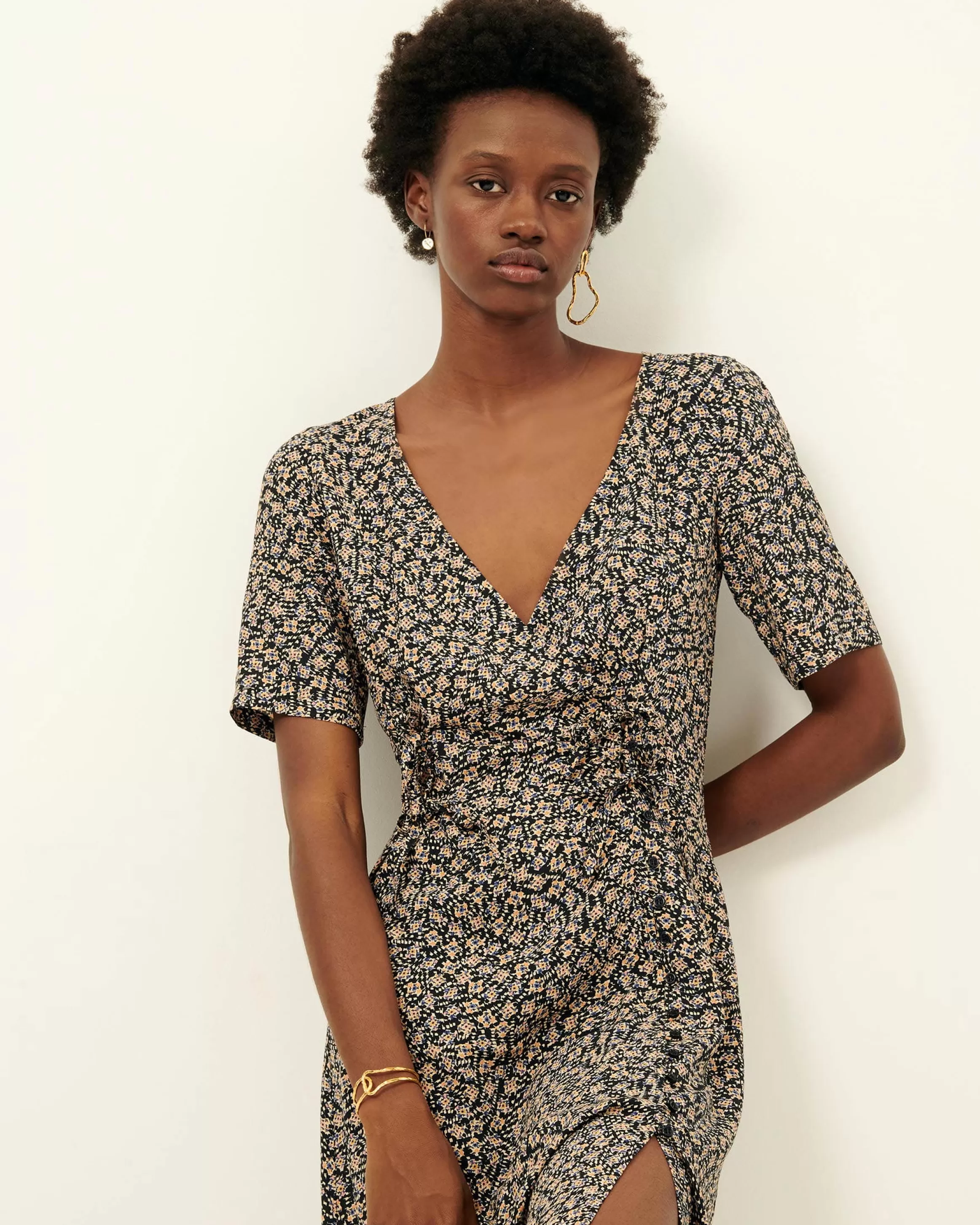 Robe mi-longue cache-cœur en crépon de viscose imprimé tissé en Italie, motif exclusif Sessùn.