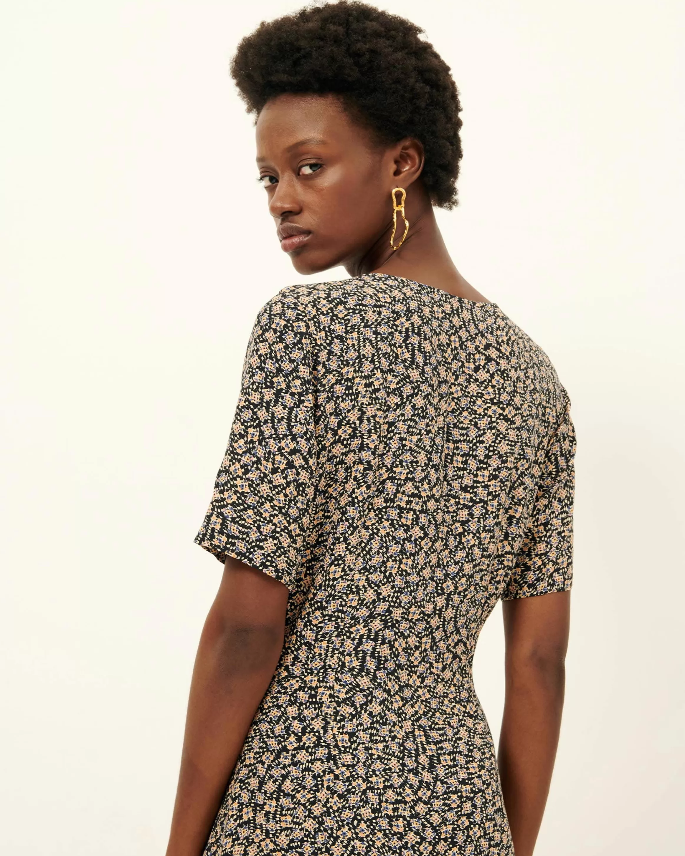 Robe mi-longue cache-cœur en crépon de viscose imprimé tissé en Italie, motif exclusif Sessùn.