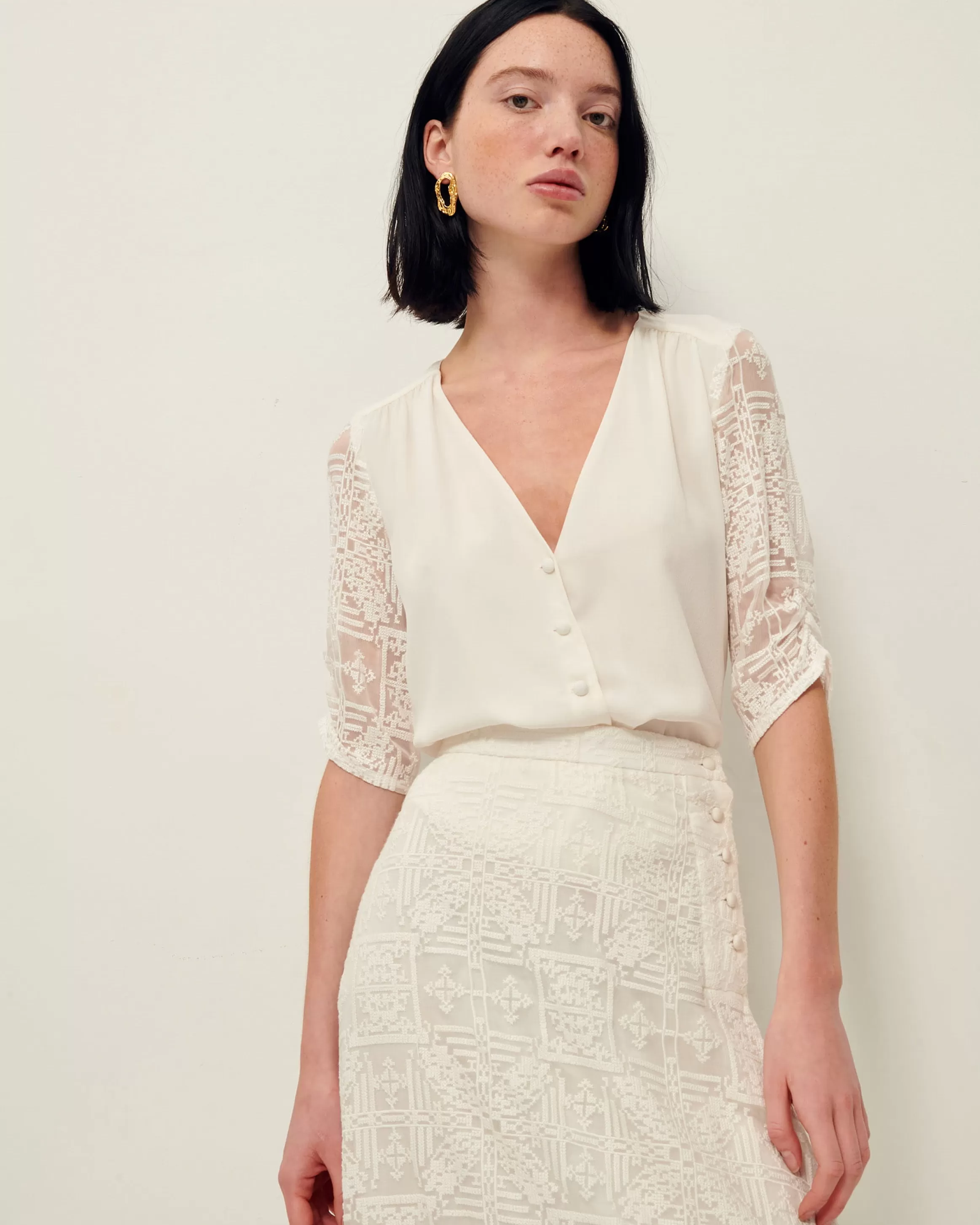 Blouse en crêpe de Chine. Ilona mesure 1m75 et porte du S.Décolleté en V.Fermeture par boutons recouverts dans la ma…