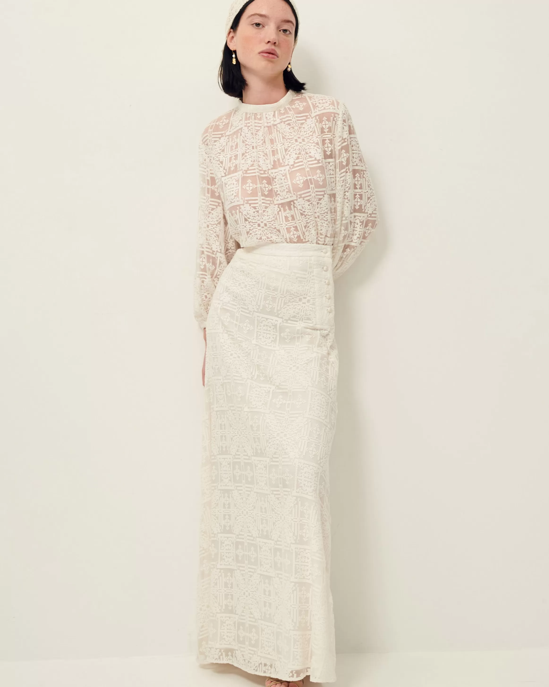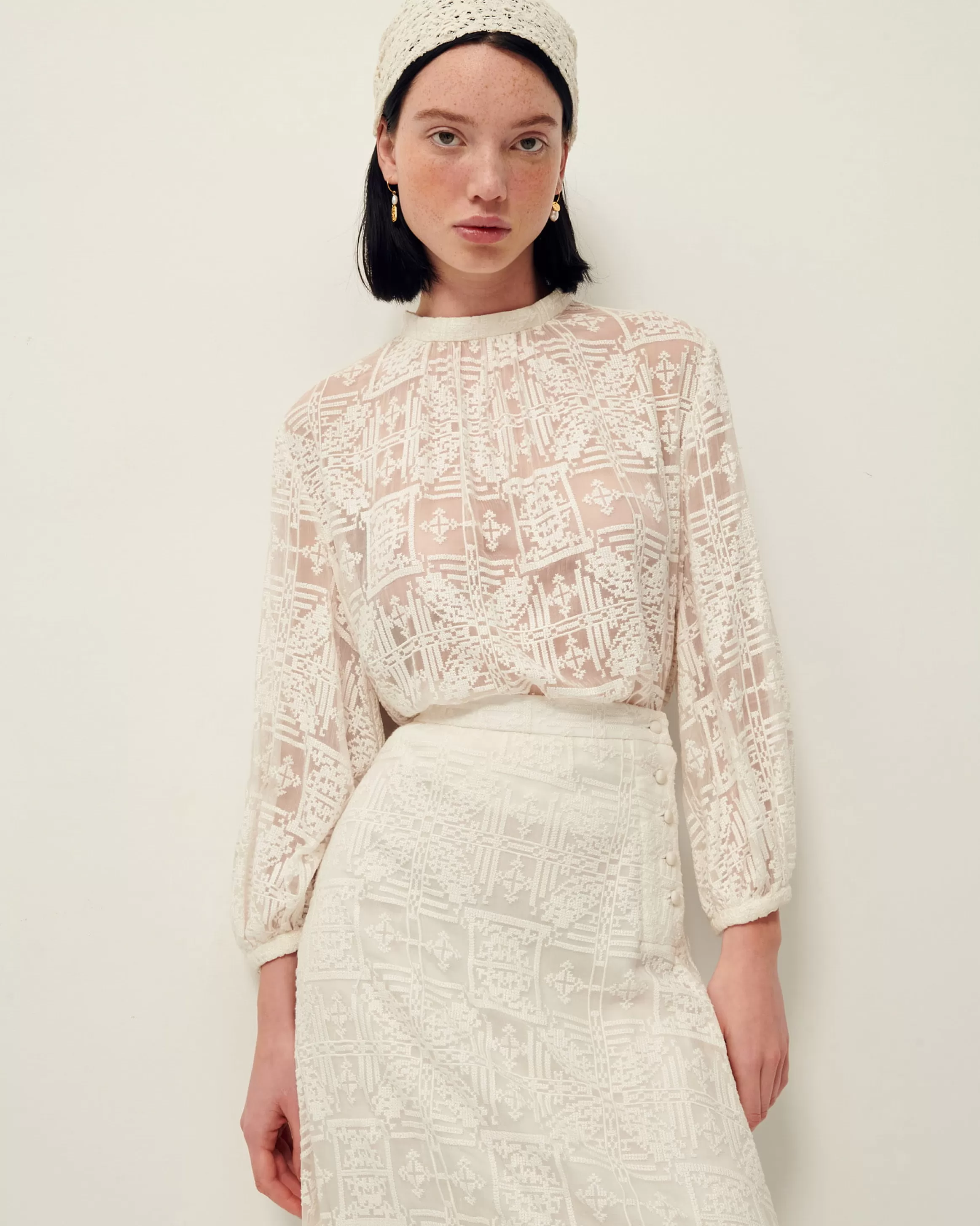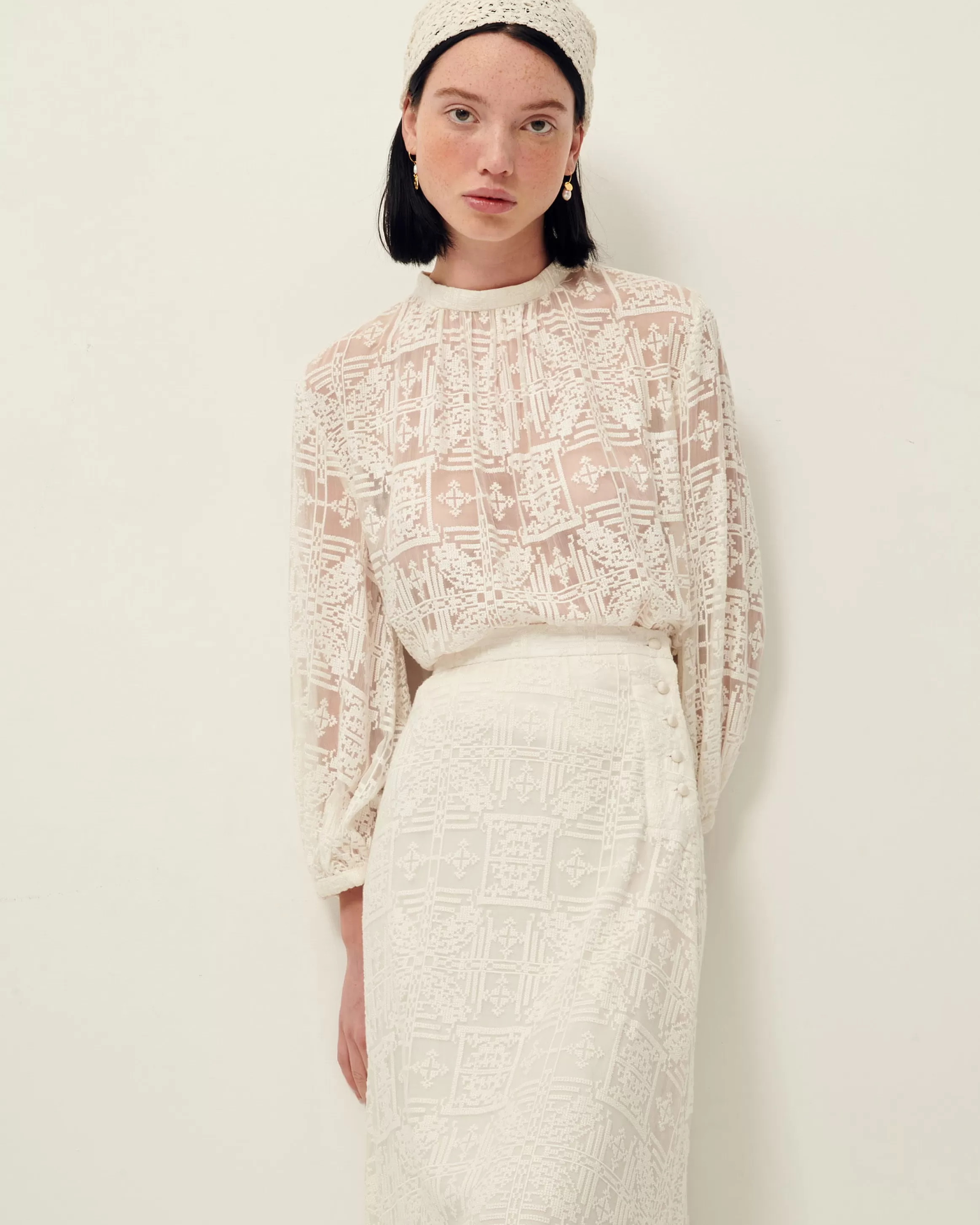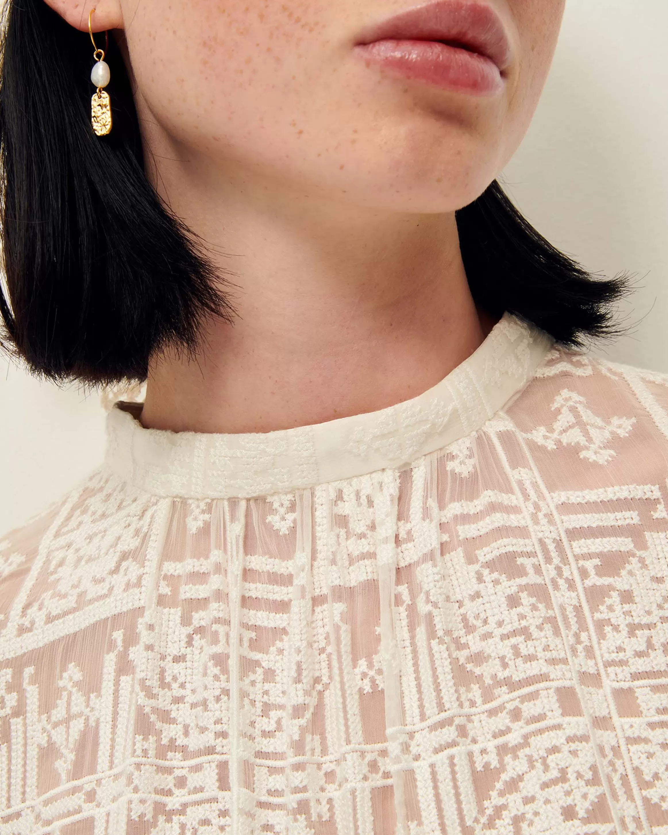 Blouse en mousseline brodée façon point de croix.Ilona mesure 1m75 et porte du S.Col montant.Manches trois quart bouff…