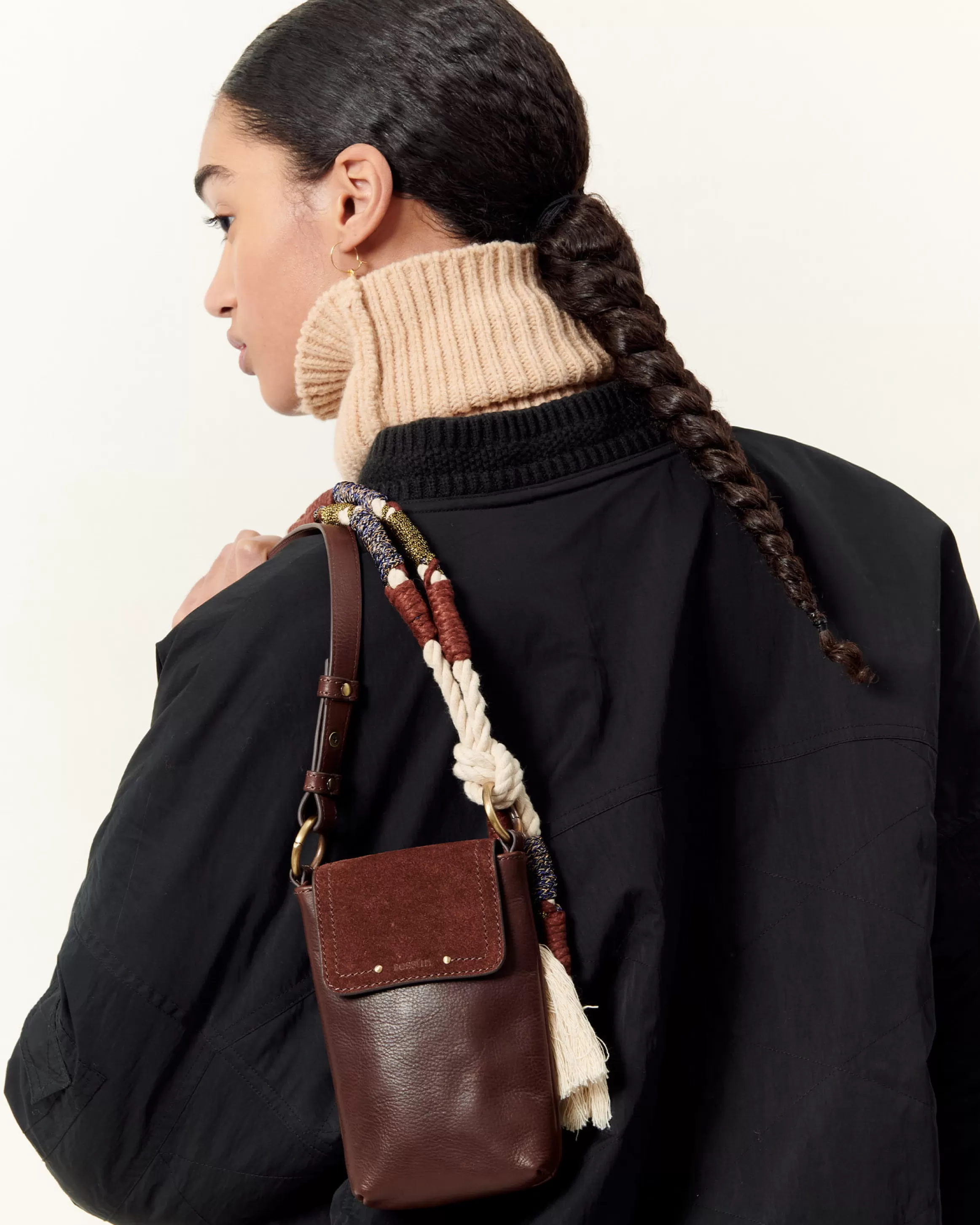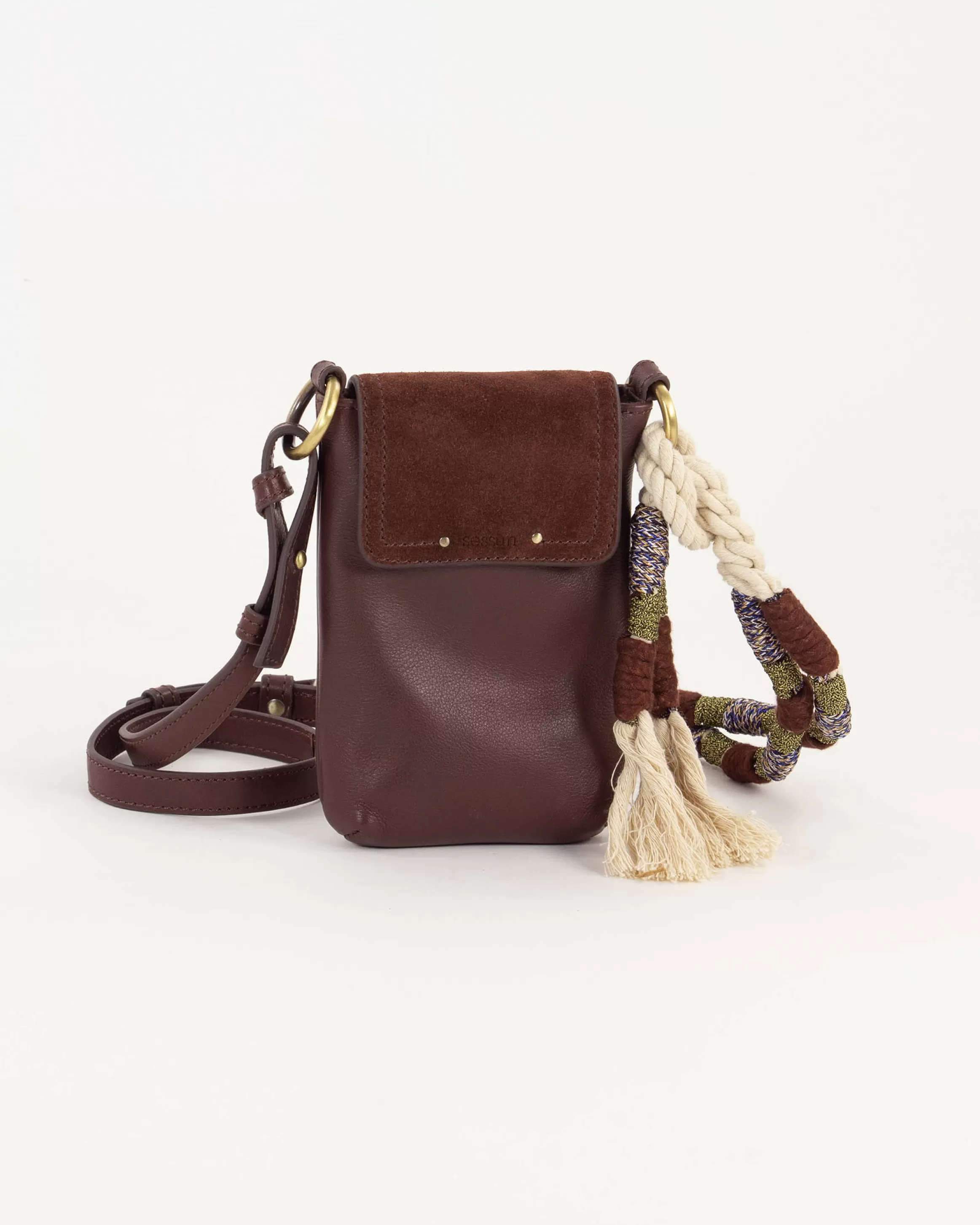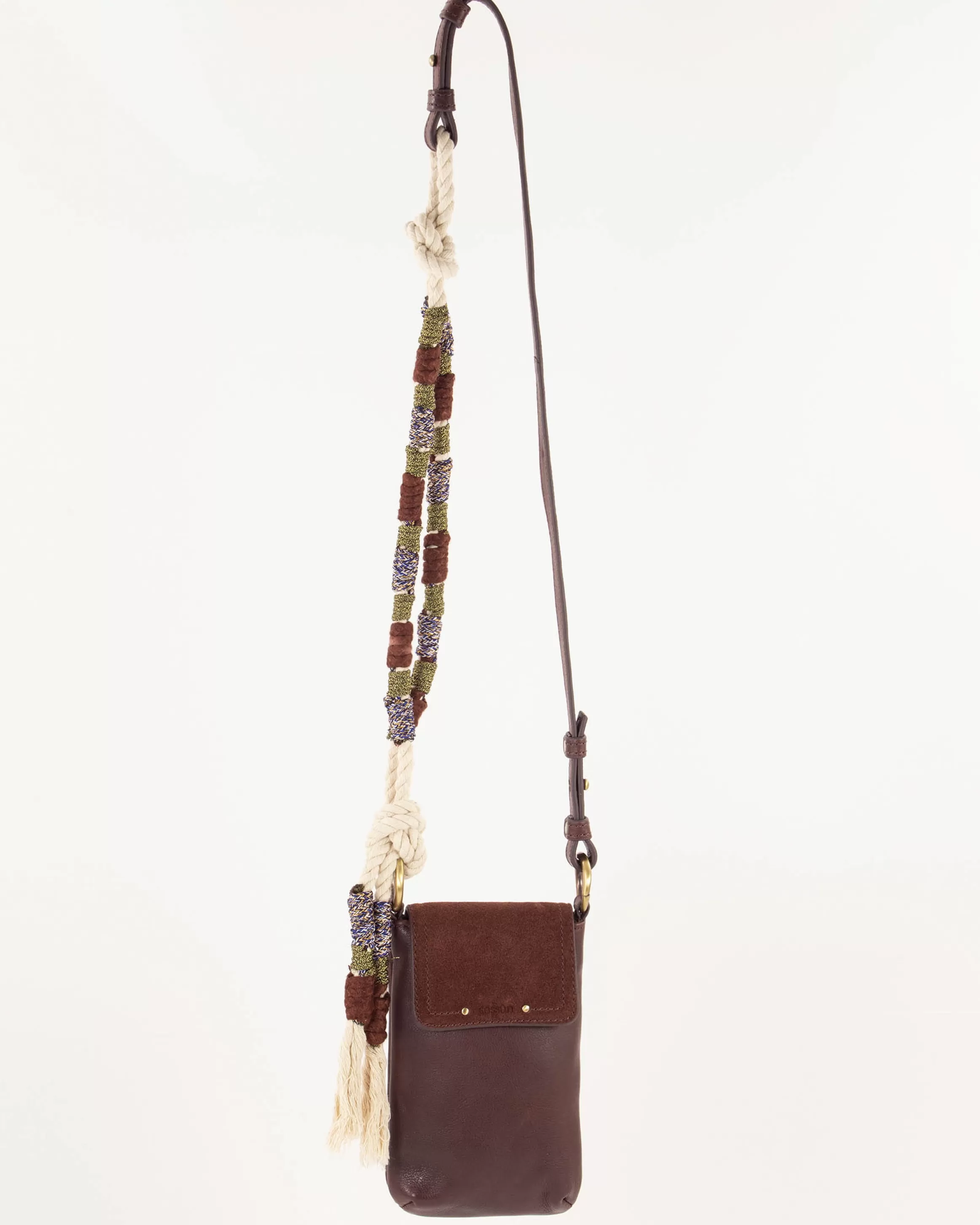 Porte portable en cuir de vache et rabat en croûte de cuir, anse corde tressée.