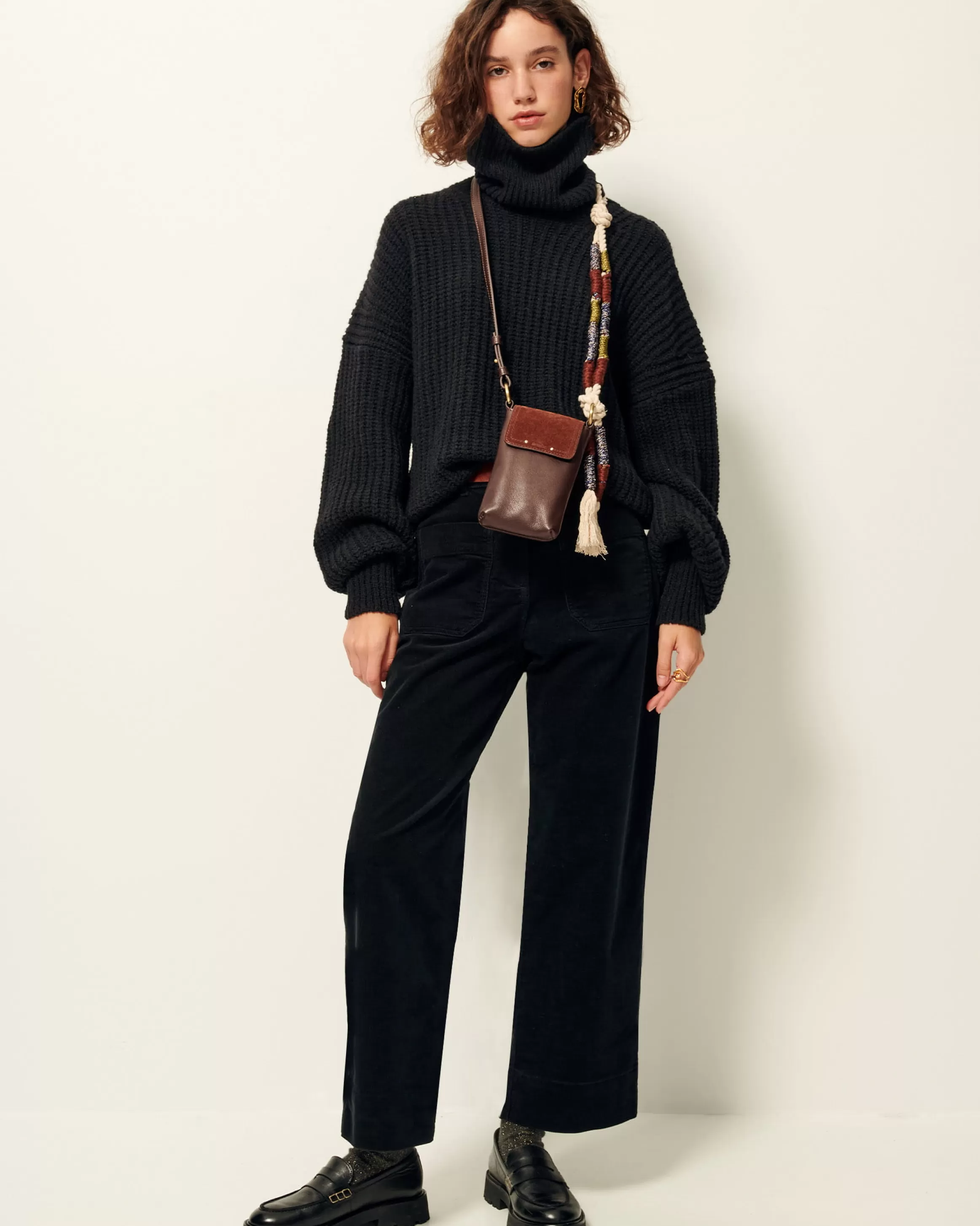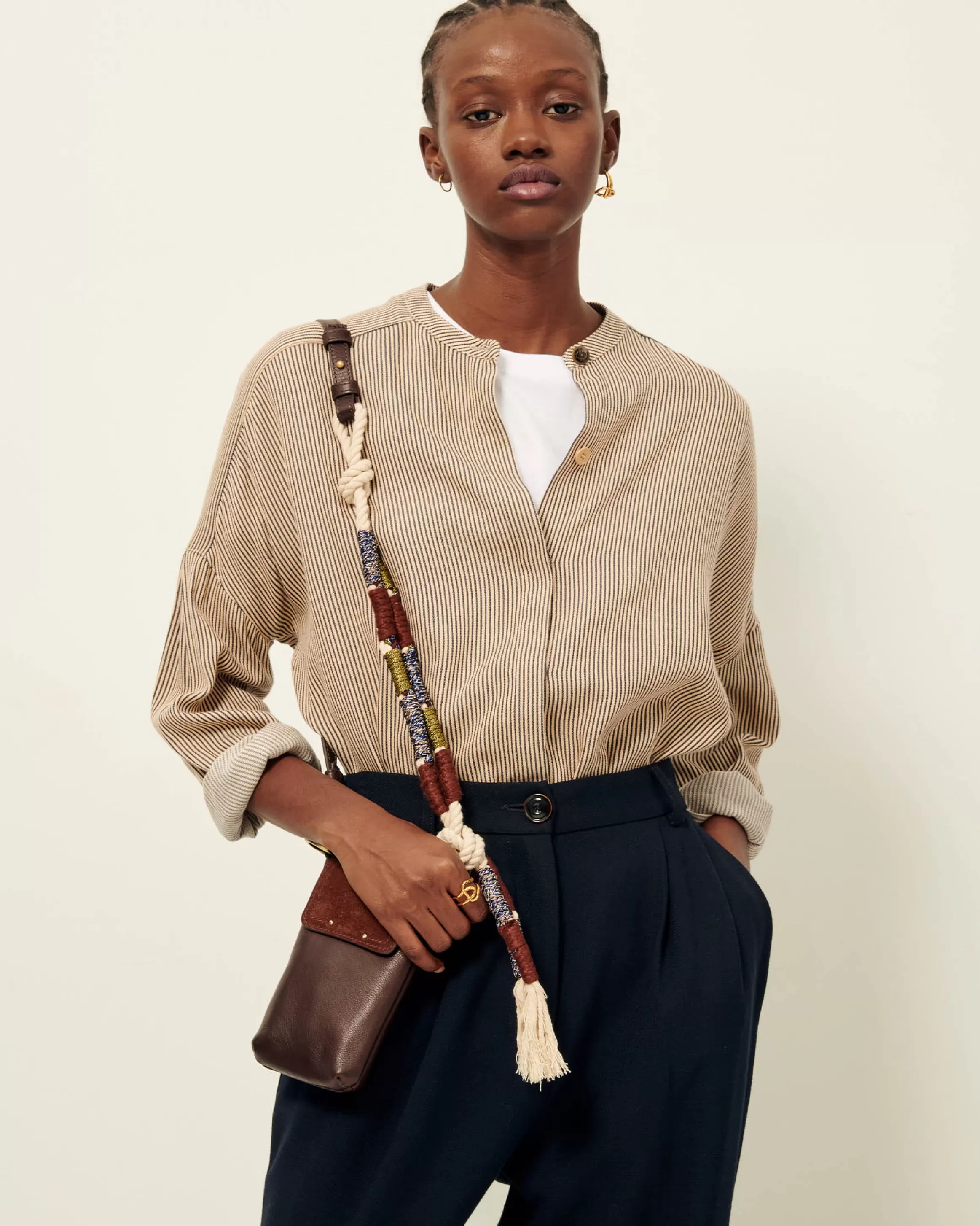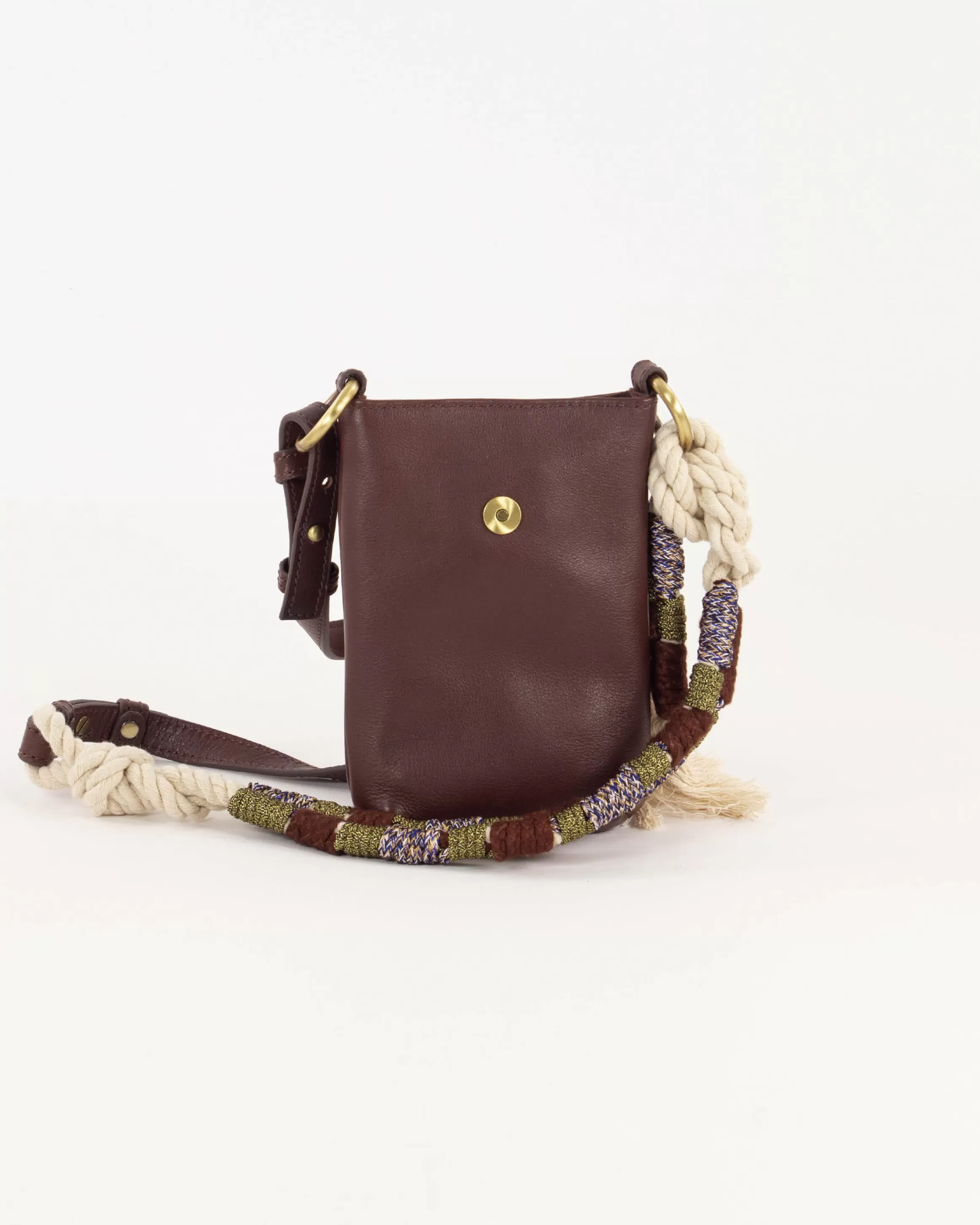 Porte portable en cuir de vache et rabat en croûte de cuir, anse corde tressée.