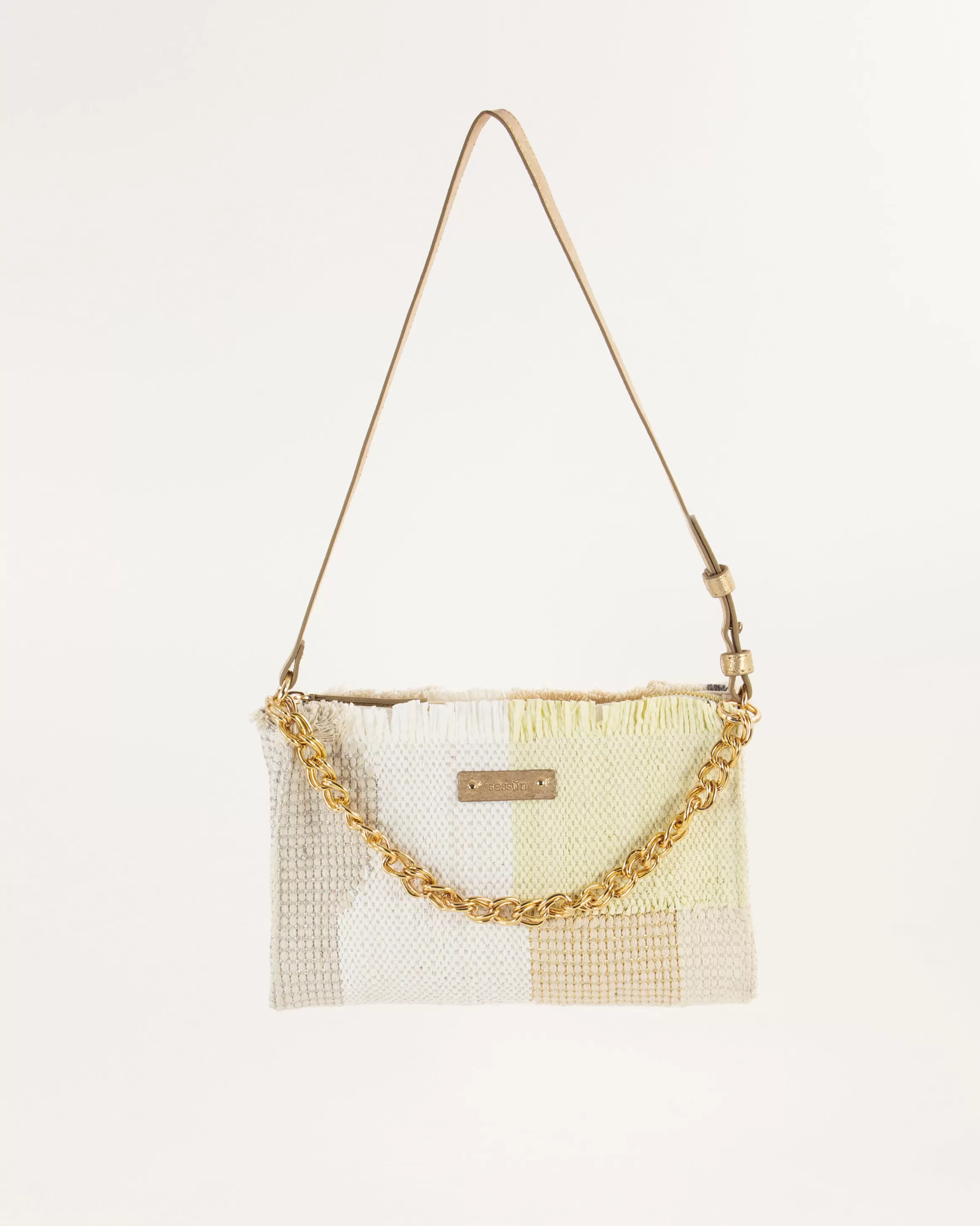 Petit sac pochette en tissage fantaisie raphia et coton, motif exclusif Sessùn.Anse chaine bijou.Anses amovibles.Doublu…