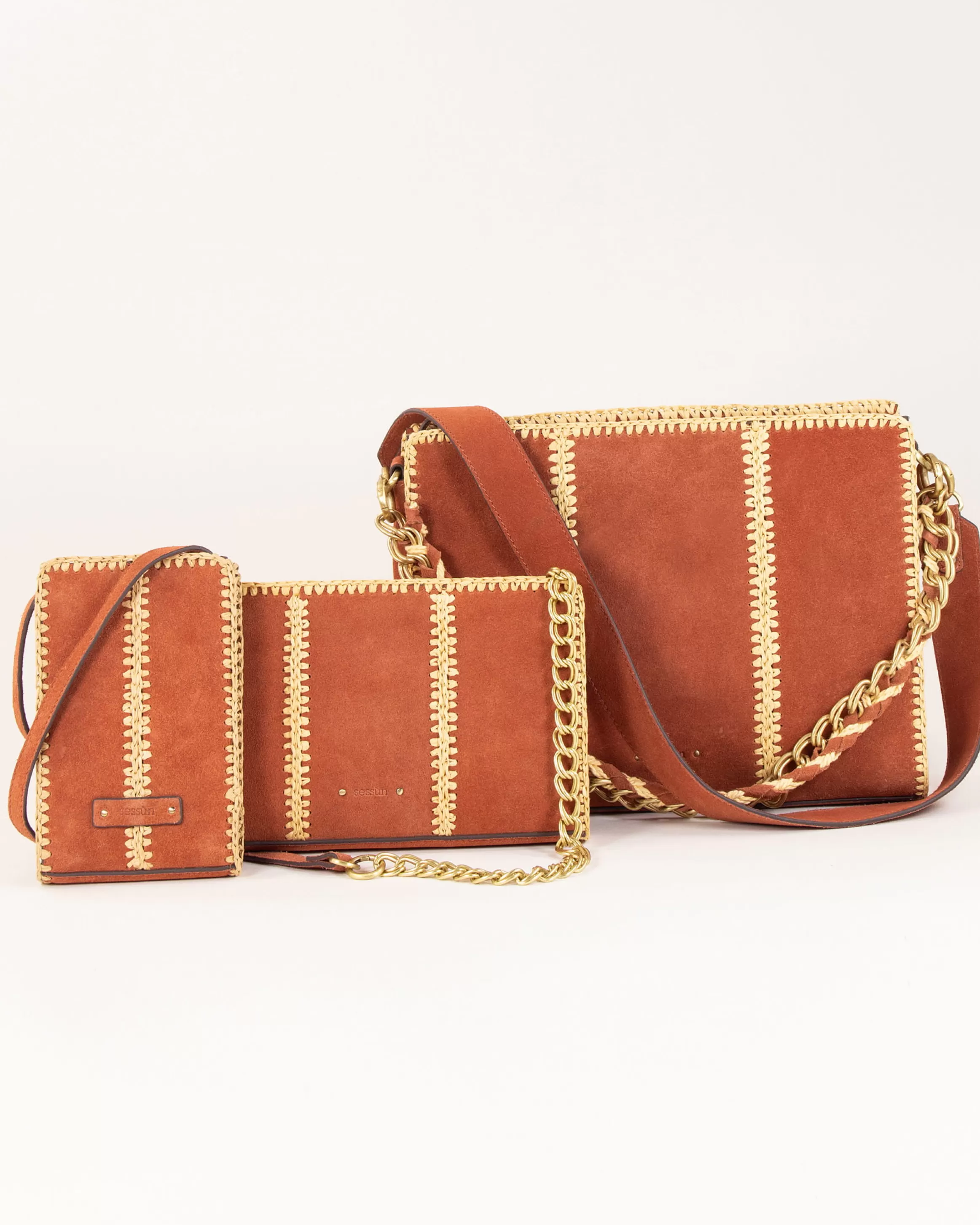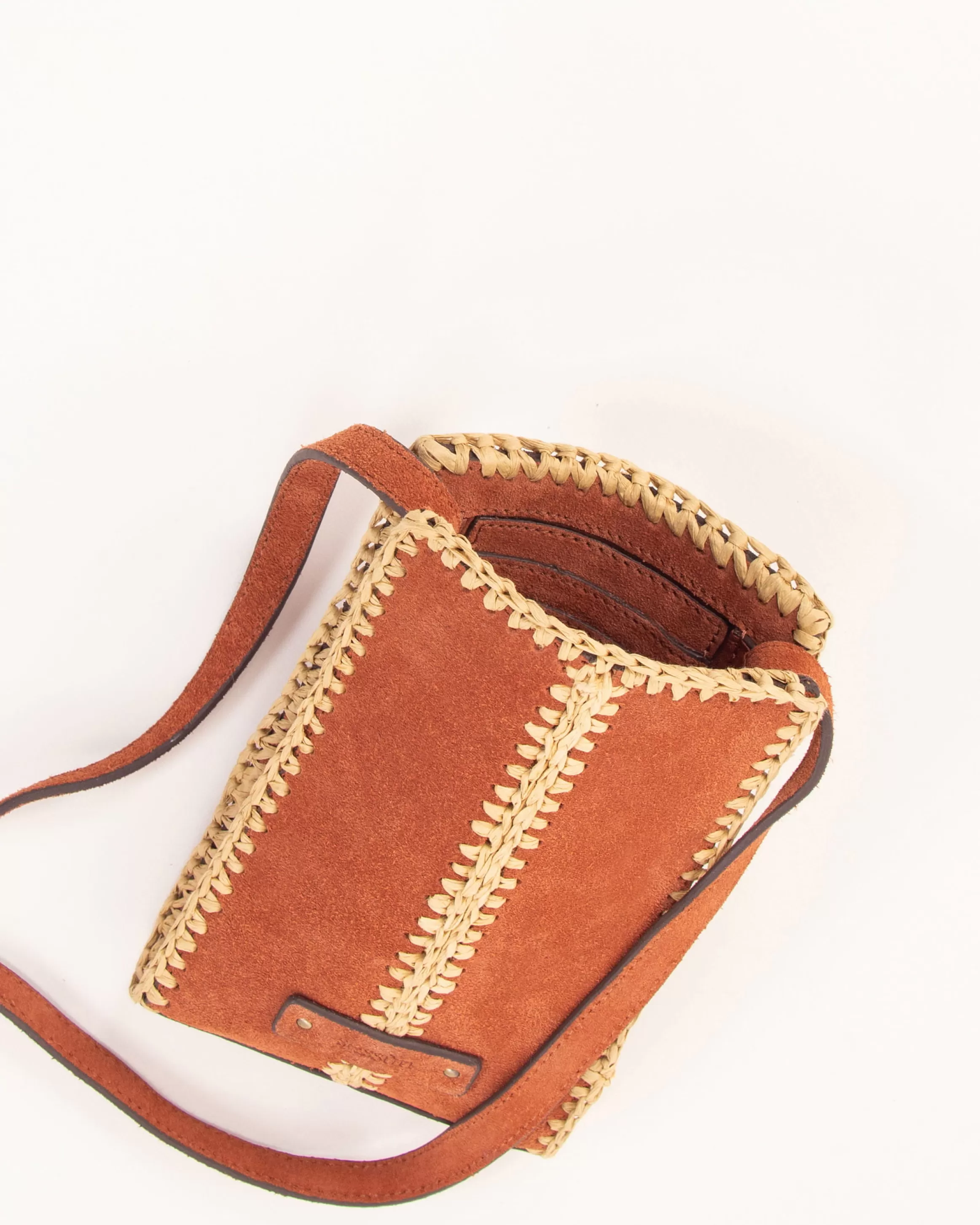 Etui pour portable en croûte de cuir brodé de raphia.