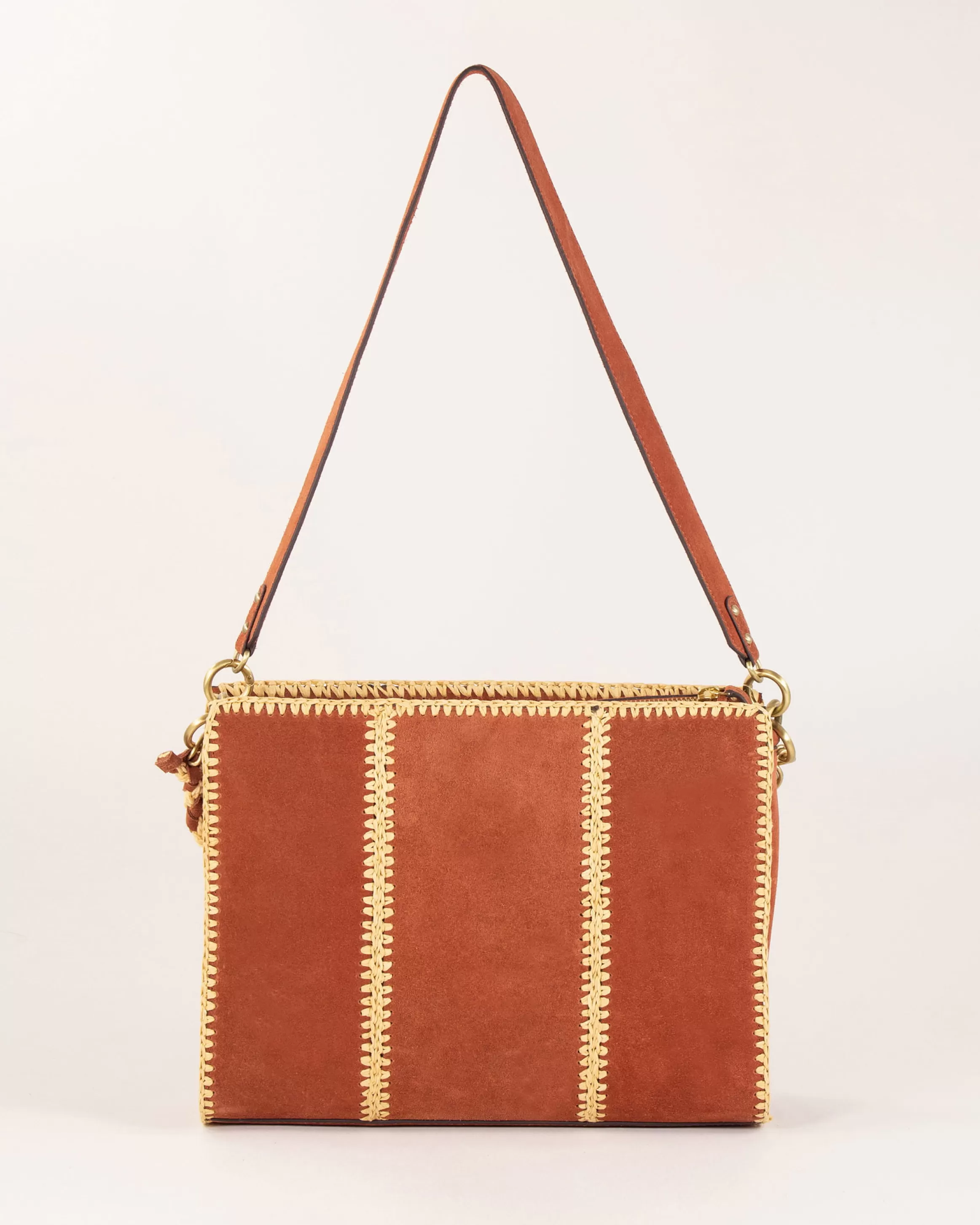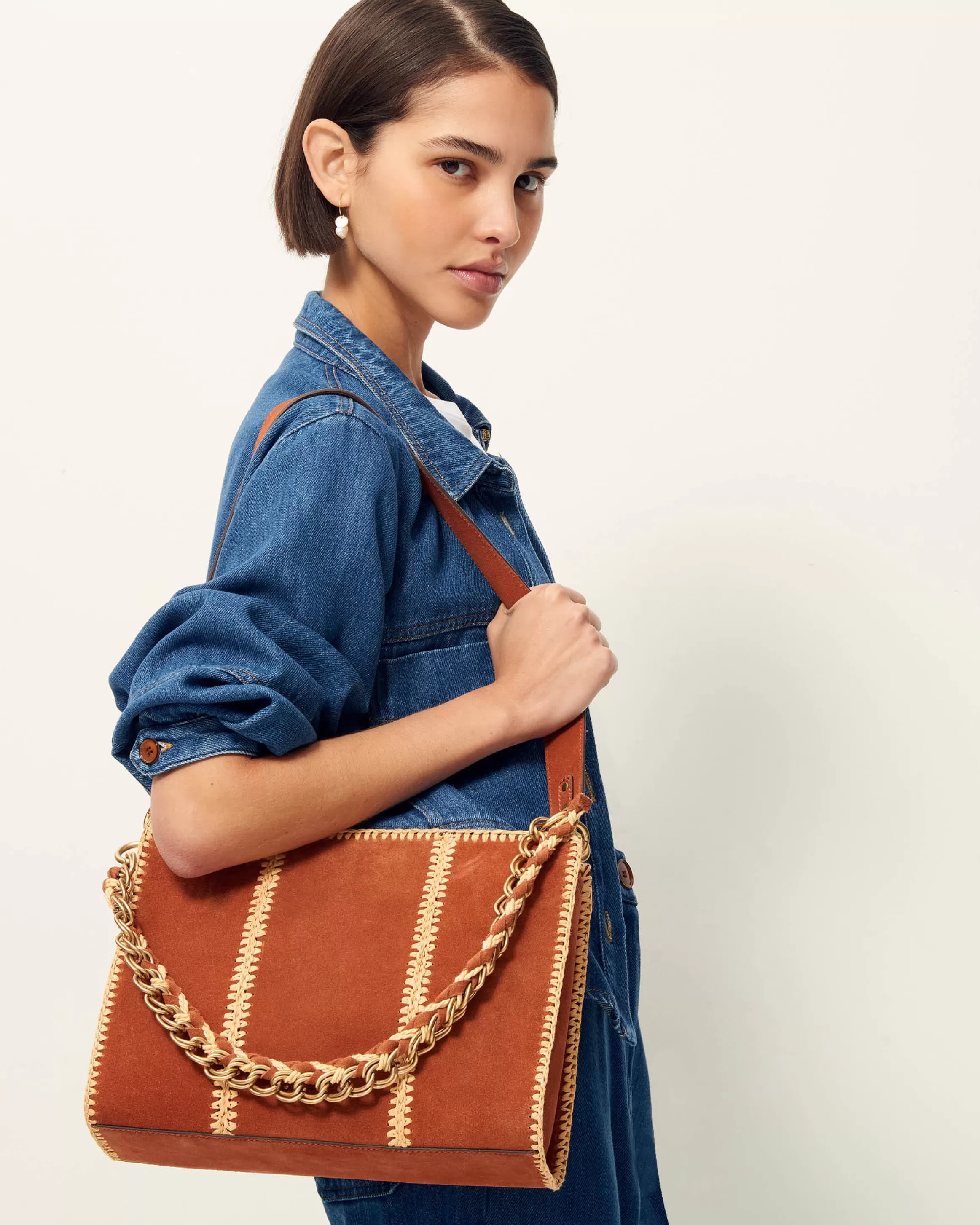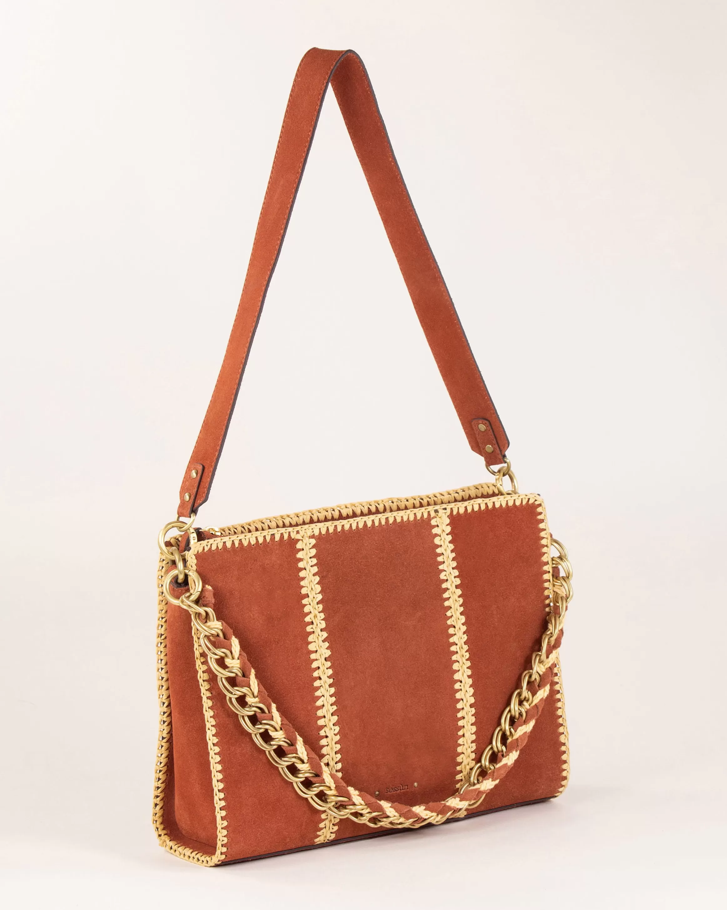 Sac pochette en crôute de cuir brodé de raphia avec anse chaine bijou et anse cuir.
