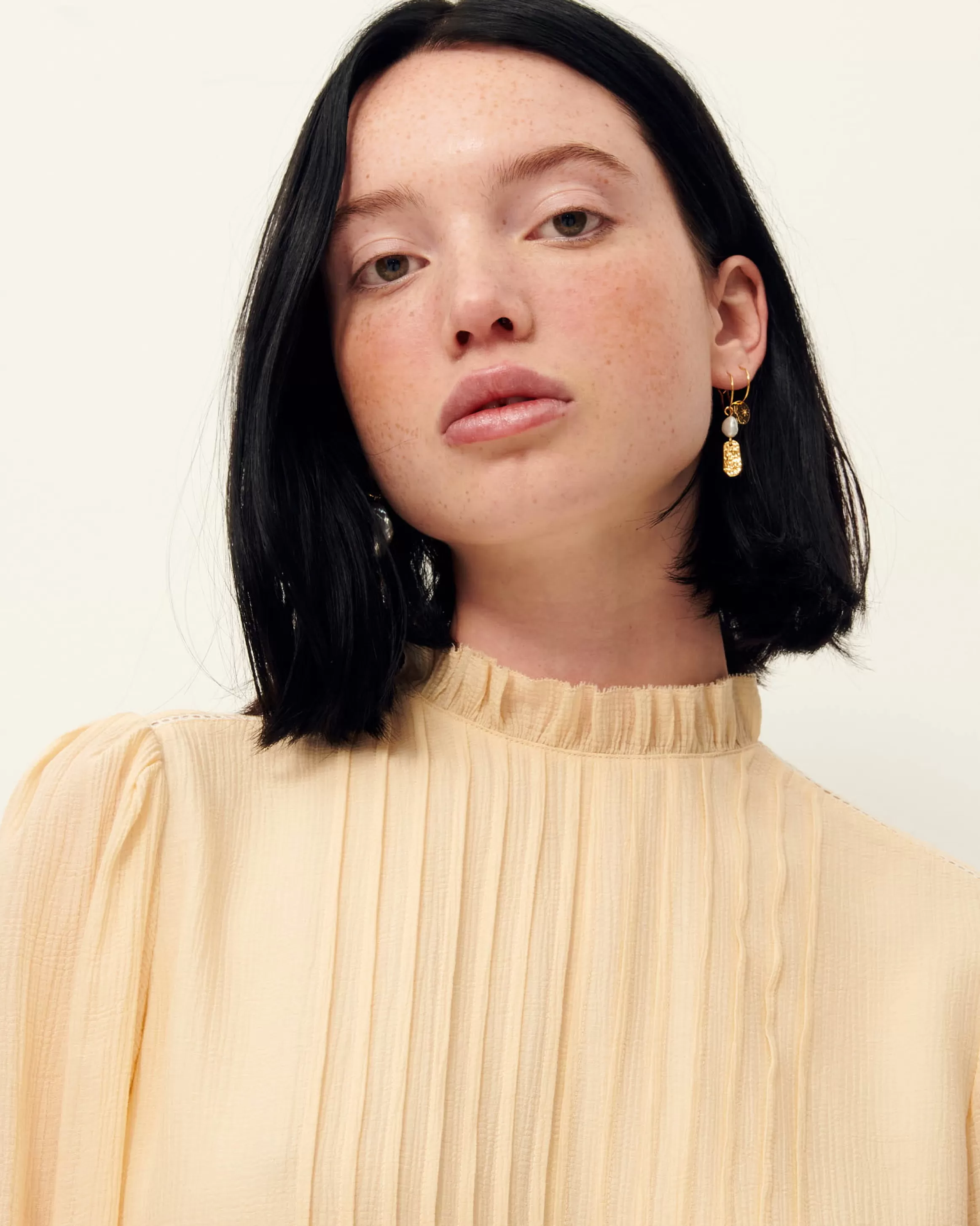 Robe courte en crépon de viscose satiné, détails de plis piqués et de galons ajourés