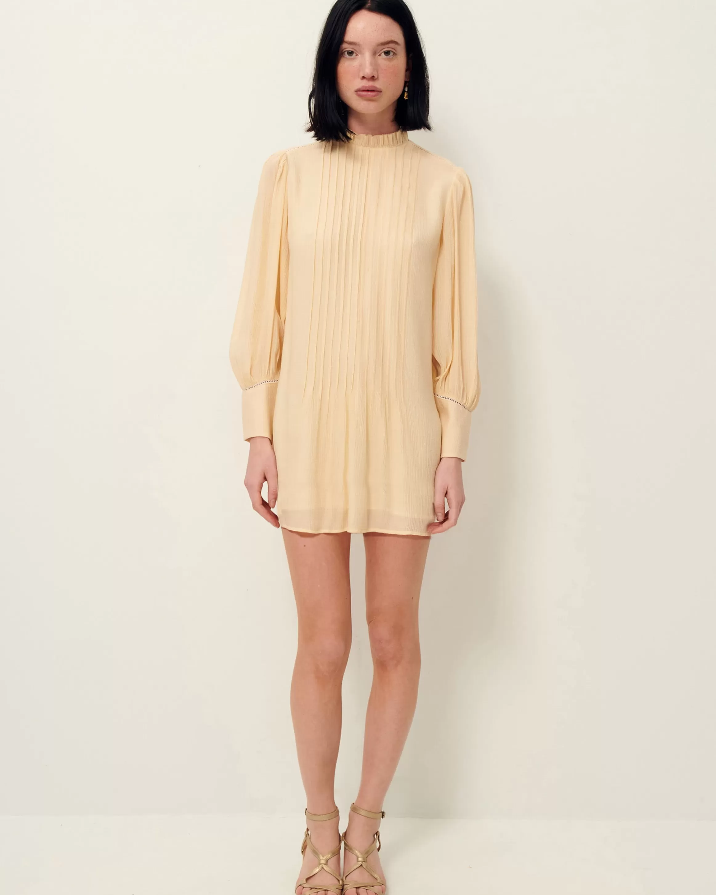 Robe courte en crépon de viscose satiné, détails de plis piqués et de galons ajourés