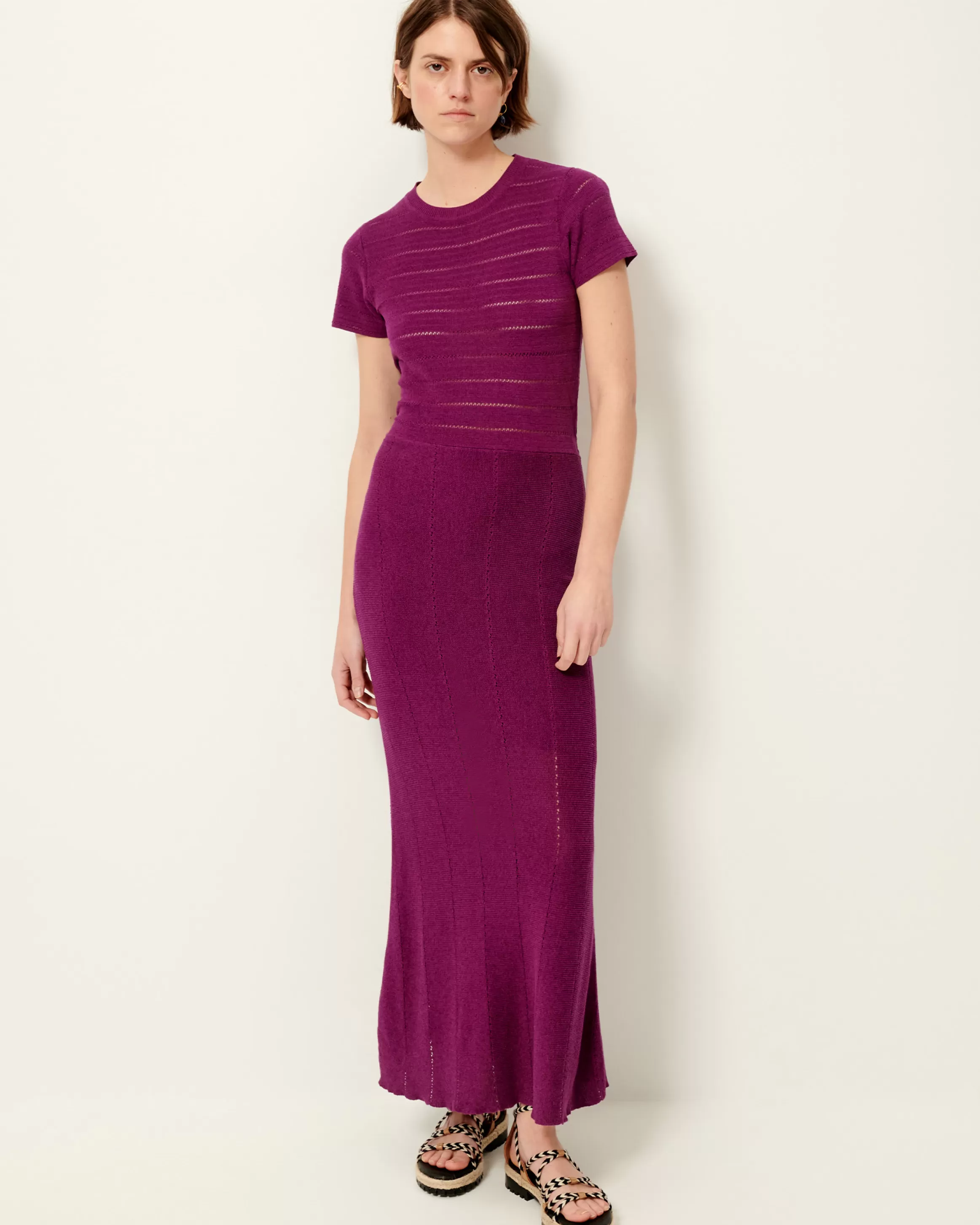 Robe longue à dos nu torsadé en maille fine ajourée.