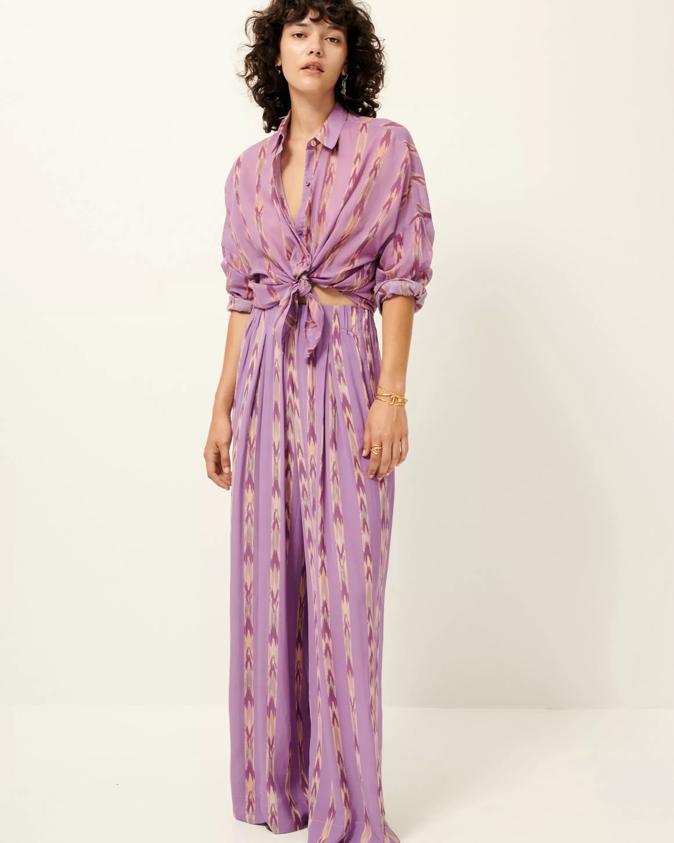 Chemise ample emmanchures basses en voile de coton imprimé apprêté en Italie, motif exclusif Sessùn.Zoé mesure 1m75…