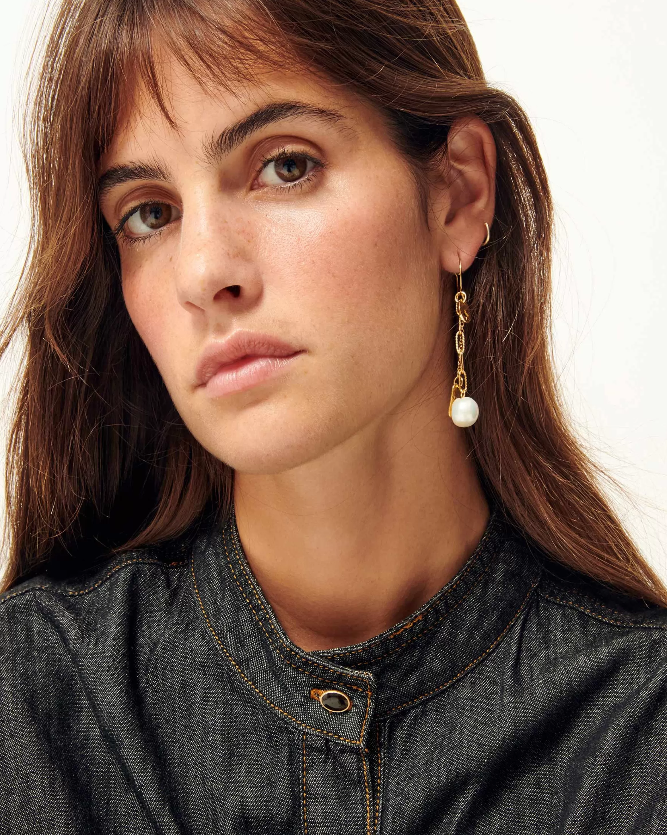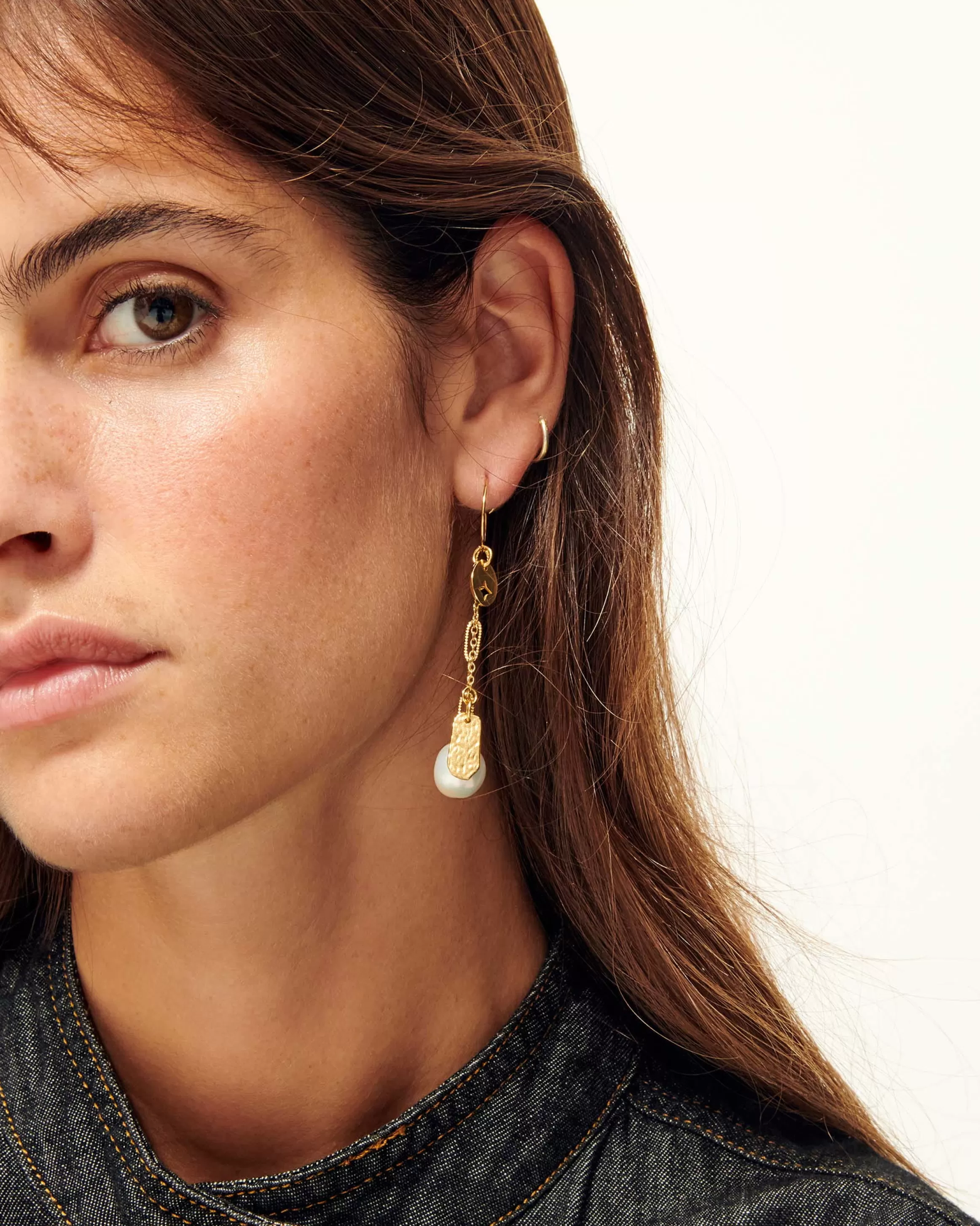 Mono boucle d’oreille fine créole et chaine, avec perle d’eau douce nacrée et médailles.VENDU À L’UNITÉLaiton doré…