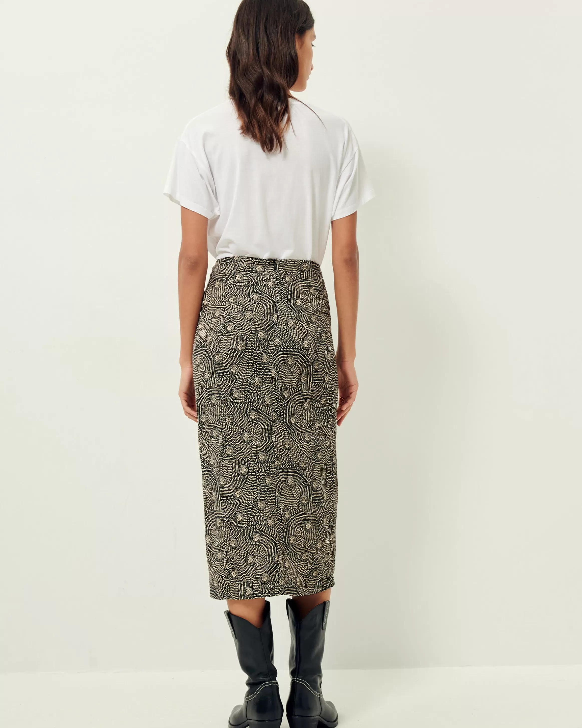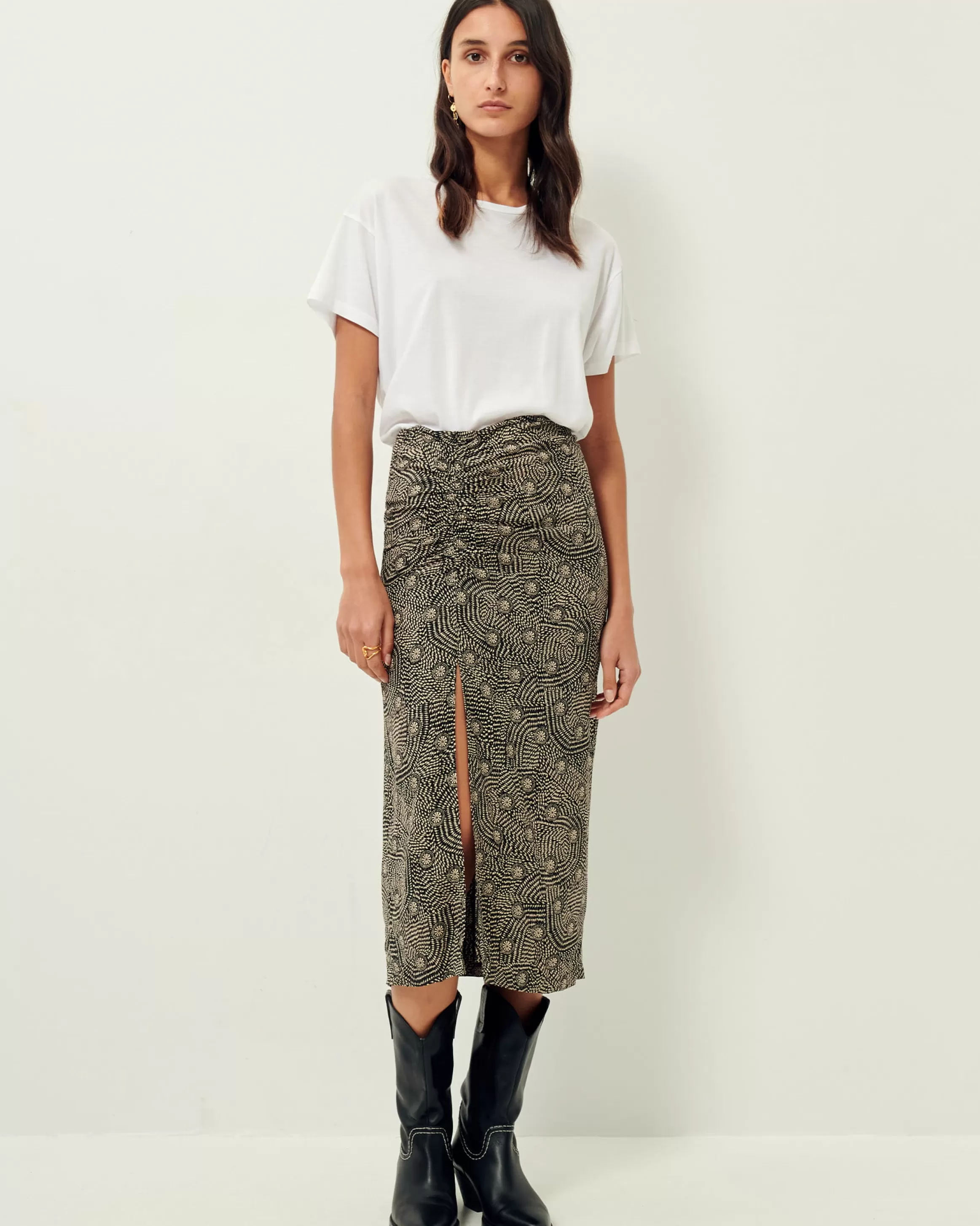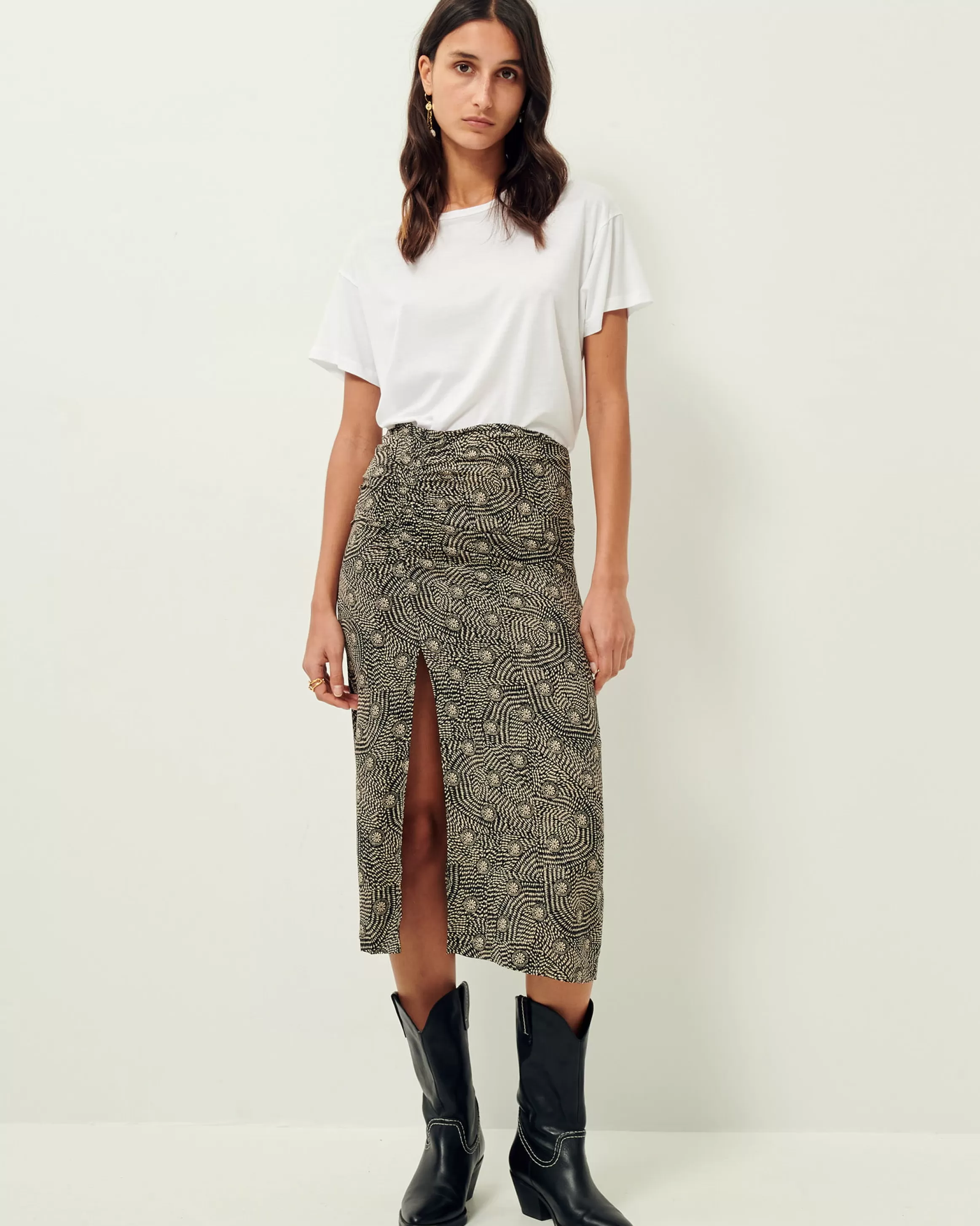 Jupe mi longue fendue en satin fluide imprimé, motif exclusif Sessùn.