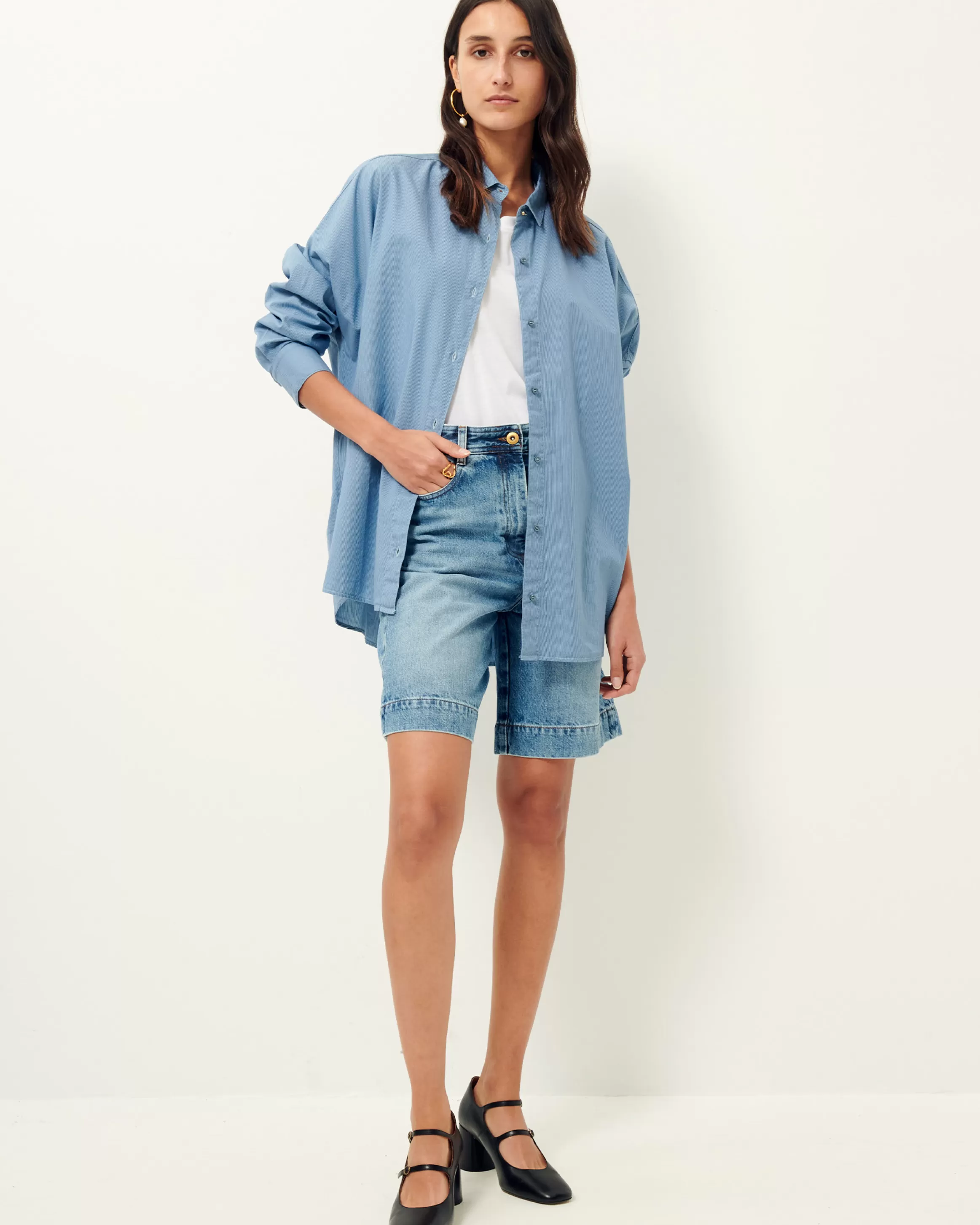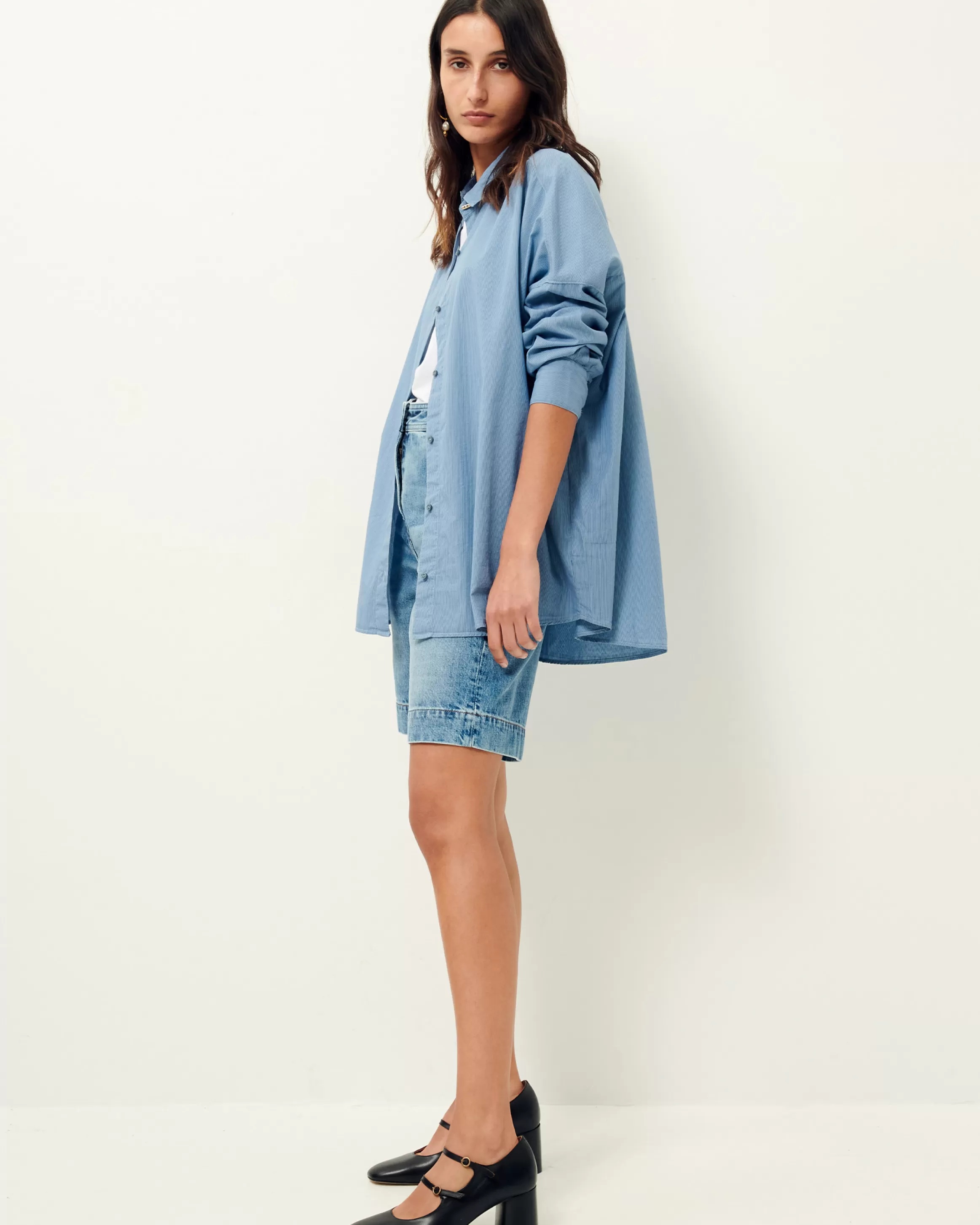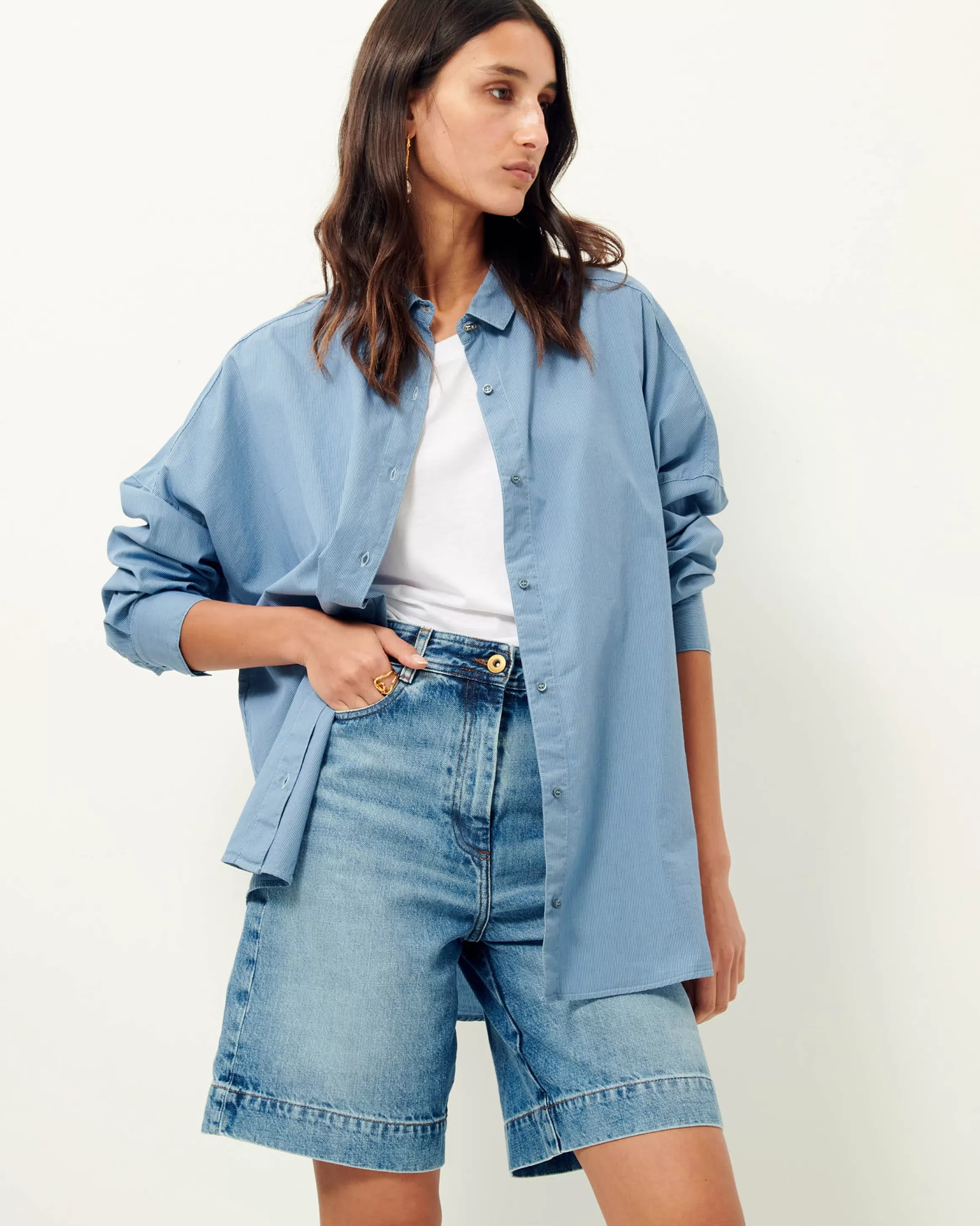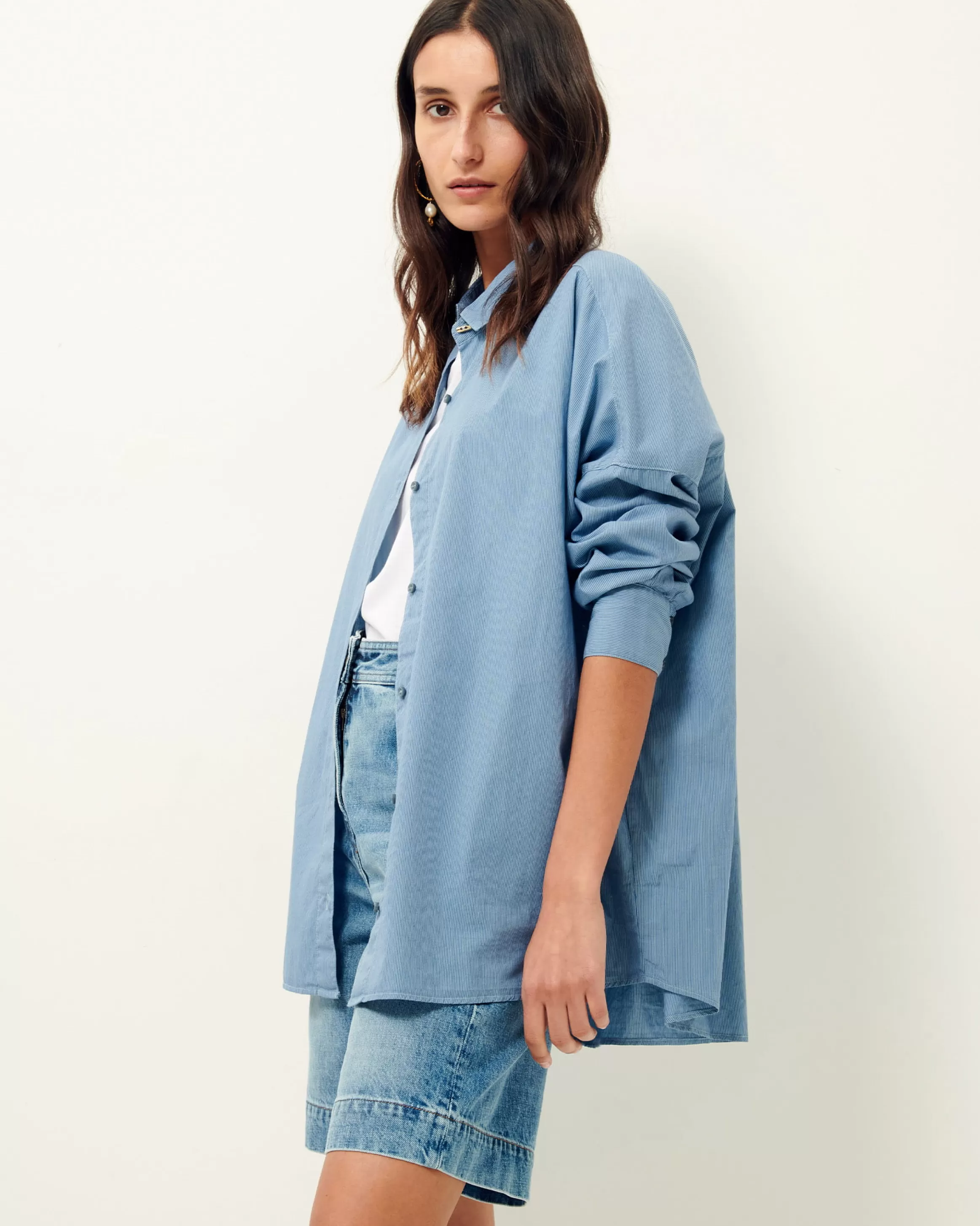 Grande chemise en popeline rayée compacte teint fils, surteinte en plongée.Mariam mesure 1m73 et porte du S. Entre deu…