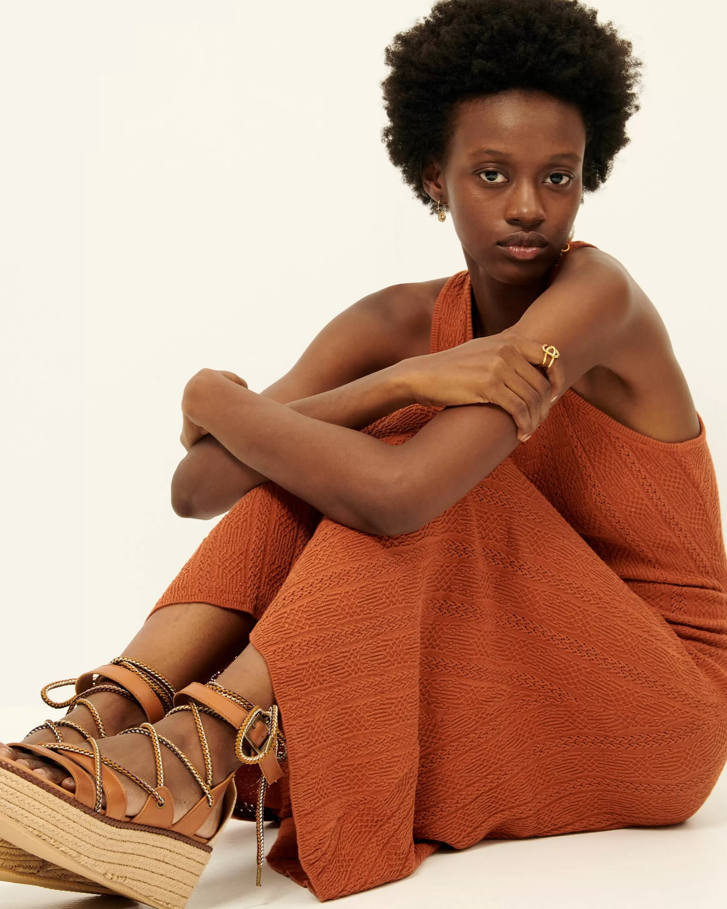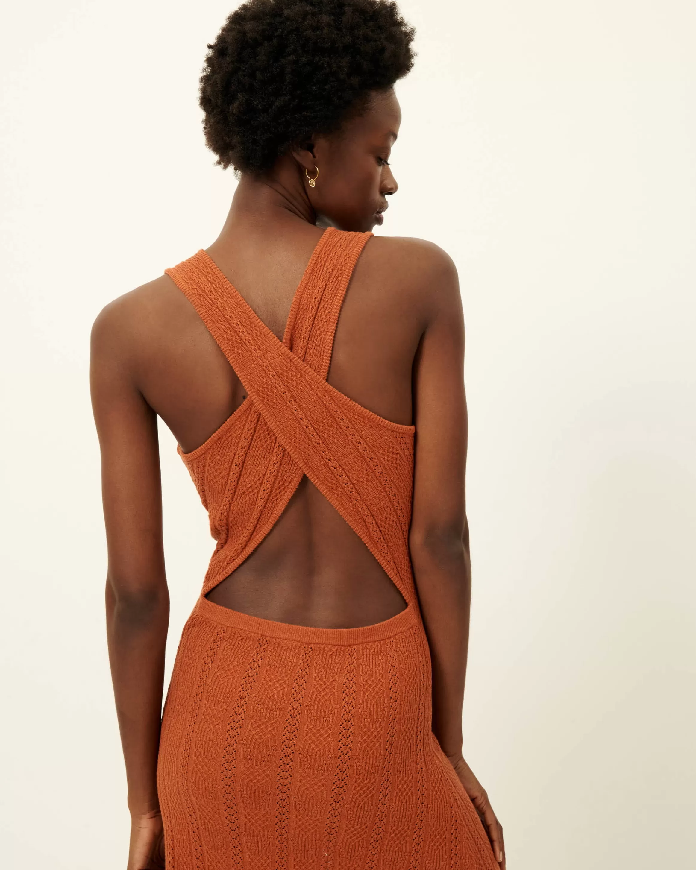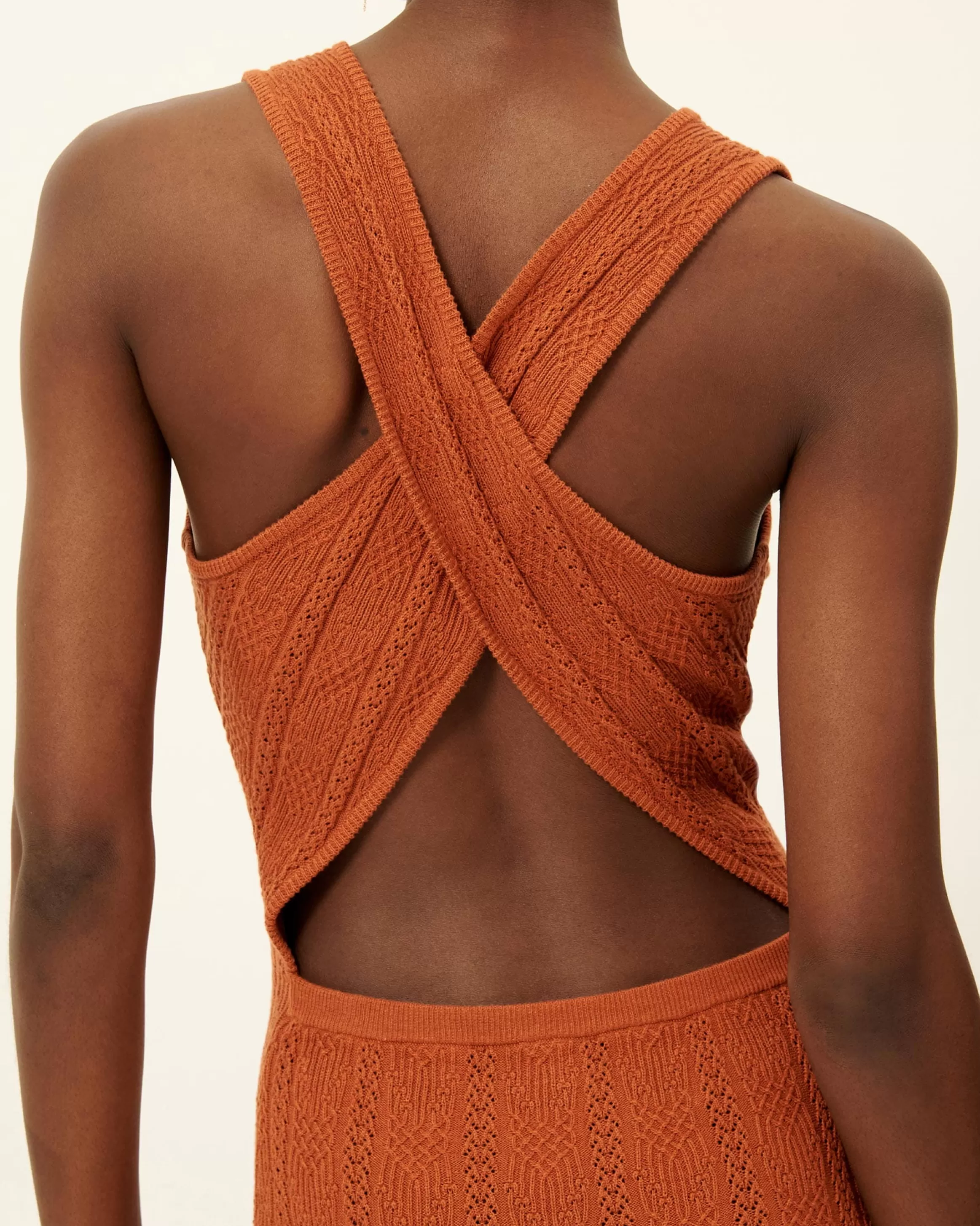 Robe longue à larges bretelles croisées au dos en maille fantaisie à points ajourés.