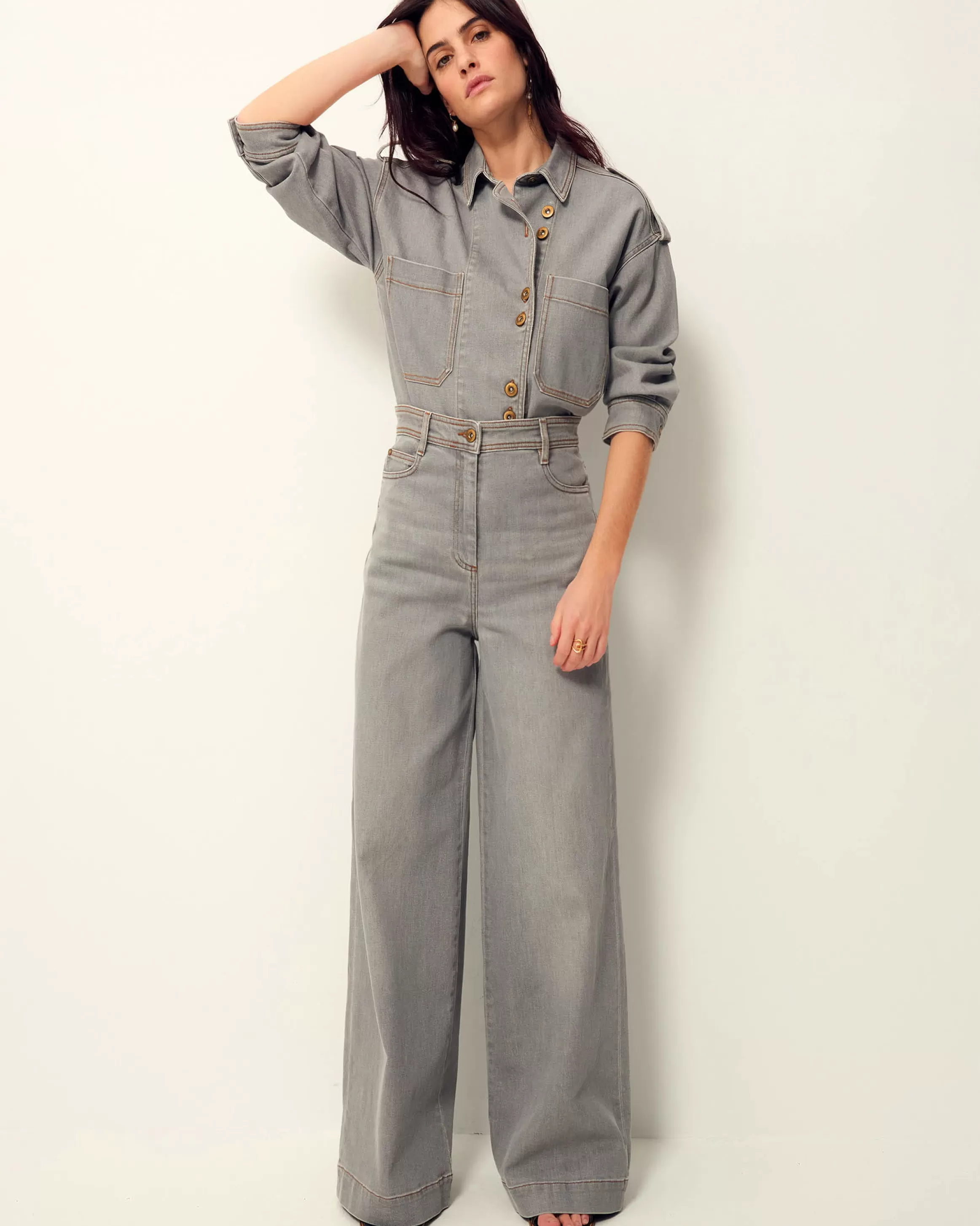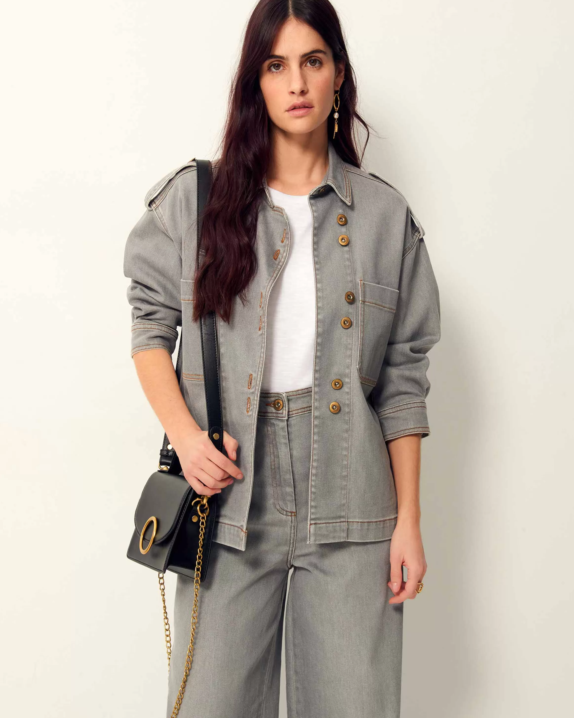 Surchemise esprit officier en denim stonewashé.Prune mesure 1m70 et porte du S.Fermeture boutonnée devant par boutons …