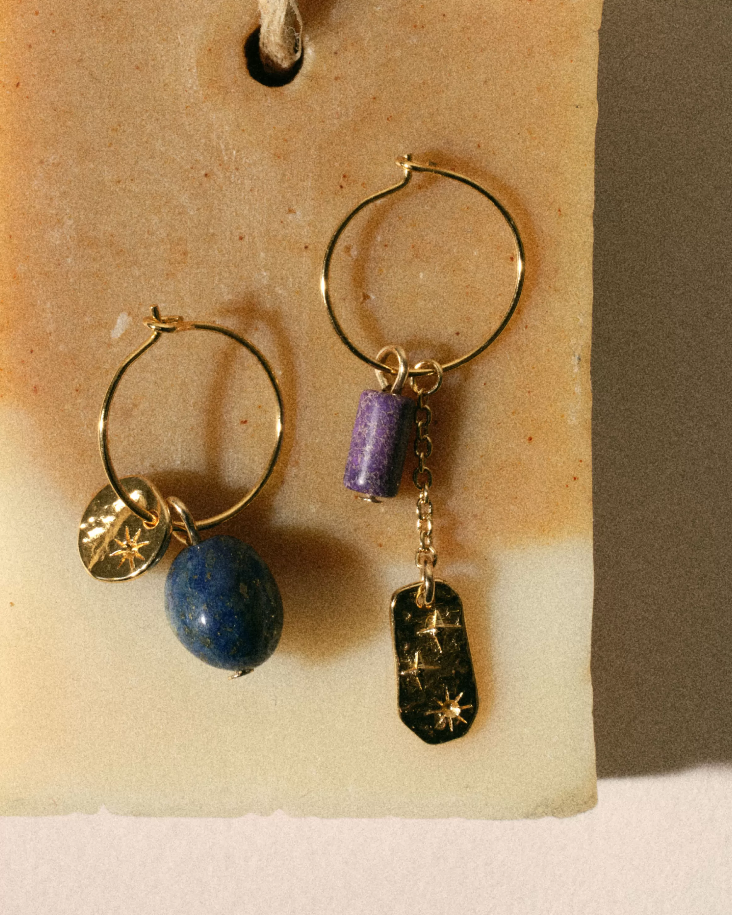 Fines créoles avec pampilles et pierres naturelles.Laiton doré à l’or fin 18 Carats 0,2 Micron.Bijou livré dans son…