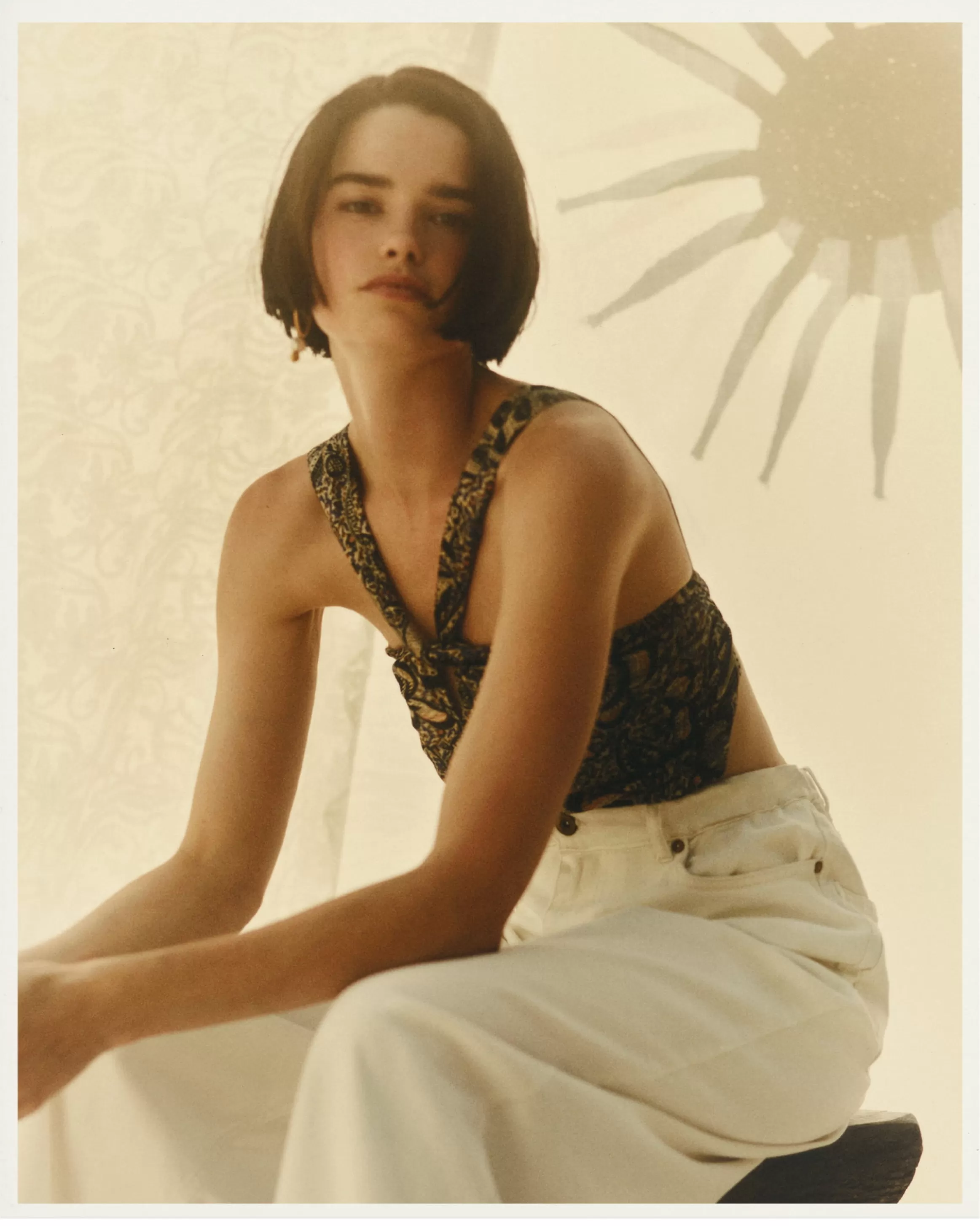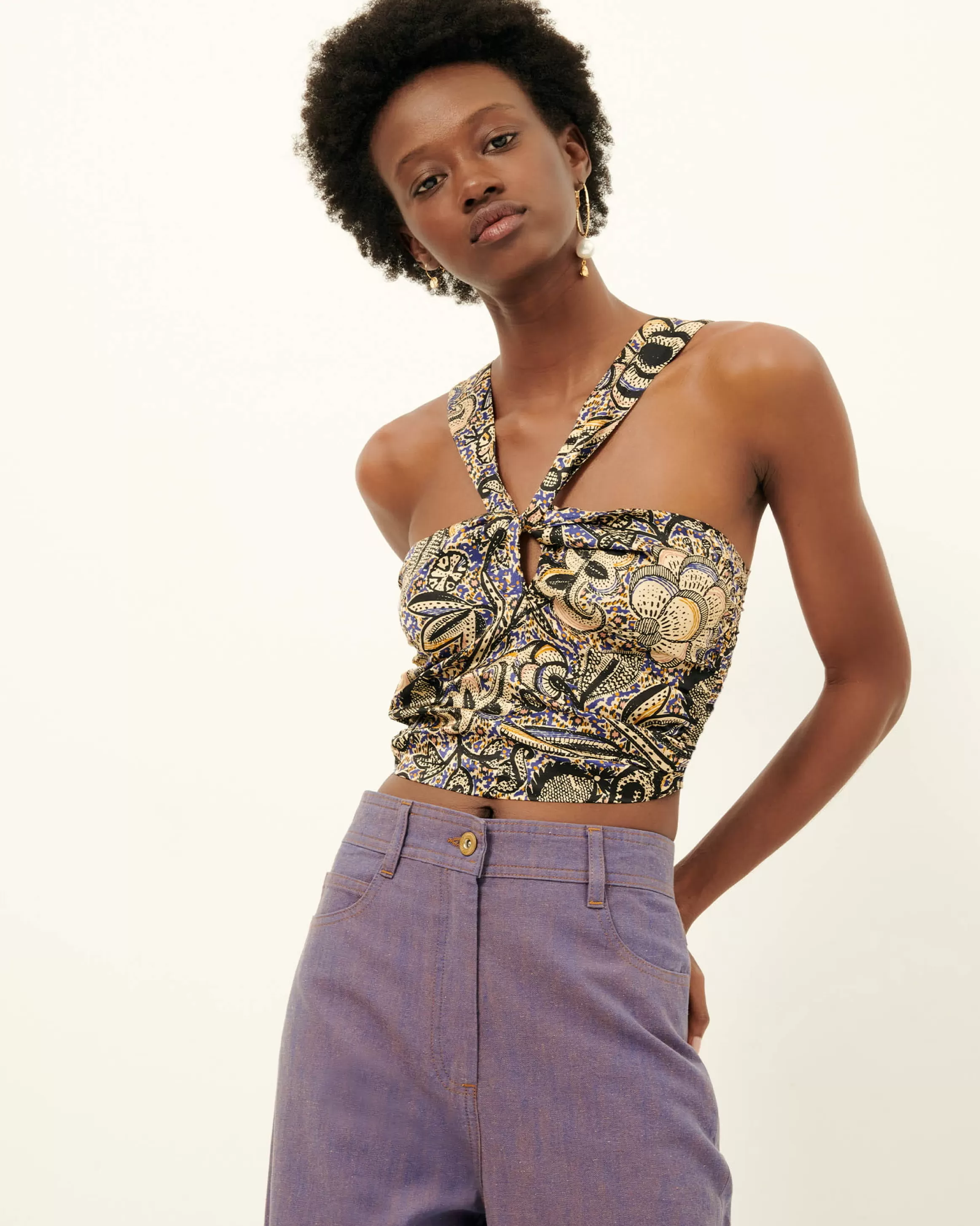 Top court esprit foulard en satin de viscose / soie fluide imprimé apprêté en Italie, motif exclusif Sessùn.