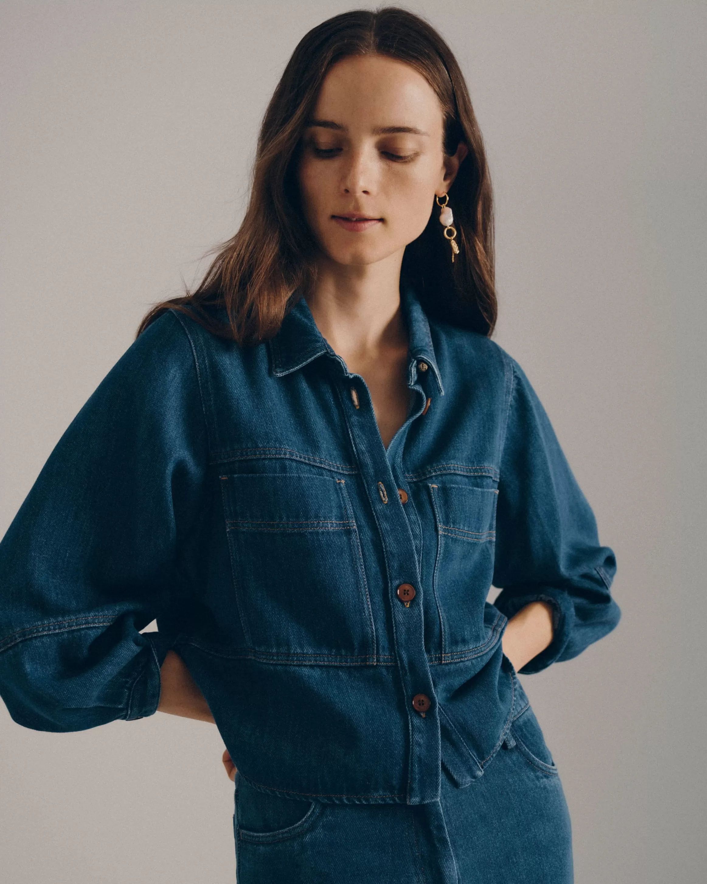 Surchemise à manches ballon en denim fluide stonewashé, tissée en Espagne.