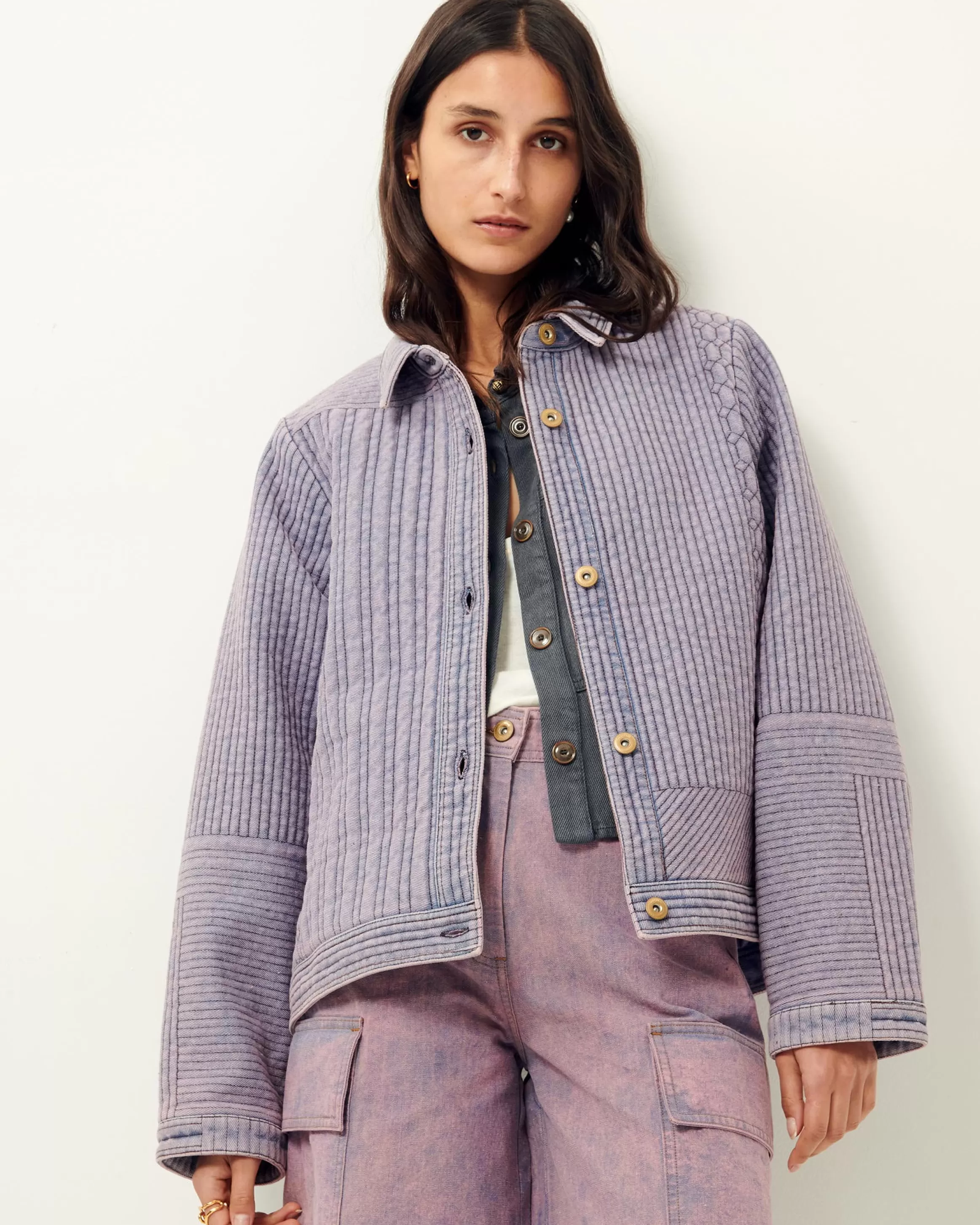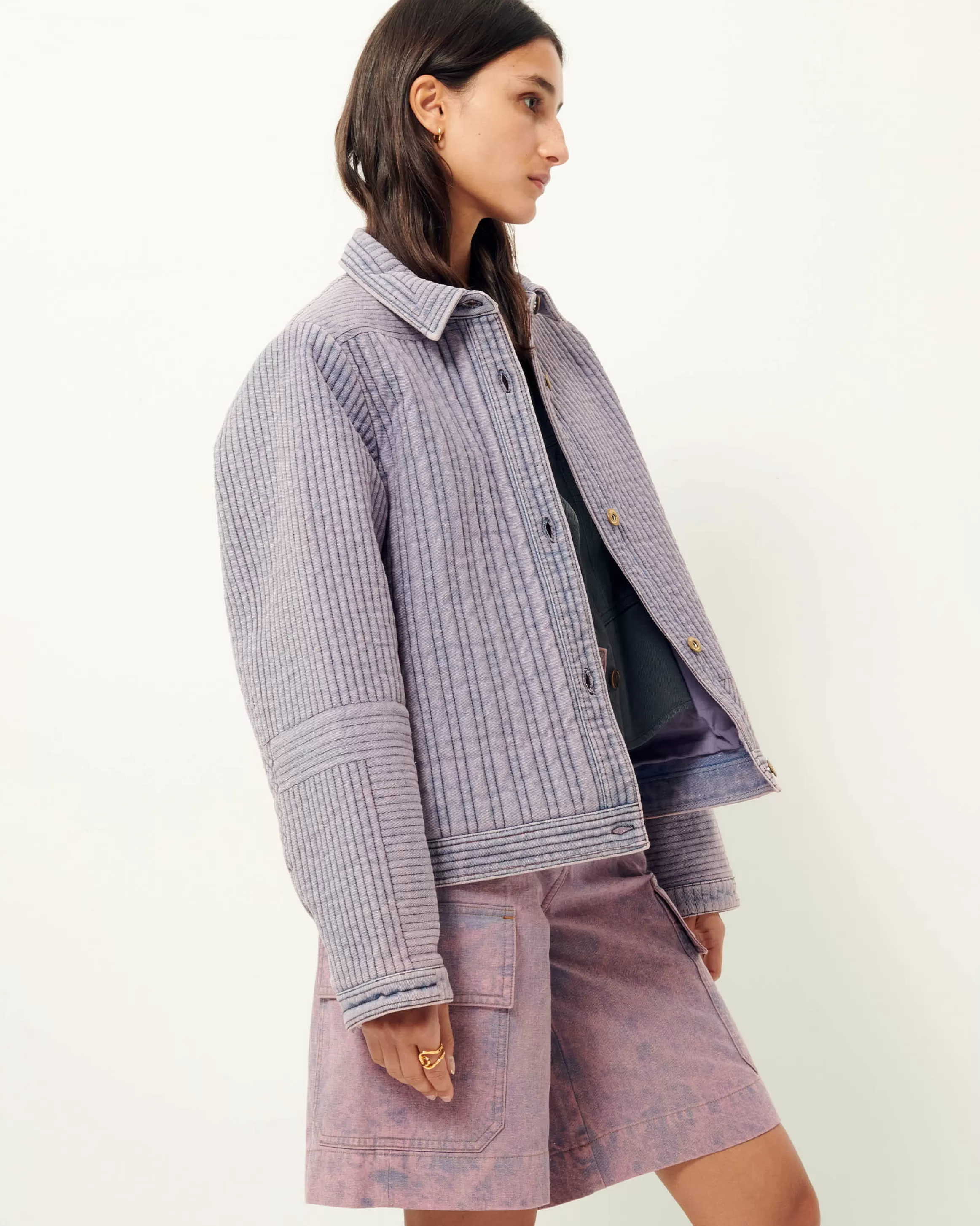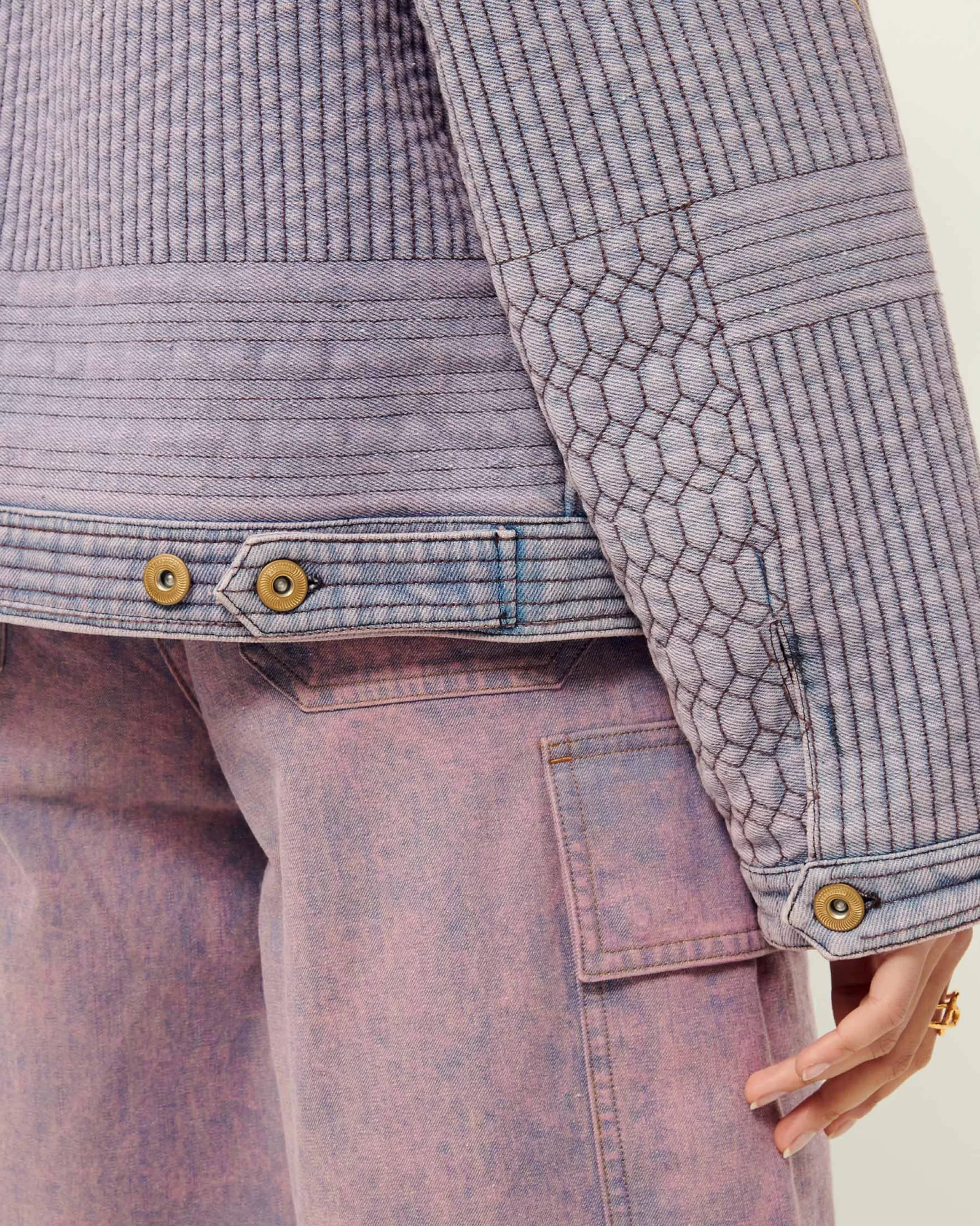 Blouson en denim stonewashé et surteint, surpiqûres fantaisie, matelassage esprit patchwork de boutis, motifs exclusif…