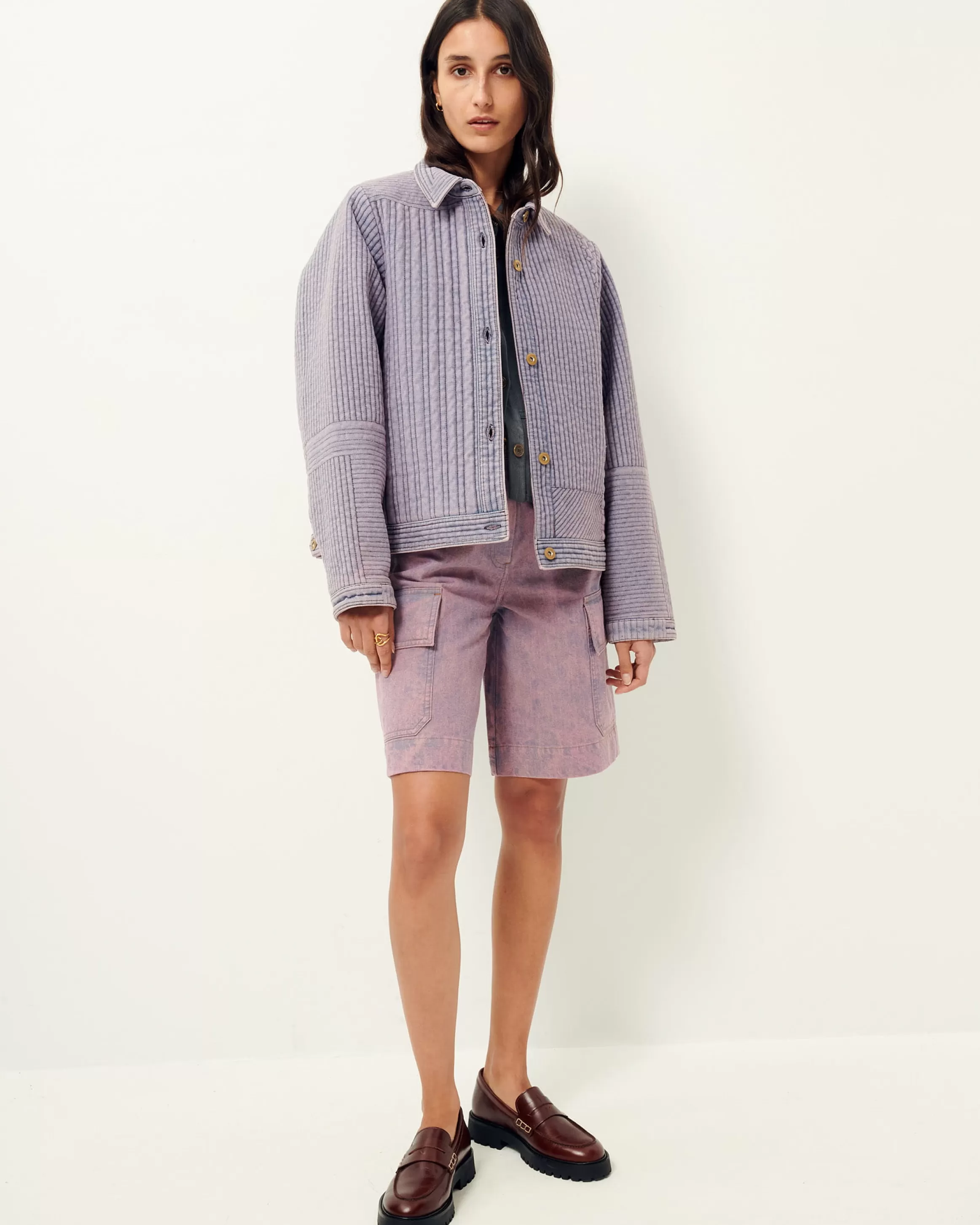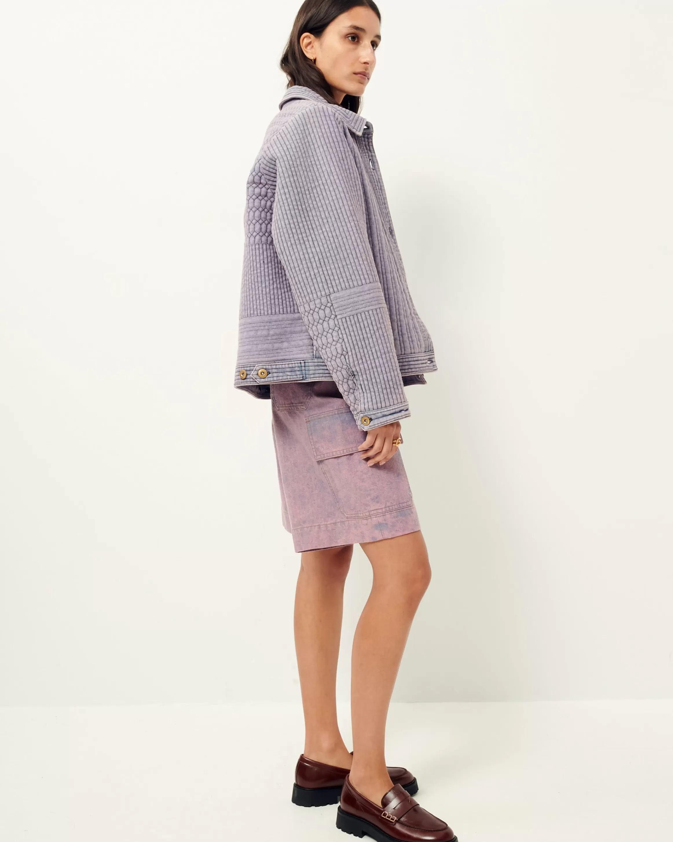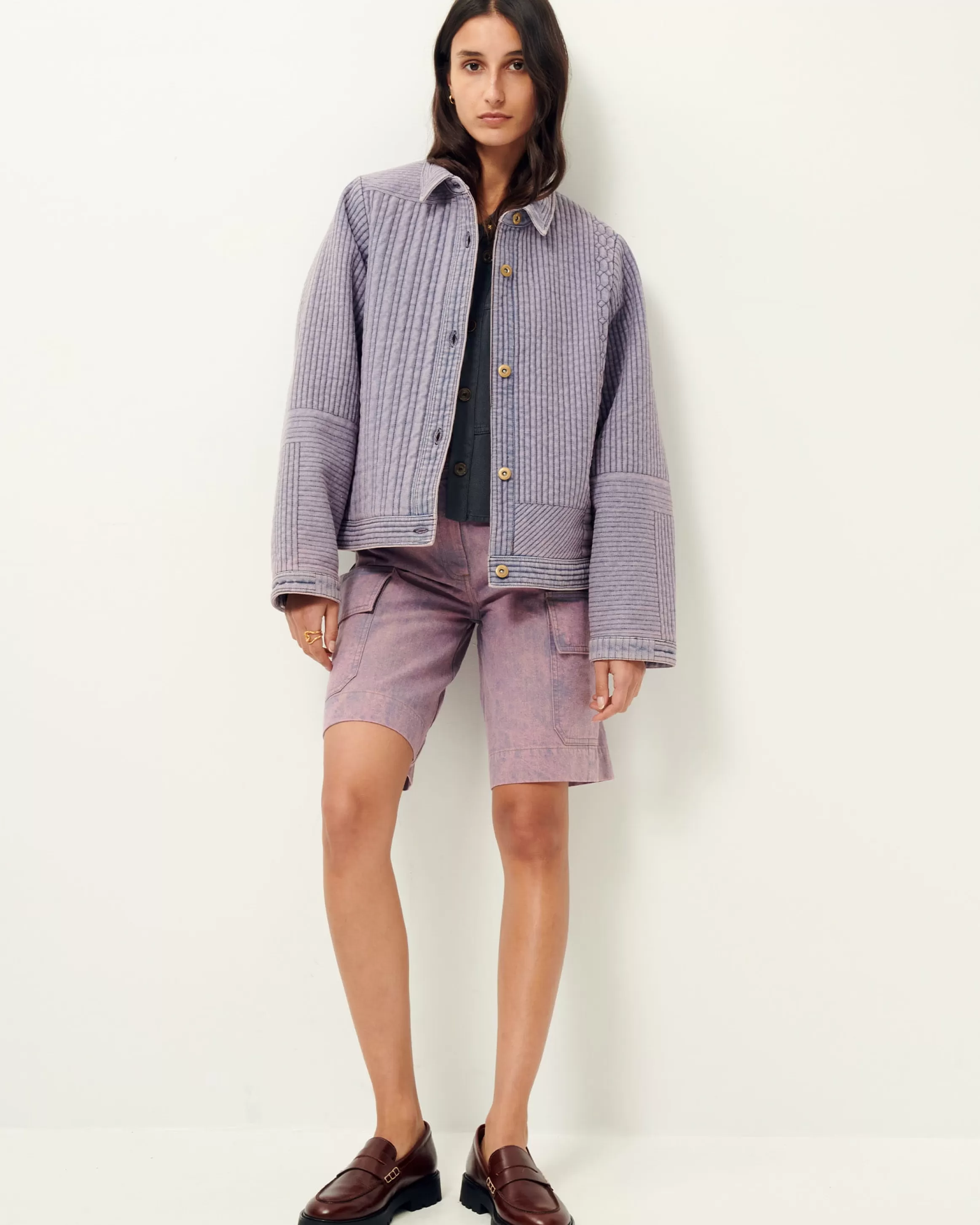 Blouson en denim stonewashé et surteint, surpiqûres fantaisie, matelassage esprit patchwork de boutis, motifs exclusif…