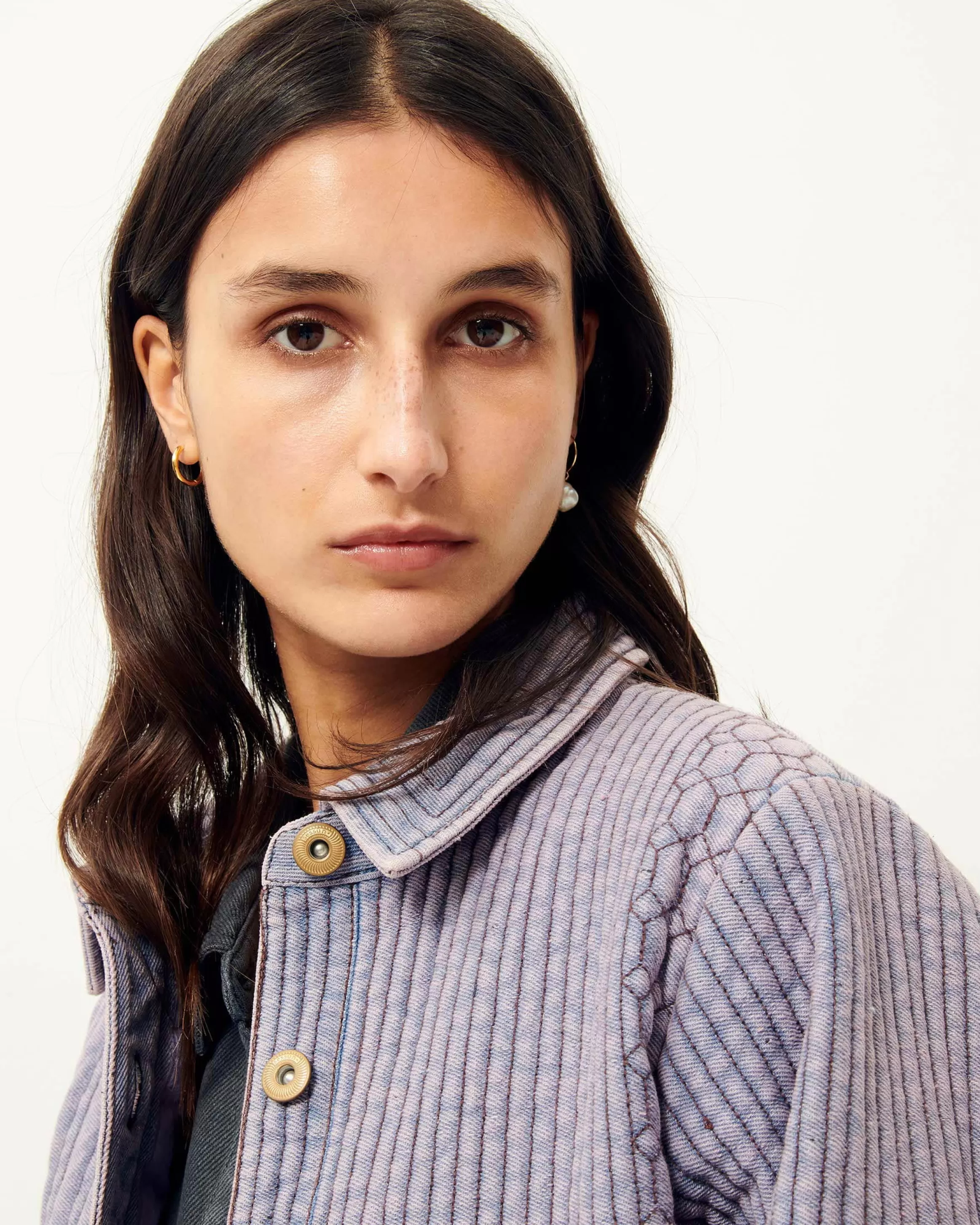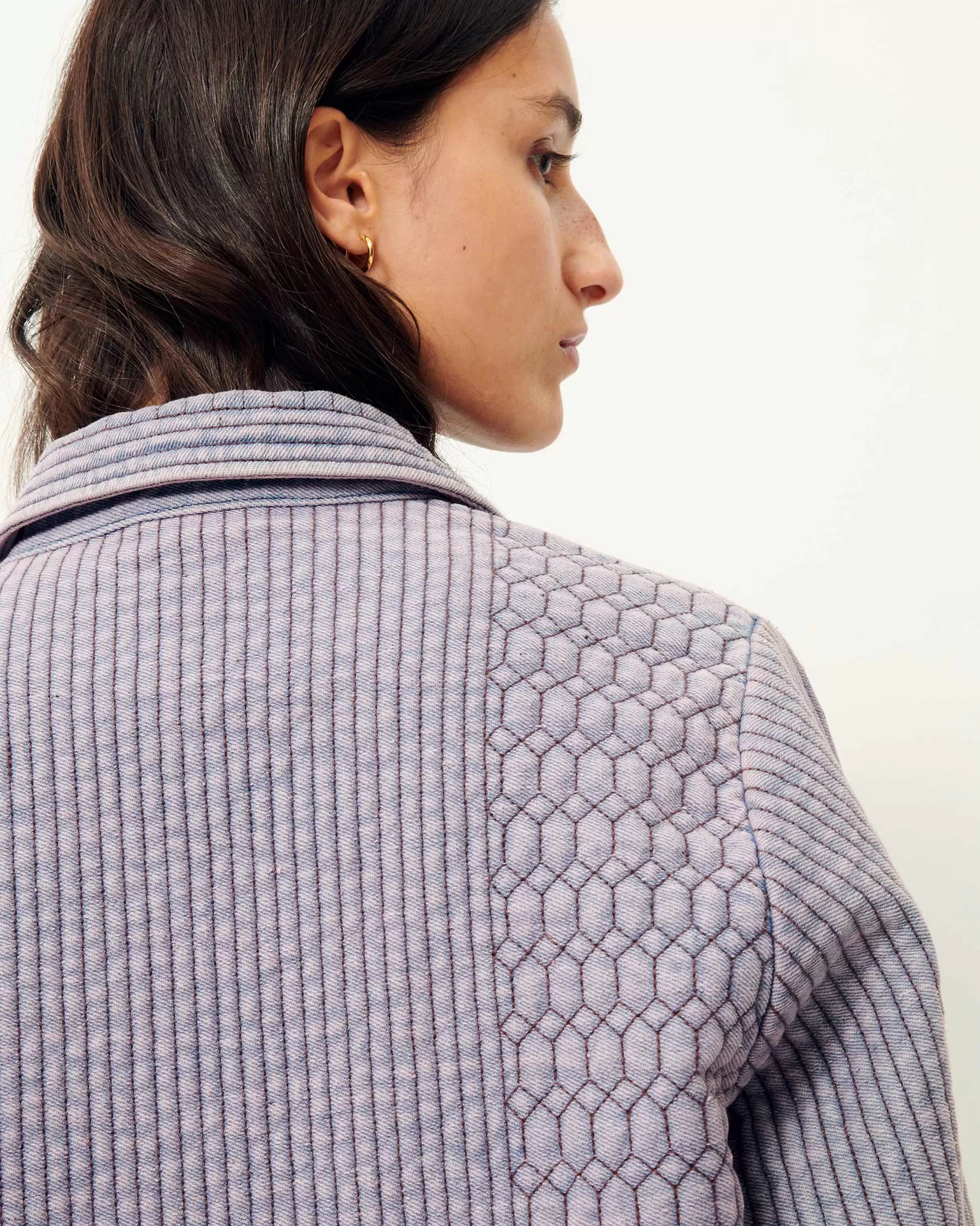 Blouson en denim stonewashé et surteint, surpiqûres fantaisie, matelassage esprit patchwork de boutis, motifs exclusif Sessùn .
