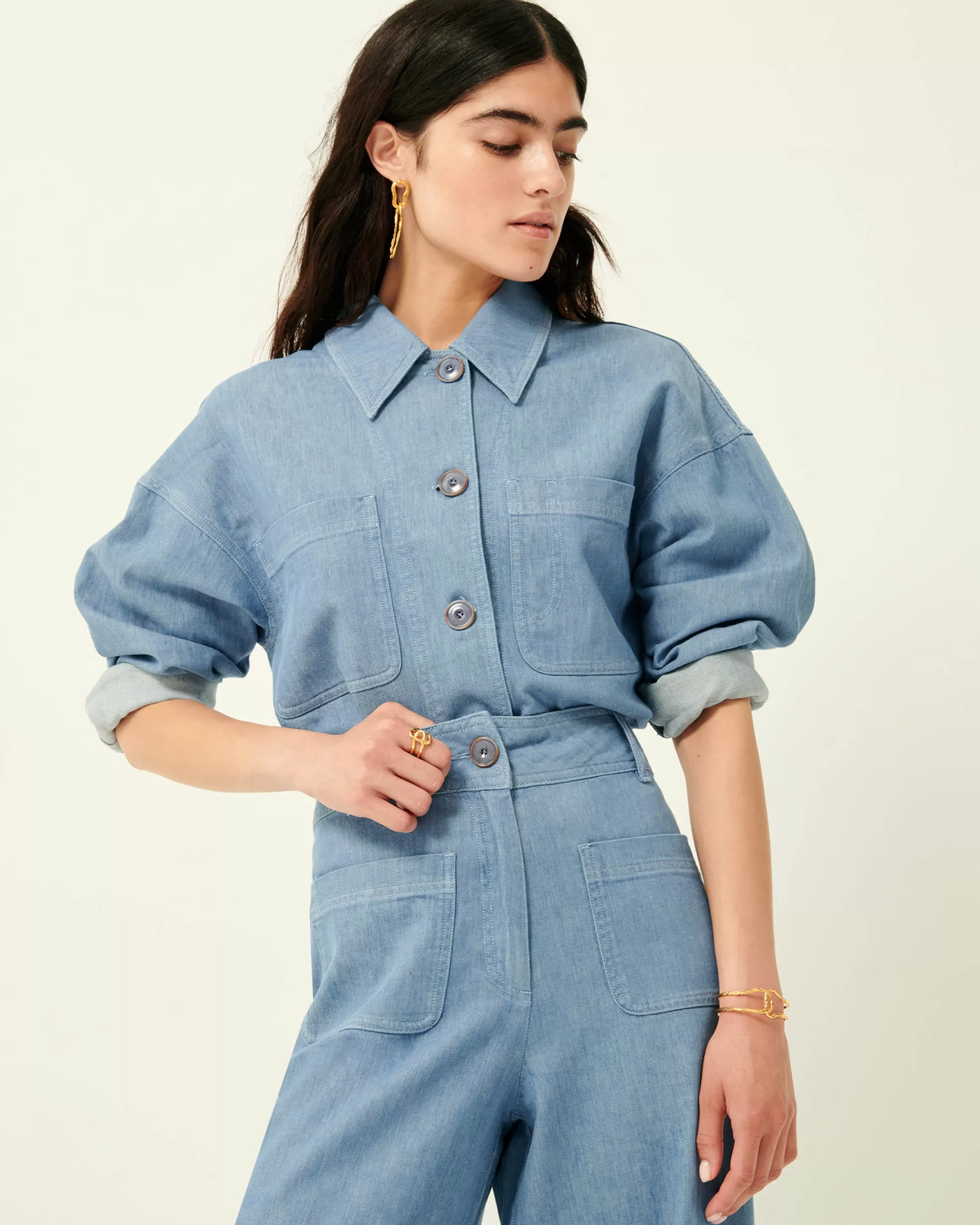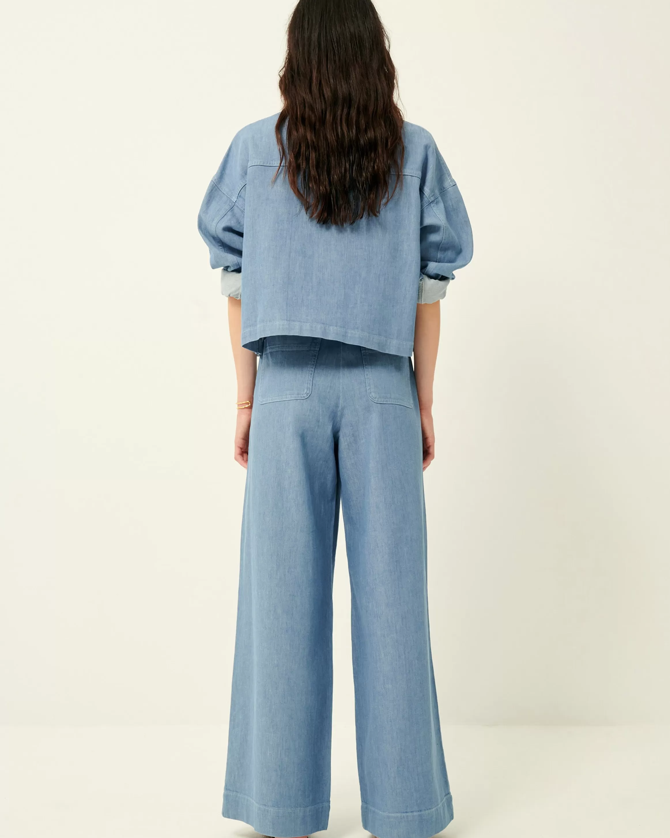 Pantalon évasé taille haute en sergé chambray de coton / lin tissé en Espagne.