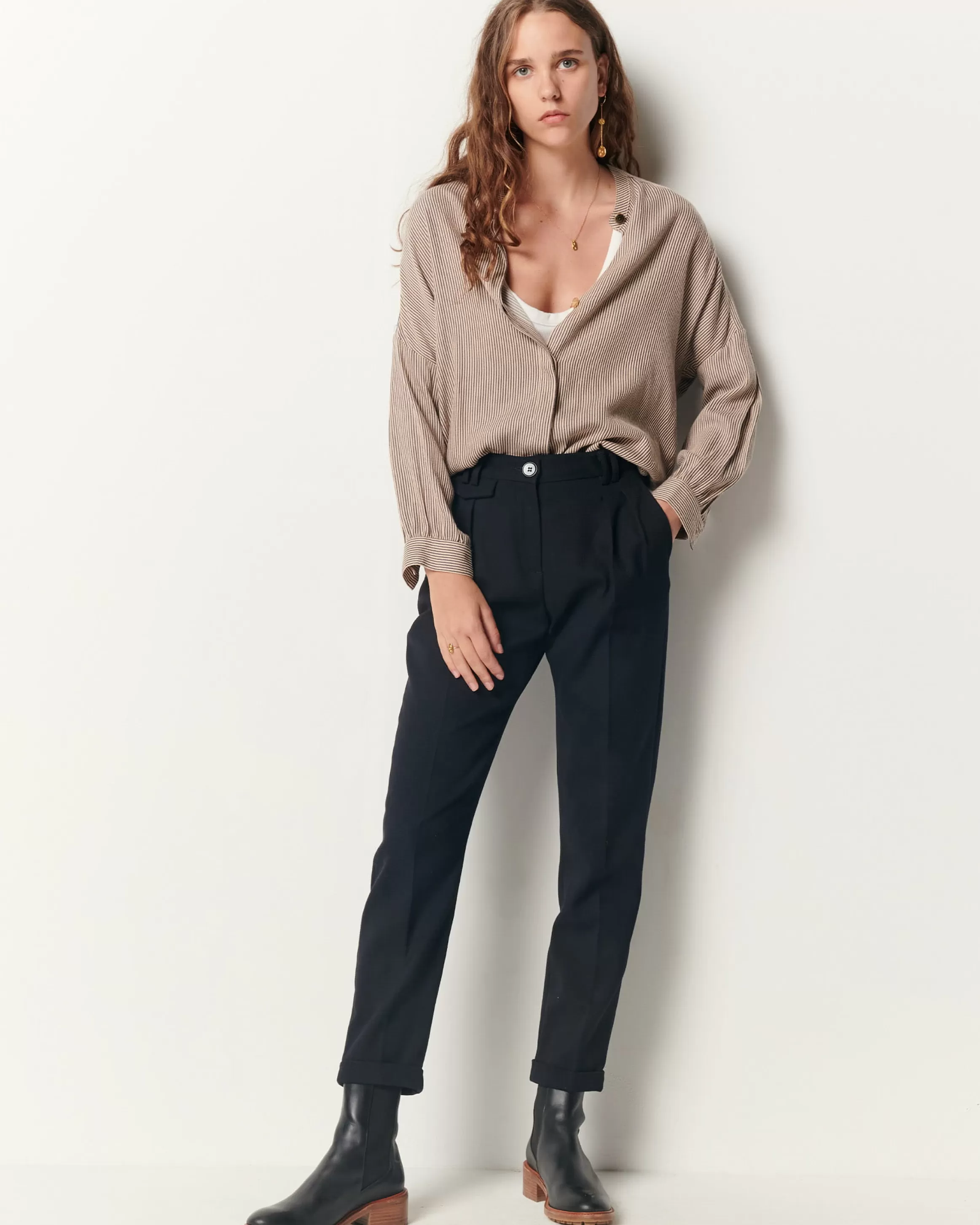 Fermeture par un bouton à la ceinture et boutons cachés.