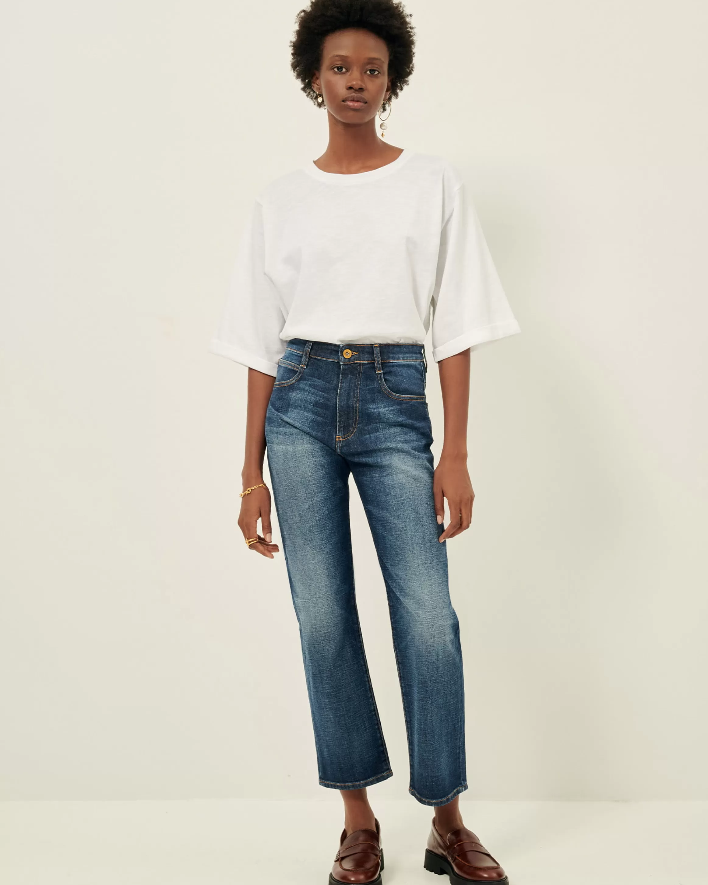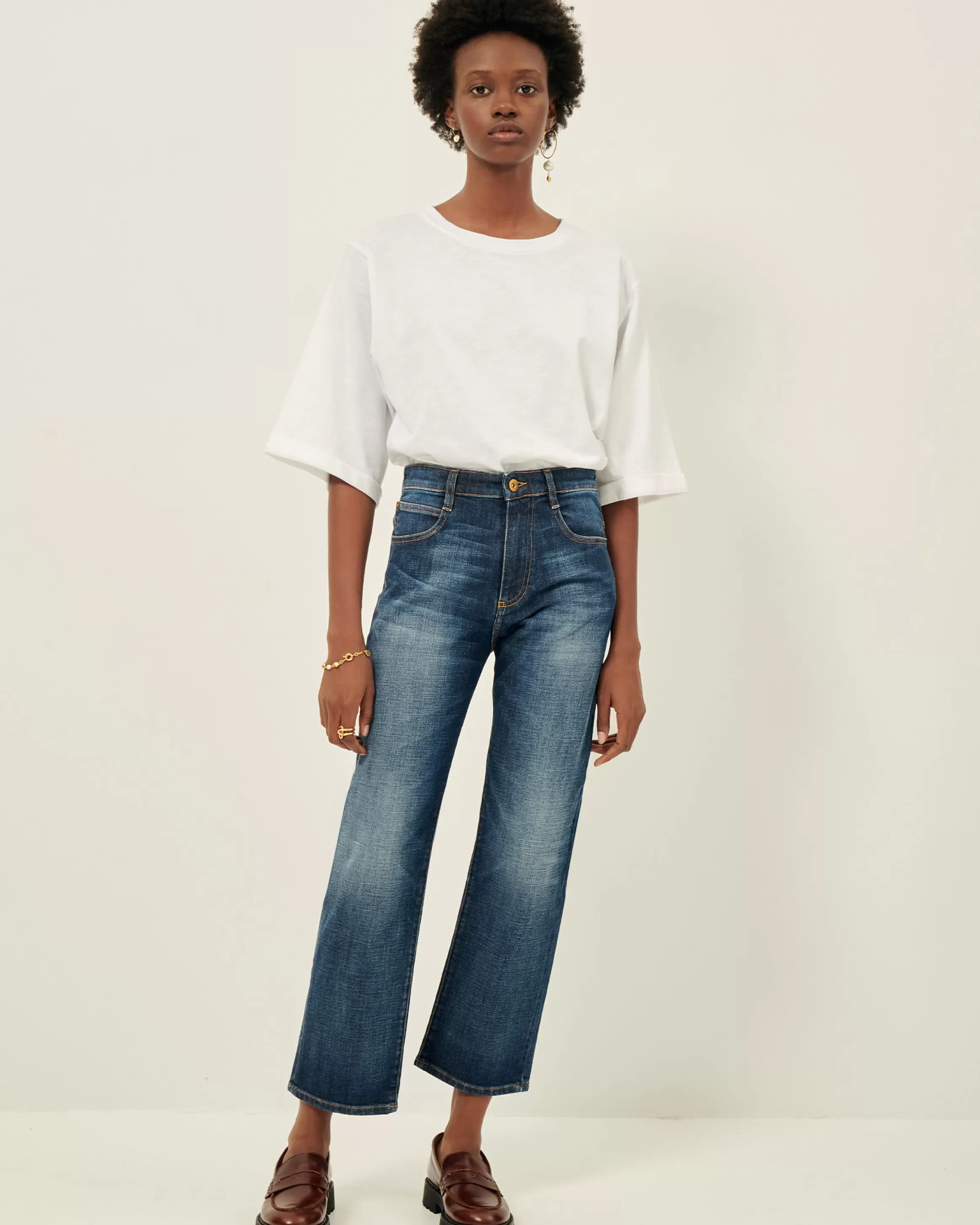 Jean droit en denim délavé.