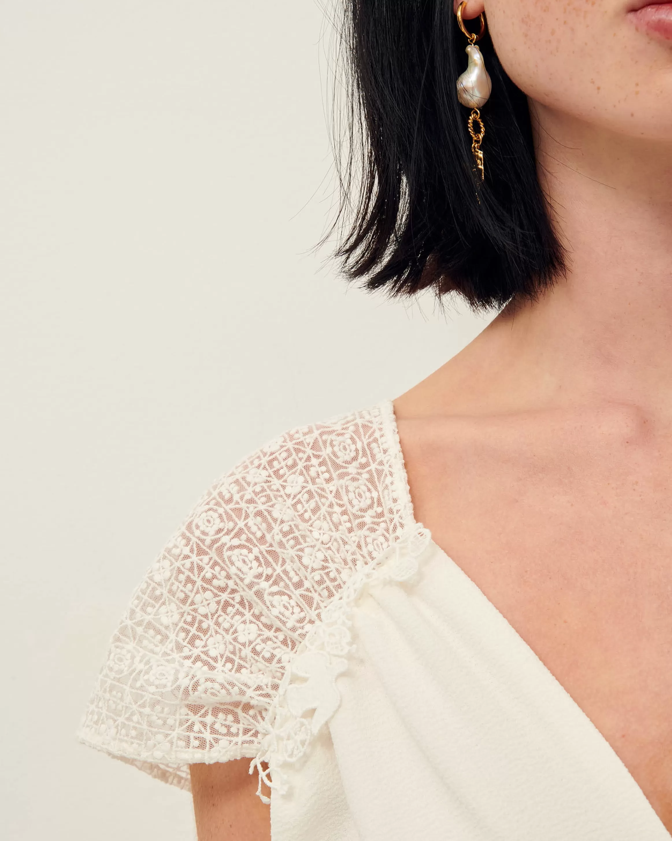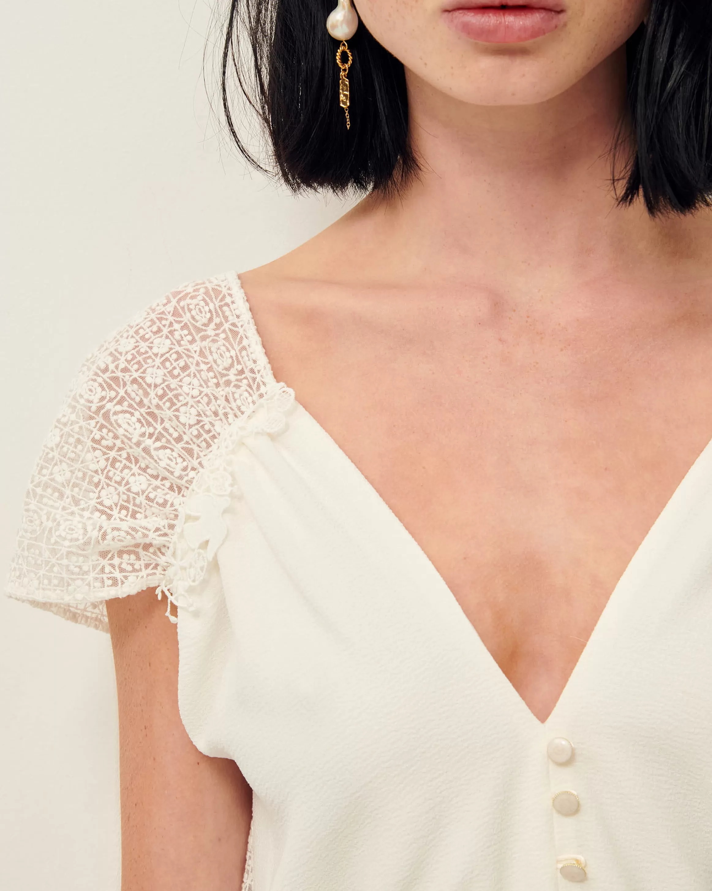 Robe courte en crêpe.Ilona mesure 1m75 et porte du S.Grand décolleté devant et dos.Galons dentelle fantaisie épaules…