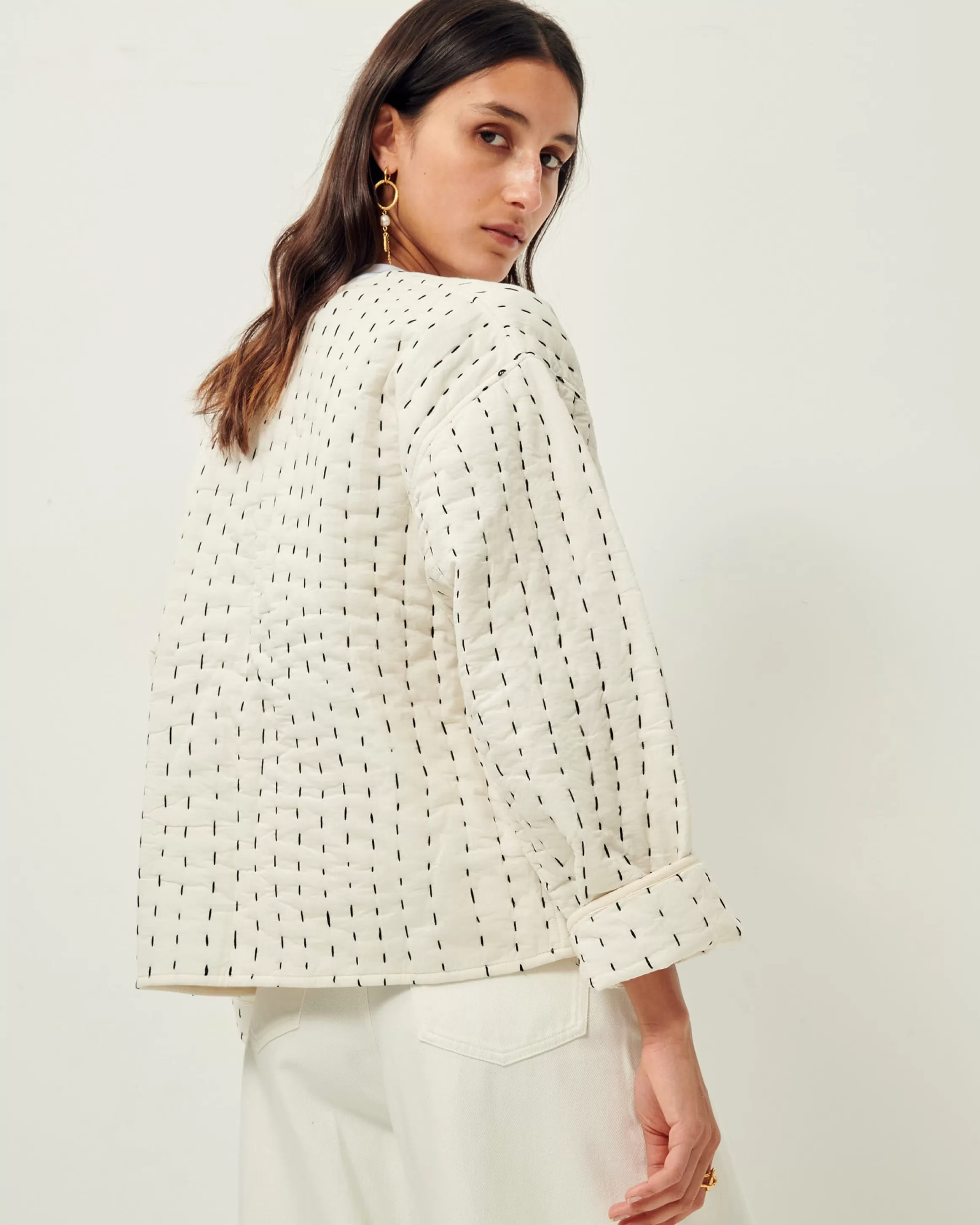 Veste ronde sans col en voile de coton matelassé teint en plongée, surpiqûres contrastées esprit boutis réalisées …