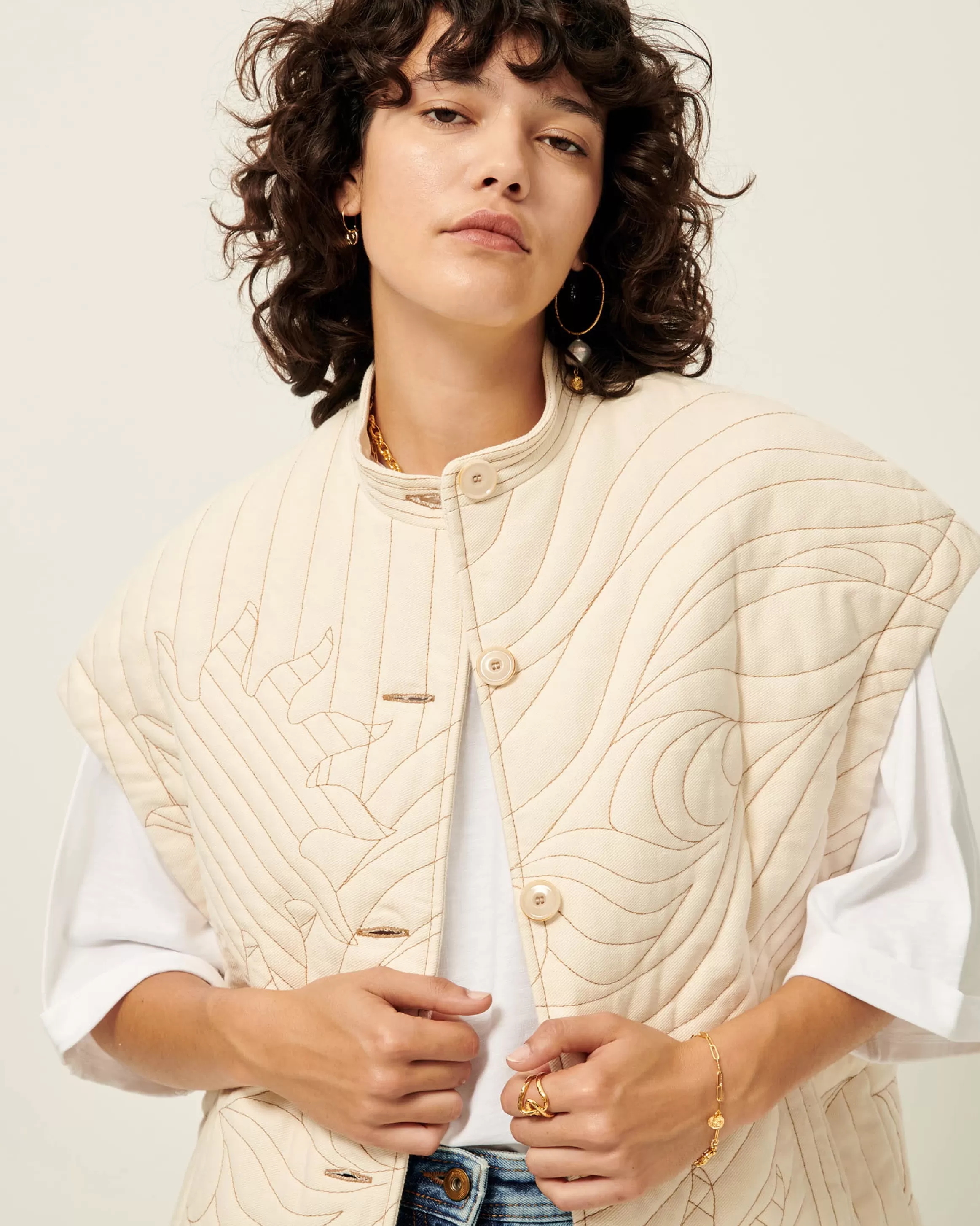 Veste oversize sans manche en toile de denim surpiquée et matelassée, illustration exclusive Sessùn.