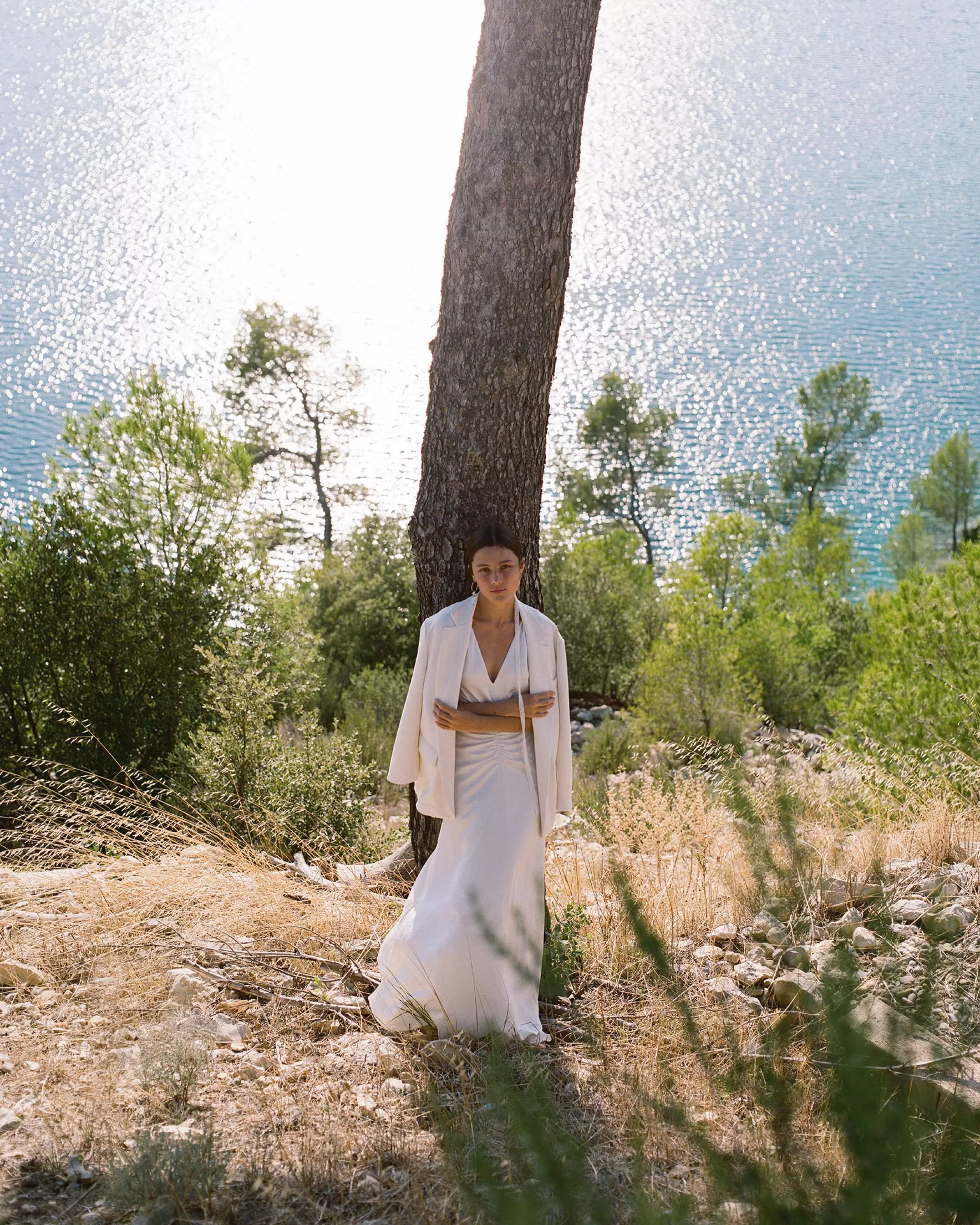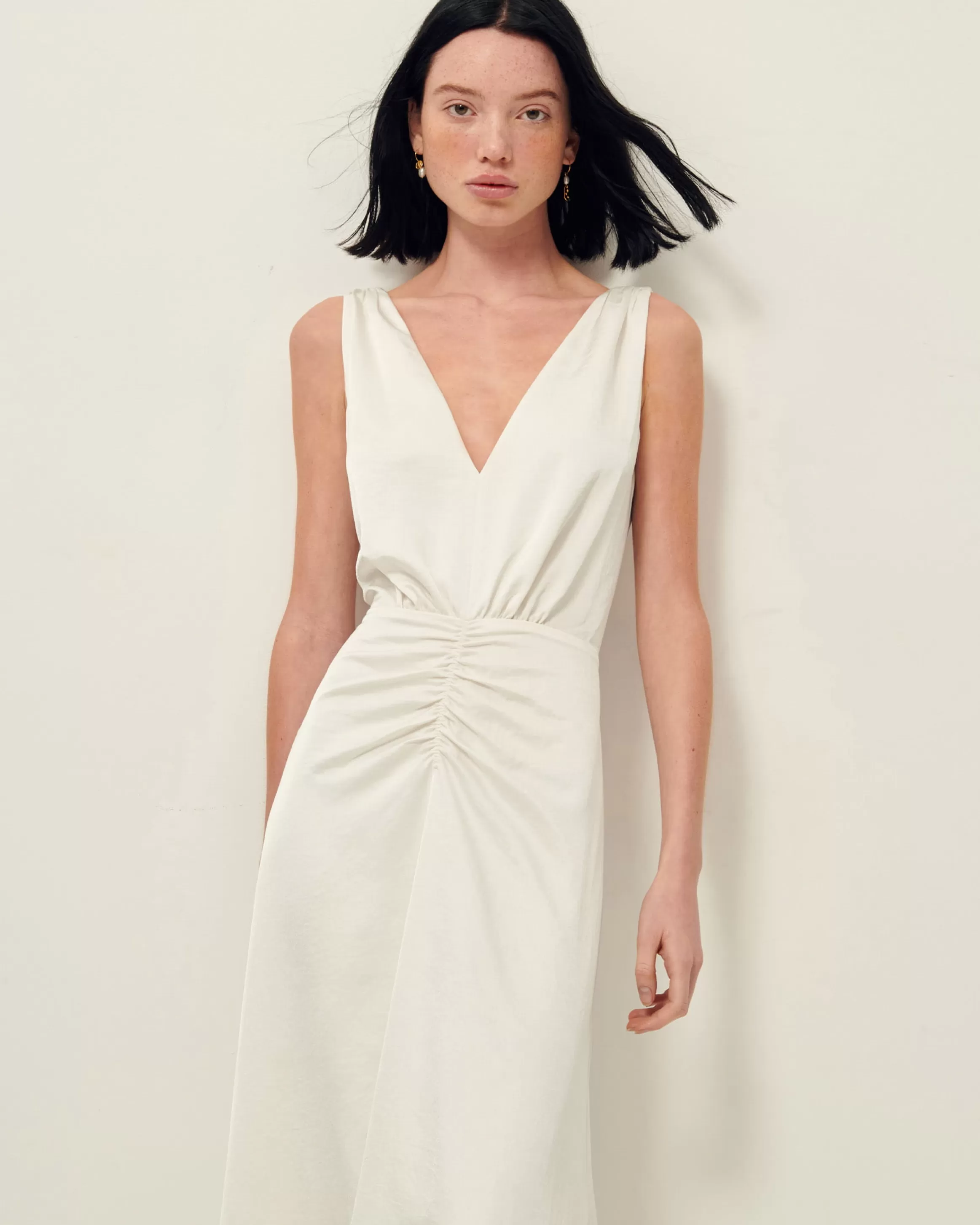 Robe longue fourreau en satin.Ilona mesure 1m75 et porte du S.Décolleté en V devant et dos. Fermeture à glissière in…