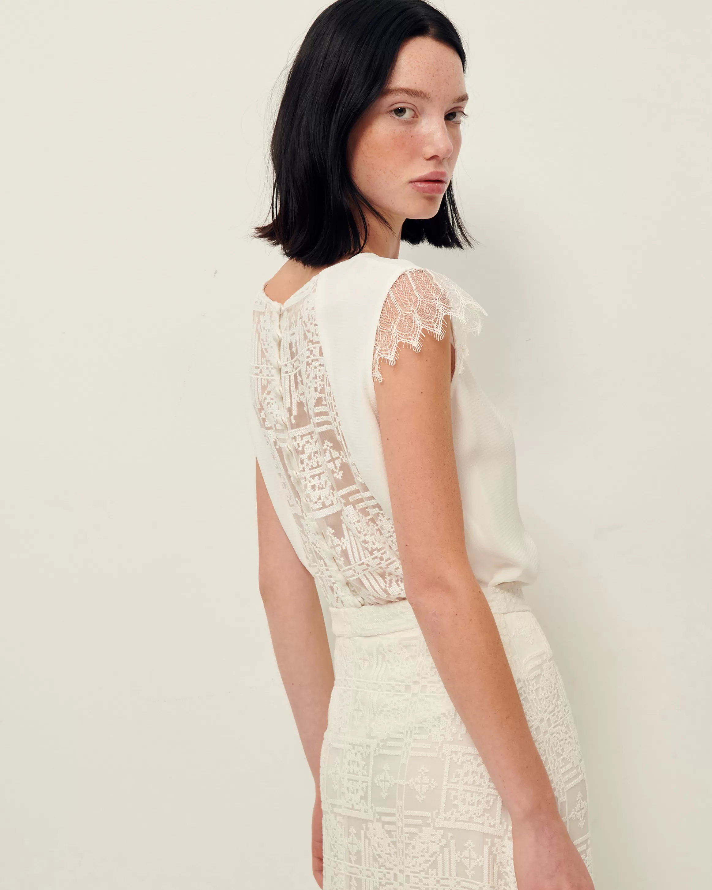 Top en crêpe. Izadora mesure 1m75 et porte du 36.Galons dentelle fantaisie sur les épaules. Empiècement dentelle au …