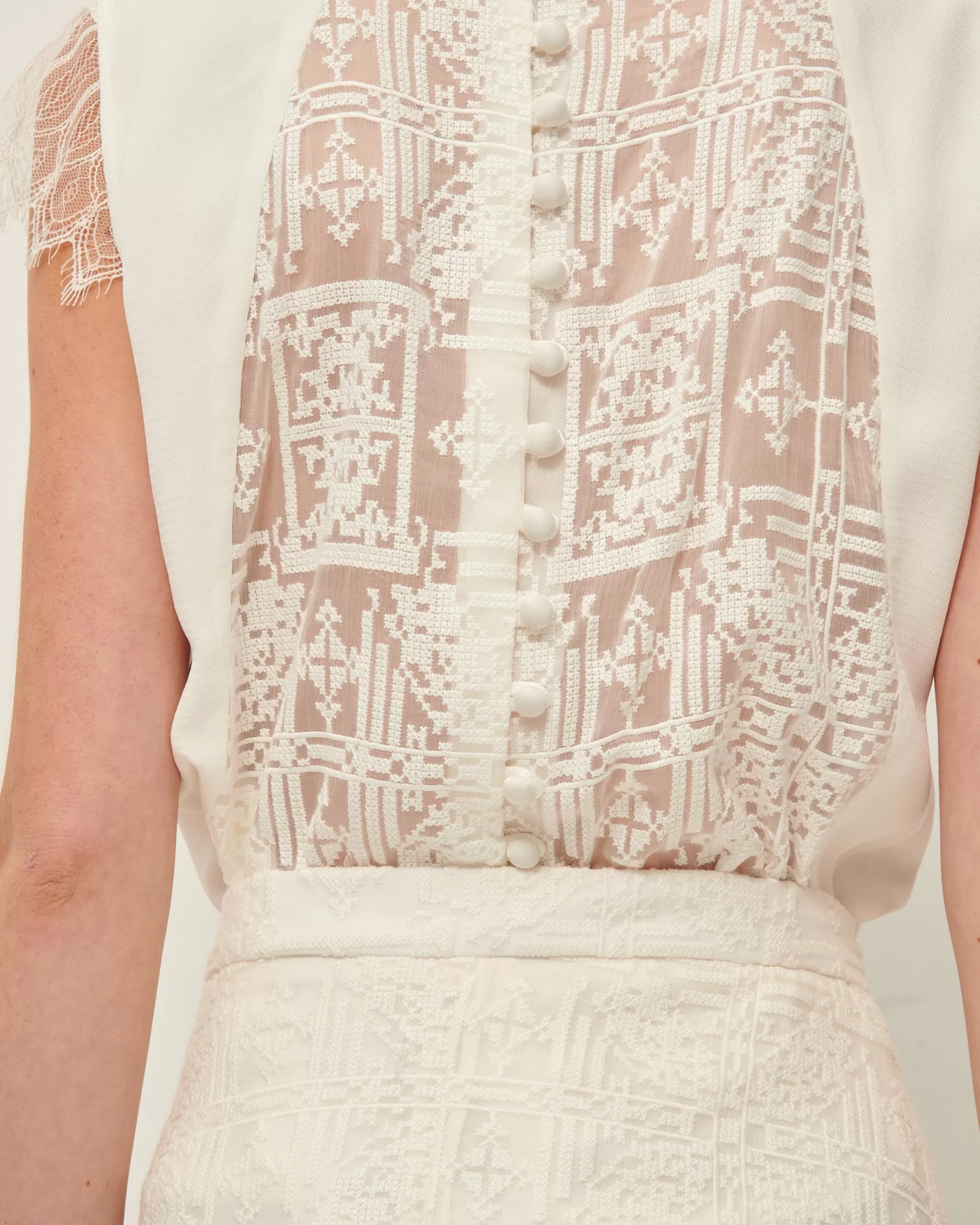 Empiècement dentelle au dos et boutons recouverts dans la matière.