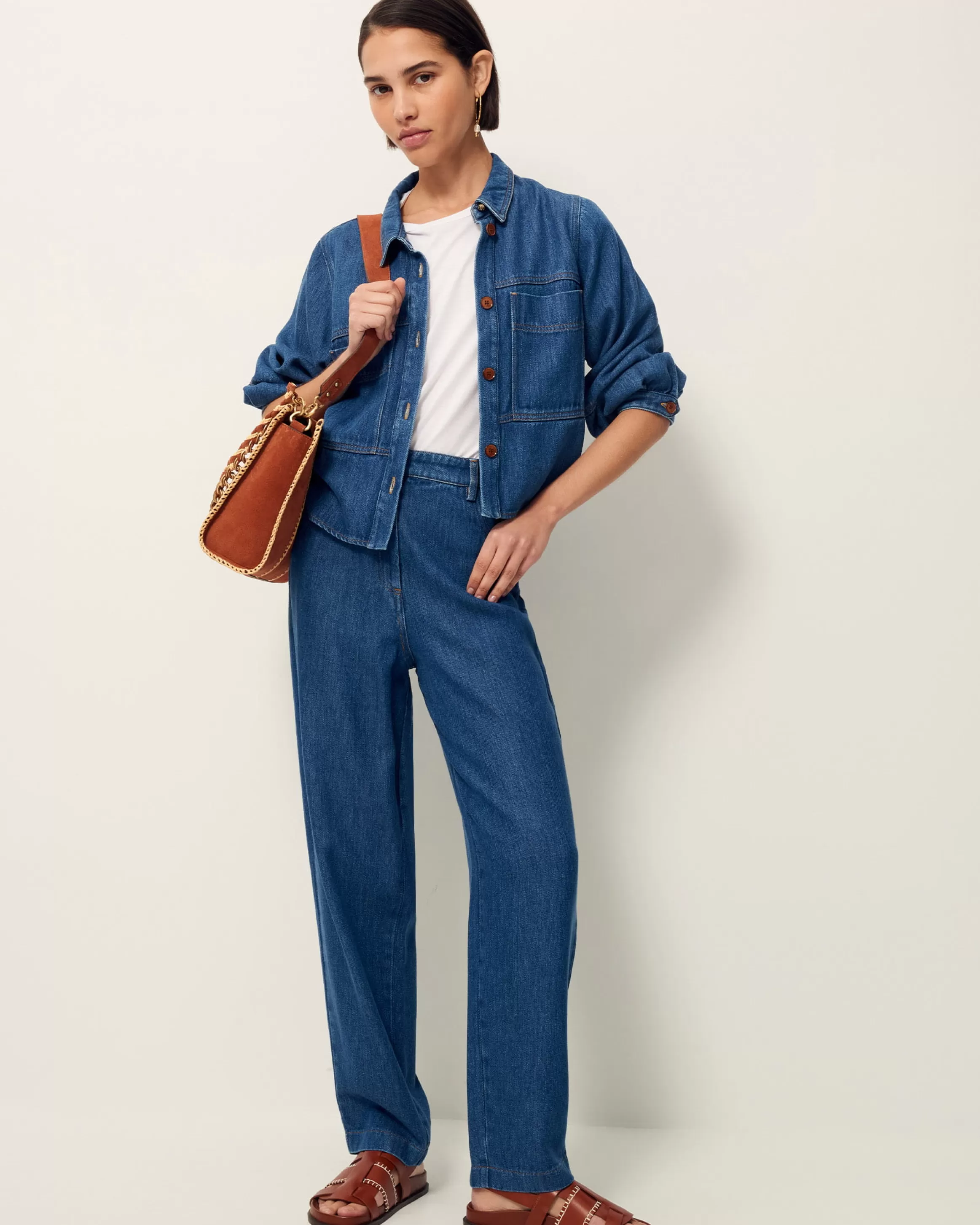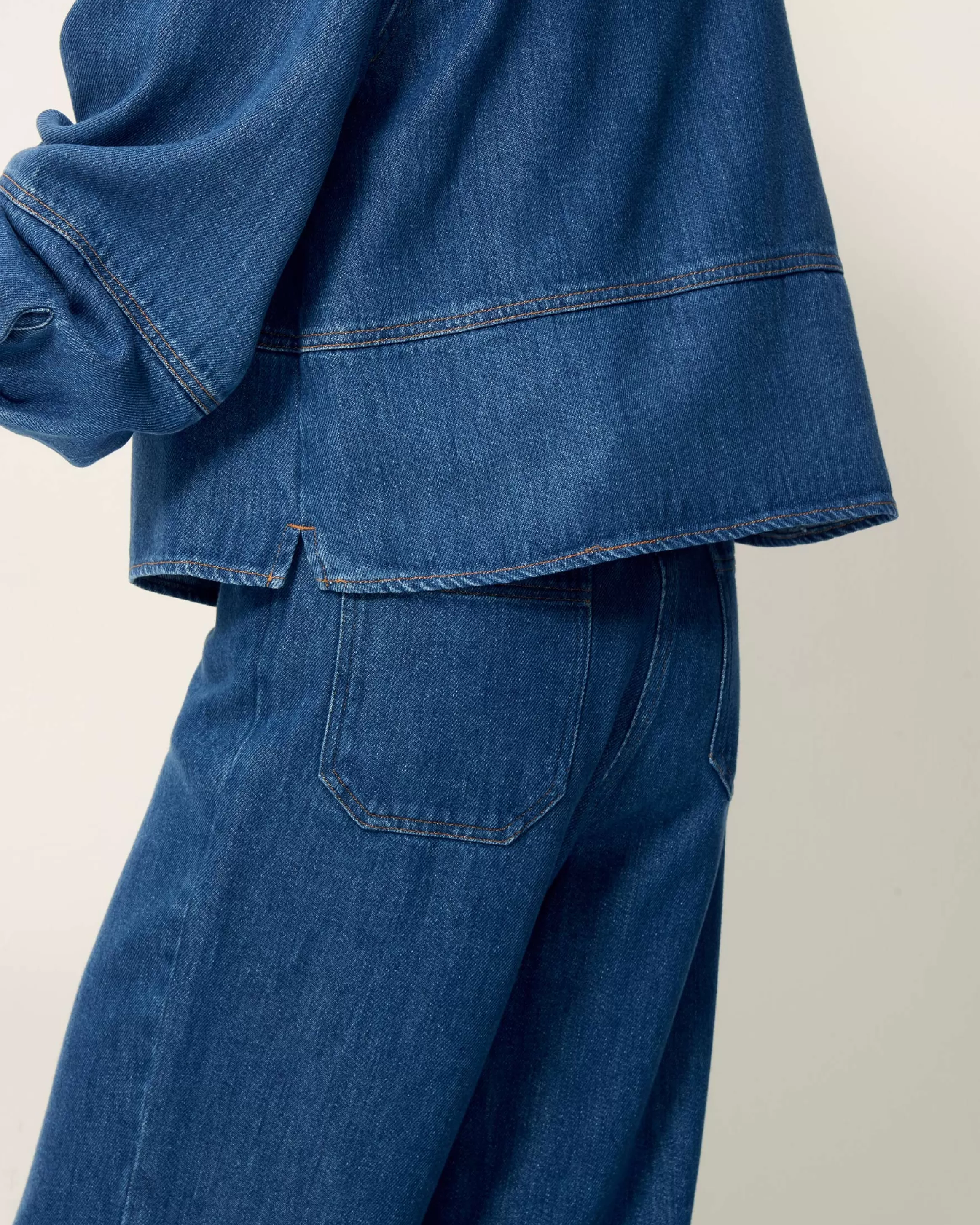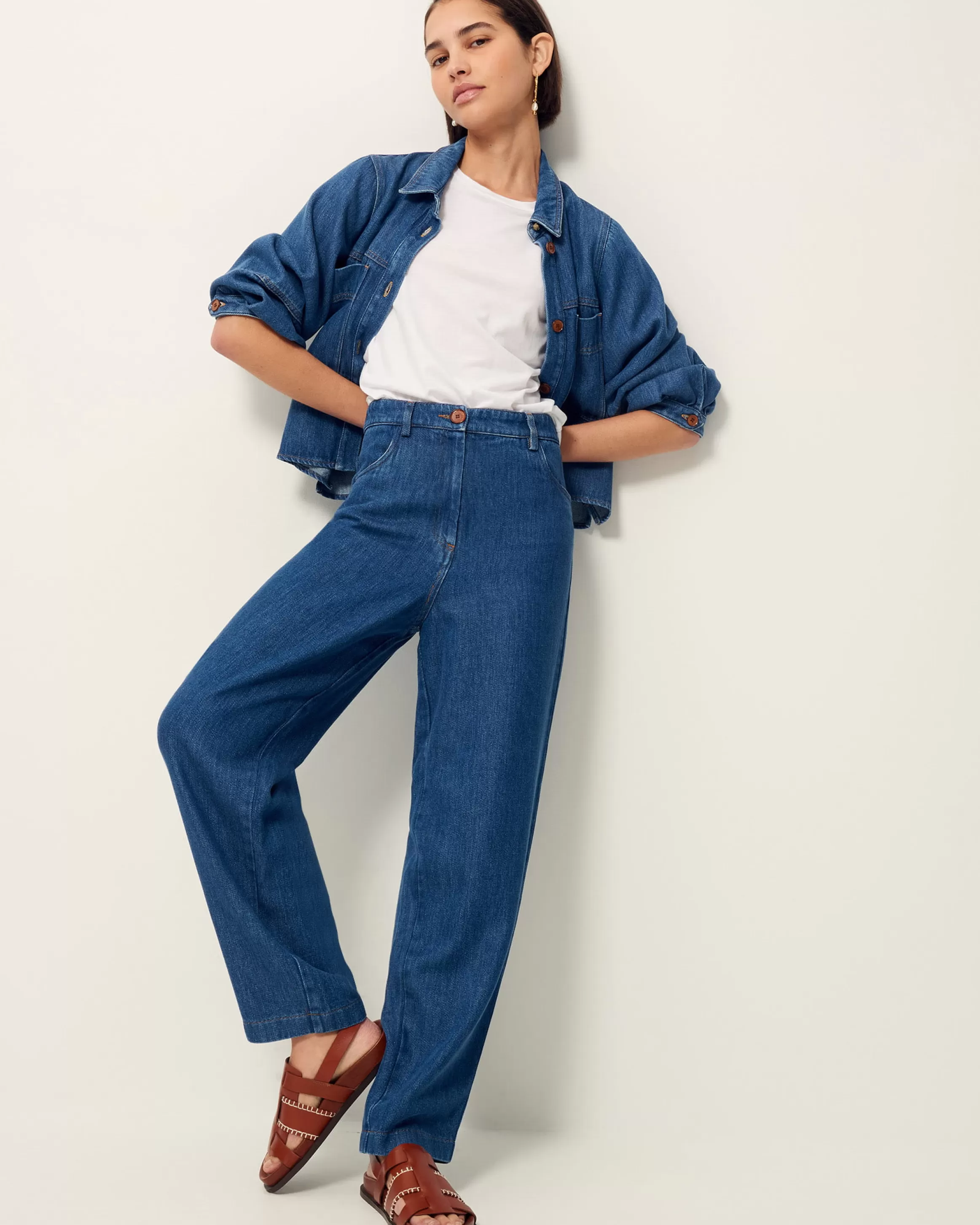 Pantalon taille haute en denim fluide stonewashé tissé en Espagne.